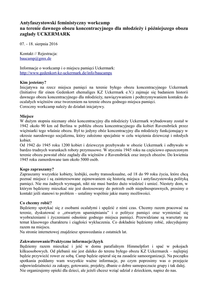 Antyfaszystowski feministyczny workcamp na terenie dawnego obozu koncentracyjnego dla młodzieży i późniejszego obozu zagłady UCKERMARK 07. - 18. sierpnia 2016 Kontakt // Rejestracja: [email protected] Informacje o workcamp i o miejscu pamięci Uckermark: http://www.gedenkort-kz-uckermark.de/info/baucamps Kim jesteśmy? Inicjatywa na rzecz miejsca pamięci na terenie byłego obozu koncentracyjnego Uckermark (Initiative für einen Gedenkort ehemaliges KZ Uckermark e.V.) zajmuje się badaniem historii dawnego obozu koncentracyjnego dla młodzieży, nawiązywaniem i podtrzymywaniem kontaktu do ocalałych więźniów oraz tworzeniem na terenie obozu godnego miejsca pamięci. Coroczny workcamp należy do działań inicjatywy. Miejsce W dużym stopniu nieznany obóz koncentracyjny dla młodzieży Uckermark wybudowany został w 1942 około 90 km od Berlina w pobliżu obozu koncentracyjnego dla kobiet Ravensbrück przez więźniarki tego właśnie obozu. Był to jedyny obóz koncentracyjny dla młodzieży funkcjonujący w okresie narodowego socjalizmu, który założono specjalnie w celu więzienia dziewcząt i młodych kobiet. Od 1942 do 1945 roku 1200 kobiet i dziewczyn przebywało w obozie Uckermark i odbywało w bardzo trudnych warunkach roboty przymusowe. W styczniu 1945 roku na częściowo opuszczonym terenie obozu powstał obóz zagłady dla więźniów z Ravensbrück oraz innych obozów. Do kwietnia 1945 roku zamordowane tam około 5000 osób. Kogo zapraszamy? Zapraszamy wszystkie kobiety, lesbijki, osoby transseksualne, od 18 do 99 roku życia, które chcą poznać miejsce i są zainteresowane zajmowaniem się historią miejsca i antyfaszystowską polityką pamięci. Nie ma żadnych wymagań, nikt nie musi bardzo dużo wiedzieć i umieć. Niestety dom, w którym będziemy mieszkać nie jest dostosowany do potrzeb osób niepełnosprawnych, prosimy o kontakt jeśli stanowi to problem – ustalimy wspólnie jakie mamy możliwości. Co chcemy robić? Będziemy spotykać się z osobami ocalałymi i spędzić z nimi czas. Chcemy razem pracować na terenie, dyskutować o „otwartym upamiętnianiu” i o polityce pamięci oraz wymieniać się wyobrażeniami i życzeniami odnośnie godnego miejsca pamięci. Przewidziane są warsztaty na temat klasowego charakteru i ciągłości wykluczenia. Co dokładnie będziemy robić, zdecydujemy razem na miejscu. Na stronie internetowej znajdziesz sprawozdania z ostatnich lat. Zakwaterowanie/Praktyczne informacje/Język Będziemy razem mieszkać i jeść w domu parafialnym Himmelpfort i spać w pokojach kilkuosobowych. Od plebanii nie jest daleko do terenu byłego obozu KZ Uckermarck – najlepiej będzie przywieźć rower ze sobą. Camp będzie opierał się na zasadzie samoorganizacji. Na początku spotkania poddamy wam wszystkie ważne informacje, po czym poprosimy was o przejęcie odpowiedzialności za zakupy, gotowanie, projekty, dbanie o dobre samopoczucie grupy i tak dalej. Nie organizujemy opieki dla dzieci, ale jeżeli chcesz wziąć udział z dzieckiem, napisz do nas. Prosimy o podanie przy zapisach w jakich językach mówicie, żebyśmy mogli zorganizować ewentualne tłumaczenie. Koszty i zapisy Liczimy się z wydatkami wynoszącymi około 100 EUR na osobę. Każda/y daje ile może. Jeśli jesteś zainteresowana/y, prosimy o zapisy do końca czerwca 2016 roku. Cieszymy się z Twójego udziału!