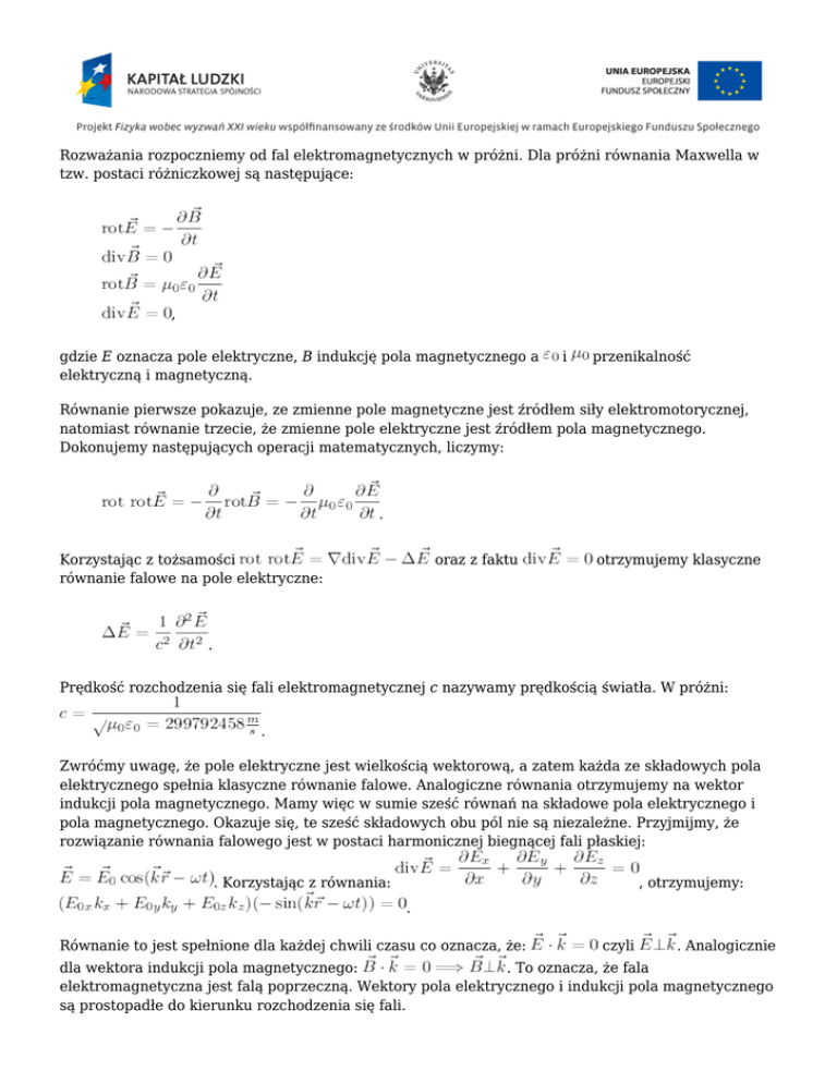 Rozważania rozpoczniemy od fal elektromagnetycznych w próżni. Dla próżni równania Maxwella w tzw. postaci różniczkowej są następujące: , gdzie E oznacza pole elektryczne, B indukcję pola magnetycznego a elektryczną i magnetyczną. i przenikalność Równanie pierwsze pokazuje, ze zmienne pole magnetyczne jest źródłem siły elektromotorycznej, natomiast równanie trzecie, że zmienne pole elektryczne jest źródłem pola magnetycznego. Dokonujemy następujących operacji matematycznych, liczymy: . Korzystając z tożsamości równanie falowe na pole elektryczne: oraz z faktu otrzymujemy klasyczne . Prędkość rozchodzenia się fali elektromagnetycznej c nazywamy prędkością światła. W próżni: . Zwróćmy uwagę, że pole elektryczne jest wielkością wektorową, a zatem każda ze składowych pola elektrycznego spełnia klasyczne równanie falowe. Analogiczne równania otrzymujemy na wektor indukcji pola magnetycznego. Mamy więc w sumie sześć równań na składowe pola elektrycznego i pola magnetycznego. Okazuje się, te sześć składowych obu pól nie są niezależne. Przyjmijmy, że rozwiązanie równania falowego jest w postaci harmonicznej biegnącej fali płaskiej: . Korzystając z równania: , otrzymujemy: . Równanie to jest spełnione dla każdej chwili czasu co oznacza, że: czyli . Analogicznie dla wektora indukcji pola magnetycznego: . To oznacza, że fala elektromagnetyczna jest falą poprzeczną. Wektory pola elektrycznego i indukcji pola magnetycznego są prostopadłe do kierunku rozchodzenia się fali. Okazuje się, że istnieje również związek łączący pole elektryczne i magnetyczne. Korzystając z równania Maxwella oraz przyjmując, że (daleko od źródła) otrzymujemy następująca zależność: czyli: . A zatem dla fali elektromagnetycznej w próżni wektory pola elektrycznego i indukcji pola magnetycznego są prostopadłe do siebie. Drgania wektorów obu pól odbywają się w fazie. Przykład biegnącej, harmonicznej fali elektromagnetycznej pokazano na rysunku Figure 1. Elektromagnetyczna fala biegnąca. Fale elektromagnetyczne, jak każde fale przenoszą energię. Korzystając ze wzoru na gęstość energii pola elektromagnetycznego: w następującej postaci: , łatwo można otrzymać zasadę zachowania energii . Widzimy, że suma zmiany energii elektromagnetycznej na jednostkę czasu w pewnej objętości i energii wypływającej w jednostce czasu przez powierzchnię ograniczającą tę objętość jest równa wziętej ze znakiem minus pracy wykonanej w jednostce czasu przez pola nad źródłami w tej objętości. Wielkość nazywamy wektorem Poyntinga. Wektor ten ma sens szybkości przepływu energii przez jednostkę powierzchni, a więc wartość średnia wektora Poyntinga jest natężeniem fali elektromagnetycznej: . Dla fali harmonicznej natężenie wynosi: . Dla punktowych źródeł emitujących fale izotropowo . Korzystając z wyprowadzonych wzorów policzmy jakie natężenie pola elektrycznego oraz indukcji pola magnetycznego zaobserwujemy na powierzchni Ziemi od satelity telekomunikacyjnego znajdującego się nad Ziemią i emitującego fale ze źródła o mocy . Natężenia promieniowania wynosi: , stad otrzymujemy: . Wartość pola magnetycznego jest bardzo mała, dlatego w telekomunikacji wykorzystywana jest detekcja pola elektrycznego. Fale elektromagnetyczne padając na obiekt wywierają ciśnienie. Wzór na ciśnienie promieniowania elektromagnetycznego (wzór wyprowadza się korzystając z faktu, że pęd „światła” jest równy energii podzielonej przez prędkość światła) jest następujący: 1. Jeśli światło jest całkowicie pochłaniane 2. Jeśli światło jest całkowicie odbijane: , . Ciśnienie promieniowania widoczne jest miedzy innymi w tworzeniu się dwóch warkoczy za kometa przechodzącą w pobliżu Słońca. Kiedy kometa przelatuje w pobliżu Słońca, z jej parującej lodowej powierzchni uwalniają się pył i naładowane cząstki. Wiatr słoneczny „ustawia” naładowane cząstki wzdłuż promienia od Słońca, natomiast drugi warkocz tworzy pył, który jest „odchylany” od orbity przez ciśnienie promieniowania (patrz rysunek Figure 2). Kometa z dwoma warkoczami. Podobnie jak dla fal dźwiękowych czy fal na strunie, również dla fal elektromagnetycznych z superpozycji dwóch fal biegnących w przeciwnych kierunkach otrzymujemy fale stojące, np.: Należy zwrócić uwagę, że dla fal stojących drgania wektora pola elektrycznego i wektora indukcji pola magnetycznego są przesunięte w fazie o 90°, podczas gdy dla fali biegnącej oba pola drgają z tą samą fazą. Elektromagnetyczne fale stojące o długości fali 12.2 cm wykorzystywane są w kuchenkach mikrofalowych. Dla fal elektromagnetycznych musimy pamiętać, że pole elektryczne i magnetyczne są wielkościami wektorowymi. Jeśli drgania tych pól odbywają się w jednej płaszczyźnie to mówimy, że fala ma polaryzację liniową. Natomiast jeśli rzut wektora pola elektrycznego na płaszczyznę prostopadłą do kierunku rozchodzenia się fali zatacza okręgi, to mówimy o polaryzacji kołowej. W takim przypadku składowe pola opisane są następująco: Na rysunku Figure 3 pokazano falę spolaryzowaną kołowo. Rzuty końca wektora pola elektrycznego i indukcji pola magnetycznego zataczają okręgi. Fala spolaryzowana kołowo. Dla fal elektromagnetycznych występuje podobnie jak dla fal mechanicznych efekt Dopplera, ale należy mocno podkreślić, że jest to efekt relatywistyczny, związany z transformacją z jednego układu odniesienia do drugiego. Dla efektu Dopplera fal elektromagnetycznych zgodnie z teorią względności nie ma znaczenia czy źródło, czy obserwator jest w ruchu, istotna jest tylko prędkość względna. Załóżmy, że w jednym układzie odniesienia falę opisujemy następująco: . W drugim układzie, poruszającym się względem pierwszego z prędkością v, falę tę opisujemy: . Korzystając z transform