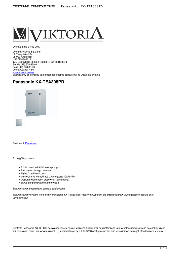 CENTRALE TELEFONICZNE : Panasonic KX-TEA308PD Oferta z dnia: 04-03-2017 Oferent: Viktoria Sp. z o.o. ul. Tuszyńska 28a 95-020 Andrespol NIP:7251888618 Tel. (42) 678-33-60 lub 510209013 lub 500170974 Serwis (42) 678-33-46 Faks (42) 678-33-49 Oferta ważna: 7 dni www.viktoria.com.pl Zapraszamy do kontaktu telefonicznego chętnie odpowiemy na wszystkie pytania. Panasonic KX-TEA308PD Producent: Panasonic Szczegóły produktu 3 linie miejskie i 8 linii wewnętrznych Efektywna obsługa połączeń Tryby Dzień/Noc/Lunch Wyświetlanie identyfikacji dzwoniącego (Caller ID) Obsługa wiadomości głosowych (opcjonalna) Łatwe programowanie/konserwacja Zaawansowana hybrydowa centrala telefoniczna Zaawansowany system telefoniczny Panasonic KX-TEA308 jest idealnym wyborem dla przedsiębiorstw wymagających obsługi do 8 użytkowników. Centrale Panasonic KX-TES308 są wyposażone w zestaw ważnych funkcji oraz są dostarczane jako w pełni skonfigurowane do obsługi trzech linii miejskich i ośmiu linii wewnętrznych. System telefoniczny KX-TES308 obsługuje urządzenia jednoliniowe, takie jak standardowe telefony 1 / 3 CENTRALE TELEFONICZNE : Panasonic KX-TEA308PD analogowe, telefony bezprzewodowe itp., jak również telefony systemowe, które umożliwiają maksymalne wykorzystanie funkcji systemowych. Można dokonać wyboru spośród czterech obsługiwanych modeli telefonów systemowych KX-T7720, KX-T7750, KX-T7730 oraz najwyższego modelu KX-T7735. Funkcje systemu telefonicznego Panasonic KX-TEA308: automatyczny transfer połączeń faksowych, automatyczne wstawianie pauzy, przekazywanie połączeń, zawieszanie połączeń, przejmowanie połączeń, transfer połączeń, połączenia oczekujące, połączenia konferencyjne, ochrona linii danych, opcjonalna obsługa funkcji DISA, personalizacja dzwonienia, obsługa zamka do drzwi, powtarzanie ostatnio wybieranego numeru, interkom, muzyka podczas zawieszenia połączenia, ograniczanie połączeń, systemowe szybkie wybieranie z pamięcią 80 numerów, przełączanie wybierania tonowe/impulsowe Pojemność systemu (maks) Operator Systemowe szybkie wybieranie Osobiste szybkie wybieranie Wybieranie jednoprzyciskowe Grupy wewnętrznych Grupy UCD Poziomy restrykcji połączeń Kody rozliczeniowe (weryfikowalne) Parkowanie połączeń Rejestr połączeń (Caller ID) Wiadomości na czas nieobecności Wiadomość oczekująca Kody alarmowe Zewnętrzne źródła muzyki Zewnętrzne przywołanie Domofony Elektrozamki Konsole DSS Wiadomości wychodzące OGM (DISA) Wiadomości wychodzące OGM (BV) 1.0 100.0 10 / linię wewnętrzną maks. 12 / linię wewnętrzną 8.0 1.0 5.0 50.0 10.0 20 (Osobiste) / 300 (Typowo) 6.0 8 / linię wewnętrzną 5.0 1.0 1.0 2.0 2.0 2.0 180 s 125 wiadomości lub 60 min (/1 kanał) Typy złączy Linie miejskie Wewnętrzne Wyjście przywołania Muzyka zewnętrzna SMDR Programowanie Tak Tak Tak Tak Tak Tak Funkcje Maksymalna pojemność Ścieżki wewnętrzne Metoda wybierania Konwersja wybierania SMDR Detekcja odwrócenia pętli Porty poczty głosowej Odbiorniki DTMF Generatory DTMF Porty podczas awarii zasilania Bezpośrednie podłączenie do zewnętrznych akumulatorów 3 linie miejskie (LM) / 8 linii wewnętrznych (8: hybrydowych) 3.0 Zewnętrzne: Tonowe (DTMF) / Impulsowe (10 p/s, 20 p/s) / Wewnętrzne: Tonowe (DTMF) / Impulsowe (10 p/s, 20 p/s) Impulsowe na DTMF Rejestrowane dane: Data, Czas, Numer linii wewnętrznej, Numer linii LM, Wybierany numer, Czas połączenia, Kod rozliczeniowy, Identyfikator Tak 2 porty (ATS lub DTMF) 2.0 1.0 1.0 Tak Dane ogólne Źródło zasilania Pobór mocy AC 100 - 240 V, 50/60 Hz 34 W 2 / 3 CENTRALE TELEFONICZNE : Panasonic KX-TEA308PD Dane ogólne Wymiary (mm) Szerokość Głębokość Wysokość Waga (system w pełni wyposażony) 249.0 73.0 316.0 1 3 / 3 Powered by TCPDF (www.tcpdf.org)