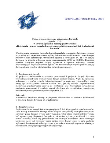 EUROPOL JOINT SUPERVISORY BODY Opinia wspólnego organu nadzorczego Europolu (opinia 11/38) w sprawie zgłoszenia operacji przetwarzania: „Rejestracja rozmów przychodzących za pośrednictwem ogólnej linii telefonicznej Europolu” Wspólny organ nadzorczy Europolu dokonał przeglądu zgłoszenia „Rejestracja rozmów przychodzących za pośrednictwem ogólnej linii telefonicznej Europolu”, które Europol przesłał w celu uprzedniego sprawdzenia zgodnie z wymogami art. 28 i 30 decyzji dyrektora w sprawie wdrożenia zasad rozporządzenia (WE) nr 45/2001. Dokonano również przeglądu projektu decyzji dyrektora w sprawie rejestracji rozmów przychodzących za pośrednictwem ogólnej linii telefonicznej Europolu (projekt decyzji dyrektora) oraz projektu oświadczenia o ochronie prywatności. 1. Przekazywanie danych W projekcie oświadczenia o ochronie prywatności i projekcie decyzji dyrektora przewidziano możliwość przekazywania danych osobom trzecim. W pkt 22 zgłoszenia wskazano, iż – oprócz organów ścigania/sądowych na terytorium Niderlandów – dane mogą być przekazywane osobom trzecim, lecz, jak się wydaje, z ograniczeniem możliwości przekazywania danych do terytorium UE. W projekcie oświadczenia o ochronie prywatności i projekcie decyzji dyrektora nie przewidziano ograniczenia możliwości przekazywania danych do terytorium UE. Zalecenie Wprowadzić stosowne zmiany w projekcie oświadczenia o ochronie prywatności, w projekcie decyzji dyrektora lub w zgłoszeniu. 2. Przechowywanie Zapisy rozmów są na ogół kasowane po upływie 7 dni. W przypadku zapisów rozmów, które zostały przeniesione na drugi nośnik danych, maksymalny okres przechowywania określony przez Europol wynosi cztery tygodnie. Choć okres czterotygodniowy może być wystarczający dla potrzeb Europolu, to nie można wykluczyć możliwości, iż treść zapisu rozmowy stanie się przedmiotem lub istotnym elementem sporu prawnego; konieczne może być przechowywanie zapisu przez dłuższy okres w celu ustalenia, wykonania lub obrony określonego prawa w związku z roszczeniem prawnym będącym przedmiotem toczącego się postępowania sądowego. 1 Zalecenie Dopuścić dłuższy okres przechowywania w sytuacji, gdy przechowywanie danych jest niezbędne w celu ustalenia, wykonania lub obrony praw. Wprowadzić niezbędne zmiany w projekcie decyzji dyrektora, w projekcie oświadczenia o ochronie prywatności i w zgłoszeniu. 3. Kategorie przechowywanych danych W pkt 14 zgłoszenia nie wskazano, czy będą gromadzone nazwiska osób fizycznych; jest jednak możliwe, że w czasie rozmowy osoby fizyczne będą podawać swoje nazwisko. Ponadto w projekcie oświadczenia o ochronie prywatności i w projekcie decyzji dyrektora uznano fakt, iż może mieć miejsce przetwarzanie danych szczególnie chronionych, o ile będą one dobrowolnie podawane przez dzwoniącego; kwestii tej nie uwzględniono jednak w zgłoszeniu (pkt 16). Zalecenia Jeżeli operatorzy linii telefonicznej Europolu podają swoje nazwisko, odbierając połączenie, fakt taki powinien zostać uwzględniony poprzez zmianę zgłoszenia. Należy wziąć pod uwagę, że dane osobowe operatorów linii telefonicznej Europolu mogą być gromadzone na tej samej zasadzie, co dane osobowe dzwoniących. Na przykład, nawet w przypadku, gdy personel nie podaje w czasie rozmowy żadnych danych osobowych ani własnego nazwiska, w dalszym ciągu istnieje możliwość identyfikacji danego członka personelu uczestniczącego w rozmowie na podstawie czasu i daty rozmowy. Zmienić pkt 16 zgłoszenia w celu uwzględnienia możliwości przetwarzania danych szczególnie chronionych, stosownie do treści projektu decyzji dyrektora i projektu oświadczenia o ochronie poufności. 4. Postępowanie w przypadku zagrożeń, sytuacji kryzysowych i innych incydentów W art. 4 projektu decyzji dyrektora zdefiniowano niektóre rodzaje rozmów, które mogłyby być przenoszone na drugi nośnik. Jednym z wymienionych rodzajów rozmów są „rozmowy chaotyczne” (ang. frantic calls). Wspólny organ nadzorczy wolałby, aby termin ten został doprecyzowany. Dla przykładu, inny rodzaj rozmów – „rozmowy nie w pełni zrozumiałe” (ang. calls which cannot be fully understood) – został dookreślony w sposób następujący: „oraz w przypadkach, gdy istnieją uzasadnione przesłanki wskazujące, iż dotyczą one zagrożenia, sytuacji kryzysowej lub innego incydentu bądź mają z nimi związek”. Zalecenie Doprecyzowanie podstawy możliwości przenoszenia „rozmów chaotycznych” na drugi nośnik. 2 5. Zgoda/podstawy prawne Jedną z wymienionych podstaw prawnych jest zgoda osoby, której dane dotyczą. Dotyczy to zarówno dzwoniących, jak i operatorów linii telefonicznej Europolu. Zgodnie z treścią zawiadomienia w przypadku operatorów linii telefonicznej istnieje domniemanie zgody, o ile personel otrzymał egzemplarz (aktualnie projektu) oświadczenia o ochronie prywatności; udostępnienie personelowi oświadczenia o ochronie prywatności nie jest jednak tym samym co uzyskanie jego zgody – jest jedynie udostępnieniem informacji. W kontekście zatrudnienia – w sytuacji, gdy personel nie ma możliwości skorzystania z klauzuli „opt-out” (w tym przypadku jego praca polega na obsłudze linii telefonicznej), zgoda nie jest odpowiednią podstawą prawną dla przetwarzania. Zalecenie W tym przypadku odpowiednimi podstawami prawnymi są: art. 6 decyzji dyrektora w sprawie wdrożenia zasad rozporządzenia nr 45/2001 oraz, o czym wcześniej wspomniano w zgłoszeniu, projekt decyzji dyrektora i podręcznik Europolu dotyczący bezpieczeństwa. W zgłoszeniu położono jednak zbyt wielki nacisk na zgodę jako podstawę prawną; wspólny organ nadzorczy zaleca Europolowi zmniejszenie znaczenia zgody osoby, której dane dotyczą, w związku z przetwarzaniem danych personelu, szczególnie w przypadkach, gdy nie istnieje realna możliwość wyboru w sprawie udzie