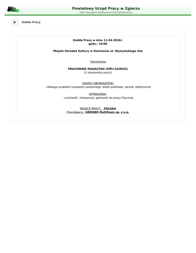 Powiatowy Urząd Pracy w Zgierzu http://pupzgierz.pl/aktualnosc/161/gielda-pracy Giełda Pracy Giełda Pracy w dniu 11.04.2016r. godz.: 10:00 Miejski Ośrodek Kultury w Ozorkowie ul. Wyszyńskiego 43a Stanowisko: PRACOWNIK MAGAZYNU (OfPr/16/0925) (2 stanowiska pracy) ZAKRES OBOWIĄZKÓW: - obsługa urządzeń transportu poziomego, wózki paletowe, ręczne, elektryczne WYMAGANIA: - uczciwość, motywacja, gotowość do pracy fizycznej MIEJSCE PRACY: POLSKA Pracodawca: GREINER Multifoam sp. z o.o.