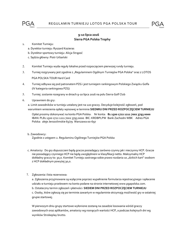 R E G UL A M I N TUR N I EJ U LO TO S P G A P O L SK A TO UR 9-10 lipca 2016 Sierra PGA Polska Trophy 1. Komitet Turnieju: a. Dyrektor turnieju: Ryszard Kozieras b. Dyrektor sportowy turnieju: Alicja Strąpoć c. Sędzia główny: Piotr Urbański Komitet Turnieju wyda reguły lokalne przed rozpoczęciem pierwszej rundy turnieju. Turniej rozgrywany jest zgodnie z „Regulaminem Ogólnym Turniejów PGA Polska” oraz z LOTOS PGA POLSKA TOUR Hard Card Turniej odbywa się pod patronatem PZG i jest turniejem rankingowym Polskiego Związku Golfa (IV kategoria rankingowa PZG) Turniej zostanie rozegrany w dniach 9-10 lipca 2016 na polu Sierra Golf Club Uprawnieni do gry: a. Limit zawodników w turnieju ustalony jest na 120 graczy. Decyduje kolejność zgłoszeń, pod warunkiem wniesienia opłaty wpisowej w terminie SIEDMIU DNI PRZED ROZPOCZĘCIEM TURNIEJU Opłat prosimy dokonywać na konto PGA Polska: Nr konta: 81 1500 1722 1211 7002 3793 0000 IBAN: PL81 1500 1722 1211 7002 3793 0000 BIC: KRDBPLPW Bank Zachodni WBK Adres PGA Polska: aleje Jerozolimskie 65/79 Warszawa 00-697 b. Zawodowcy: Zgodnie z ustępem 2. Regulaminu Ogólnego Turniejów PGA Polska c. Amatorzy: Do gry dopuszczeni będą gracze posiadający zarówno czynny jak i nieczynny HCP. Gracze nie posiadający czynnego HCP nie będą uwzględnieni w klasyfikacji netto. Maksymalny HCP dokładny graczy to: 30,0. Komitet Turnieju zastrzega sobie prawo rozdania 10 „dzikich kart” osobom z HCP dokładnym powyżej 30,0. Zgłoszenia i lista rezerwowa: a. Zgłoszenia przyjmowane są wyłącznie poprzez wypełnienie formularza rejestracyjnego i opłacenie udziału w turnieju przelewem na konto podane na stronie internetowej www.pgapolska.com. b. Ostateczny termin zgłoszeń i płatności: SIEDEM DNI PRZED ROZPOCZĘCIEM TURNIEJU c. Osoby, które zgłoszą się po terminie zawartym w regulaminie otrzymają możliwość gry w ostatniej grupie startowej. W pierwszym dniu grupy startowe wyłonione zostaną na zasadzie losowania wśród graczy zawodowych oraz aplikantów, amatorzy wg rosnących wartości HCP, a podczas kolejnych dni wg wyników Strokeplay brutto. Start turnieju a. Czas startu: Decyzja zostanie podjęta przez Komitet Turniejowy w dzień poprzedzający turniej. b. Osoby, które pomimo dokonania wpłaty nie zgłosiły się na start, będą pozbawione prawa startu w trzech następnych turniejach organizowanych przez PGA Polska Format turnieju: Zawodowcy: 36 dołków w formacie Strokeplay Brutto Amatorzy: 36 dołków w formacie Strokeplay Brutto Amatorzy: 36 dołków w formacie Strokeplay Netto Tee: Zawodowcy oraz amatorzy: Zawodowcy a. kobiety: żółte, długość pola 5623 m, b. mężczyźni: białe, długość pola 6115 m, Tee amatorzy: a. kobiety: żółte, długość pola 5623 m, z uwzględnieniem zmian długości dozwolonych przez Europejską Federację Golfa (EGA) b. mężczyźni i juniorzy powyżej 12 roku życia: białe, długość pola 6115 m, z uwzględnieniem zmian długości dozwolonych przez Europejską Federację Golfa (EGA) c. juniorzy poniżej 12 roku życia: żółte, długość pola 5623 m, z uwzględnieniem zmian długości dozwolonych przez Europejską Federację Golfa (EGA) 10.CUT Do drugiej rundy zakwalifikuje się 72 zawodników z najlepszymi wynikami Strokeplay brutto, oraz remisy. Komisja Turniejowa zastrzega sobie prawo do nie stosowania CUT-a. 11. Opłaty a. Zawodowcy: i. Członkowie PGA Polska – 100 zł ii. Aplikanci PGA Polska – 100 zł iii. Zawodowcy spoza PGA Polska – 100 Euro b. Amatorzy: i. Członkowie Klubu– 150 zł ii. Juniorzy – 150 zł iii. Goście – 400 zł c. Goście sponsorów i dzikie karty – wg decyzji Dyrektora Turnieju 12. Nagrody I, II, III miejsce wśród amatorów klasyfikacji Strokeplay po 36 dołkach I, II, III miejsce wśród amatorów klasyfikacji Strokeplay netto po 36 dołkach Najlepsza kobieta w klasyfikacji stroke play brutto i stroke play netto po 36 dołkach Najlepszy junior w kategorii stroke play brutto i stroke play netto po 36 dołkach I, II, III miejsce wśród zawodowców klasyfikacji Strokeplay po 36 dołkach Podział puli pieniężnej zostanie opublikowany przez Komisję Turniejową PGA Polska do 10 maja 2016 r na stronie www.pgapolska.com. Wszystkie nagrody w klasyfikacji amatorów są rozłączne. 13. Informacje Wszelkie informacje dotyczące turnieju, takie jak skład Komitet Turnieju, listy startowe, komunikaty Komitetu Turnieju będą wywieszane na tablicy ogłoszeń w Centrum Turniejowym oraz na stronie internetowej www.pgapolska.com 14. Remisy: a. Zawodowcy: i. W przypadku remisu o pierwsze miejsce wśród Pro w klasyfikacji Strokeplay Brutto, odbędzie się dogrywka w systemie "nagłej śmierci" zaraz po zakończeniu rundy zasadniczej. Dołki dogrywki zostaną ogłoszone przez Komitet Turnieju przed jej rozpoczęciem. ii. W przypadku remisów na miejscu drugim i dalszych, zawodnicy będą klasyfikowani ex-aequo. b. Amatorzy: W przypadku remisu o pierwsze, drugie i trzecie miejsce wśród Amatorów w klasyfikacji Strokeplay Brutto i Netto, o zajęciu wyższego miejsca zadecyduje zasada countback: lepsza druga runda, 9, 6, 3, 1 drugiej rundy. W razie remisów o miejsca poza nagradzanymi będą przyznawane miejsca ex-aequo Poprzez ostatnie 9 dołków rozumie się dołki 10-18 pola. c)Punkty rankingowe PZG będą przyznawane zgodnie z Regulaminem Rankingu PZG 2015. d) Nagrody w klasyfikacjach brutto i netto są rozłączne. Kategoria brutto jest kategorią główną i gracze otrzymujący nagrody za kategorię brutto nie są uwzględniani w nagrodach w kategorii netto. Komitet turniejowy zastrzega sobie prawo do zmiany regulaminu.