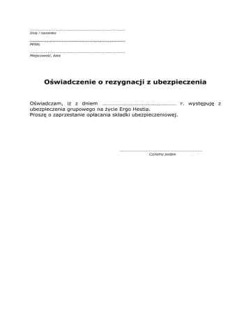 .............................................................................. Imię i nazwisko ……………………………………………………………………… PESEL .............................................................................. Miejscowość, data Oświadczenie o rezygnacji z ubezpieczenia Oświadczam, iż z dniem ……………………………………………… r. występuję z ubezpieczenia grupowego na życie Ergo Hestia. Proszę o zaprzestanie opłacania składki ubezpieczeniowej. .................................................................... Czytelny podpis