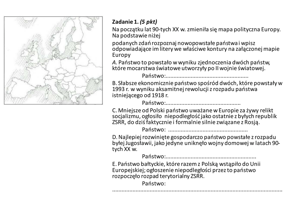 Zadanie 1. (5 pkt) Na początku lat 90-tych XX w. zmieniła się mapa polityczna Europy. Na podstawie niżej podanych zdao rozpoznaj nowopowstałe paostwa i wpisz odpowiadające im litery we właściwe kontury na załączonej mapie Europy A. Paostwo to powstało w wyniku zjednoczenia dwóch paostw, które mocarstwa światowe utworzyły po II wojnie światowej. Paostwo:..................................................... B. Słabsze ekonomicznie paostwo spośród dwóch, które powstały w 1993 r. w wyniku aksamitnej rewolucji z rozpadu paostwa istniejącego od 1918 r. Paostwo:................................................ C. Mniejsze od Polski paostwo uważane w Europie za żywy relikt socjalizmu, ogłosiło niepodległośd jako ostatnie z byłych republik ZSRR, do dziś faktycznie i formalnie silnie związane z Rosją. Paostwo: ................................................... D. Najlepiej rozwinięte gospodarczo paostwo powstałe z rozpadu byłej Jugosławii, jako jedyne uniknęło wojny domowej w latach 90tych XX w. Paostwo:.......................................................... E. Paostwo bałtyckie, które razem z Polską wstąpiło do Unii Europejskiej; ogłoszenie niepodległości przez to paostwo rozpoczęło rozpad terytorialny ZSRR. Paostwo: ............................................................................................................. Zadanie 2. (2 pkt) Podaj nazwę regionu, którego dotyczą wymienione wydarzenia związane z konfliktem rozgrywającym się na jego obszarze. Wymieo strony tego konfliktu (paostwa lub narody). a) powstanie OWP b) wojna sześciodniowa. c) wybuch intifady d) mapa drogowa.. Region.................... Strony konfliktu............ Zadanie 3. (1 pkt) OPEC zrzesza 10 paostw – eksporterów ropy naftowej. Na spotkaniach przedstawicieli tych paostw ustala się między innymi roczne limity wydobycia ropy dla każdego z członków OPEC. Przeczytaj uważnie poniższe stwierdzenia i zaznacz te, które właściwie określają główne cele paostw zrzeszonych w OPEC. a) Ujednolicenie polityki w zakresie wydobycia ropy naftowej. b) Maksymalne zwiększenie wydobycia i eksportu ropy przez każdy kraj OPEC. c) Systematyczne ograniczenie eksportu ropy naftowej. d) Utrzymanie wysokich cen ropy na rynkach światowych. e) Koordynowanie wielkości importu w paostwach kupujących ropę naftową. Zadanie 4. (1 pkt) Na obszarach konfliktowych często stacjonują wojska ONZ-tu (tak jak np. w strefie Wzgórz Golan). Przedstaw jedno z zadao, które wypełniają przebywające w strefach konfliktowych wojska ONZ, lub podaj przykład ich działao. ............................................................................................................................................ ............................................................................................................................................ Zadanie 5. (2 pkt) Podaj po dwie konsekwencje (społeczne, polityczne, kulturowe lub gospodarcze)uchodźctwa: a) dla kraju z którego uchodźcy uciekają, b) dla kraju udzielającego im azylu. ............................................................................................................................................ ............................................................................................................................................ Zadanie 6. (3 pkt) Wpisz w wyznaczone miejsca na mapie konturowej świata litery od A do F, którym przyporządkowano wybrane zamachy terrorystyczne na przełomie XX i XXI wieku. Wybrane zamachy terrorystyczne: A. marzec 2004 roku - na pociąg podmiejski w Madrycie, którym jechali mieszkaocy pobliskich miejscowości do pracy, B. wrzesieo 2001 roku - na wieżowce World Trade Center w Nowym Jorku, C. sierpieo 1998 roku - na budynek ambasady USA w Nairobi, D. październik 2002 roku- na klub nocny w kurorcie turystycznym Bali, E. listopad 2003 roku - na synagogi i konsulat brytyjski w Stambule, F. marzec 2002 roku - wybuch samochodów pułapek przed budynkiem ambasady USA w Limie. Zadanie 7. (5 pkt) Podkreśl w każdej z grup paostwo, nie będące członkiem danej organizacji polityczno – gospodarczej. Zadanie 8. (3 pkt) Do każdego z niżej podanych narodów dopisz nazwę paostwa, w którym walczy on o uzyskanie niepodległości. a) Kurdowie - ................................................................... b) Palestyoczycy - ............................................................ c) Baskowie - ................................................................... Zadanie 9. (2 pkt) Wymieo cztery paostwa, które pojawiły się na mapie politycznej Europy w wyniku przemian politycznych na tym kontynencie pod koniec XX wieku. 1. .................................................................................................. 2. .................................................................................................. 3. .................................................................................................. 4. ................................................................................................... Zadanie 10. (2 pkt) Na mapie konturowej zaznaczono miejsca występowania wybranych konfliktów. Uzupełnij tabelę, przyporządkowując wybranym konfliktom odpowiedni numer zaznaczony na mapie oraz podając ich przyczyny Numer na Miejsce mapie konfliktu Korsyka Irak Kaszmir Przyczyny Zadanie 11 (2 pkt) Organizacjom terrorystycznym (A – E) przyporządkuj ich określenia (1 – 5). A) Irlandzka Republikaoska Armia 1) organizacja fundamentalistów palestyoskich B) Kraj Basków i Wolnośd (ETA) 2) organizacja Osamy bin Ladena, zwana również „międzynarodówką terrorystów” C) HAMAS 3) organizacja separatystyczno – narodowa w Hiszpanii i Francji D) Al-Kaida 4) organizacja działająca w Algierii, dążąca do obalenia świeckich władz i prowadzenia paostwa religijnego E) Zbrojne Siły Islamskie 5) organizacja zbrojna katolików w Irlandii