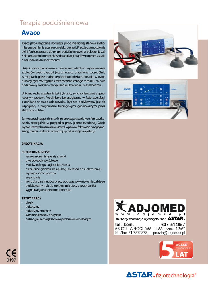 Terapia podciśnieniowa Avaco Avaco jako urządzenie do terapii podciśnieniowej stanowi znakomite uzupełnienie aparatu do elektroterapii. Pracując samodzielnie pełni funkcję aparatu do terapii podciśnieniowej, w połączeniu zaś z elektrostymulatorem służy do aplikacji prądów poprzez ssawki z wbudowanymi elektrodami. Dzięki podciśnieniowemu mocowaniu elektrod wykonywanie zabiegów elektroterapii jest znacząco ułatwione szczególnie w miejscach, gdzie trudno użyć elektrod płaskich. Ponadto w trybie pulsacyjnym występuje efekt mechanicznego masażu, co daje dodatkową korzyść – zwiększenie ukrwienia i metabolizmu. Unikalną cechą urządzenia jest tryb pracy synchronizowanej z generowanym prądem. Podciśnienie jest zwiększane w fazie stymulacji, a obniżane w czasie odpoczynku. Tryb ten dedykowany jest do współpracy z programami treningowymi generowanymi przez elektrostymulator. Samouszczelniające się ssawki podnoszą znacznie komfort użytkowania, szczególnie w przypadku pracy jednoobwodowej. Opcja wyboru różnych rozmiarów ssawek wpływa efektywnie na optymalizację terapii – zależnie od rodzaju prądu i miejsca aplikacji. SPECYFIKACJA FUNKCJONALNOŚĆ • samouszczelniającesięssawki • dwaobwodywyjściowe • możliwośćregulacjipodciśnienia • niezależnegniazdadoaplikacjielektroddoelektroterapii • wydajna,cichapompa • ergonomia • kontrolaparametrówpracypodczaswykonywaniazabiegu • dedykowanytrybdoopróżnianiacieczyzezbiornika • sygnalizacjanapełnianiazbiornika TRYBY PRACY • ciągły • pulsacyjny • pulsacyjnyzmienny • synchronizowanyzprądem • pulsacyjnyzezwiększonympodciśnieniemdolnym Avaco Specyfikacja techniczna KONSTRUKCJA • nowoczesnakonstrukcja • trwałainiezawodnaklawiatura • autotest–bieżącakontrolasprawnościaparatu • łatweopróżnianiecieczyzezbiornika RODZAJE SSAWEK • ∅ 60 mm • ∅ 90 mm PARAMETRY TECHNICZNE częstość pulsacji fali podciśnieniowej podciśnienie maks. zakres regulacji podciśnienia liczba ssawek zasilanie wymiary masa 6, 12, 20, 40, 60 imp/min 500 mbar 100 – 500 mbar, krok 40 mbar 4 230 V/20 W 30x26x12 cm maks. 3,5 kg GWARANCJA Avaco 2 lata WYPOSAŻENIE STANDARDOWE • przewódsieciowy • kabledopodłączeniaelektrostymulatora(2szt.) • przewodypodciśnieniowe(4szt.) • ssawki∅ 60mm(4szt.) • wkładkiwiskozowe∅ 60mm(8szt.) • łącznikprzewodówpodciśnieniowych(2szt.) • zapasowebezpiecznikisieciowe(2szt.) • instrukcjaużytkowania WYPOSAŻENIE OPCJONALNE • ssawki ∅ 90 mm • wkładkiwiskozowe∅ 90 mm • stolikELF,ELFX