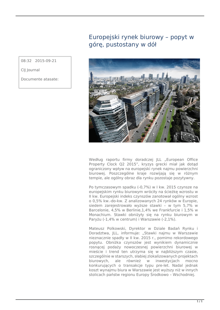 Europejski rynek biurowy – popyt w górę, pustostany w dół 08:32 2015-09-21 CIJ Journal Documente atasate: Według raportu firmy doradczej JLL „European Office Property Clock Q2 2015”, kryzys grecki miał jak dotąd ograniczony wpływ na europejski rynek najmu powierzchni biurowej. Poszczególne kraje rozwijają się w różnym tempie, ale ogólny obraz dla rynku pozostaje pozytywny. Po tymczasowym spadku (-0,7%) w I kw. 2015 czynsze na europejskim rynku biurowym wróciły na ścieżkę wzrostu w II kw. Europejski indeks czynszów zanotował ogólny wzrost o 0,5% kw.-do-kw. Z analizowanych 24 rynków w Europie, siedem zarejestrowało wyższe stawki – w tym 5,7% w Barcelonie, 4,5% w Berlinie,1,4% we Frankfurcie i 1,5% w Monachium. Stawki obniżyły się na rynku biurowym w Paryżu (-1,4% w centrum) i Warszawie (-2,1%). Mateusz Polkowski, Dyrektor w Dziale Badań Rynku i Doradztwa, JLL, informuje: „Stawki najmu w Warszawie nieznacznie spadły w II kw. 2015 r., pomimo rekordowego popytu. Obniżka czynszów jest wynikiem dynamicznie rosnącej podaży nowoczesnej powierzchni biurowej w mieście i trend ten utrzyma się w najbliższym czasie, szczególnie w starszych, słabiej zlokalizowanych projektach biurowych, ale również w inwestycjach mocno konkurujących o transakcje typu pre-let. Nadal jednak koszt wynajmu biura w Warszawie jest wyższy niż w innych stolicach państw regionu Europy Środkowo – Wschodniej. 1/1