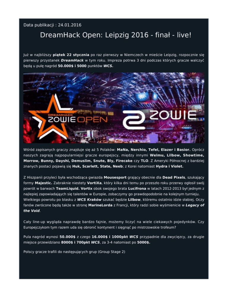 Data publikacji : 24.01.2016 DreamHack Open: Leipzig 2016 - finał - live! Już w najbliższy piątek 22 stycznia po raz pierwszy w Niemczech w mieście Leipzig, rozpocznie się pierwszy przystanek DreamHack w tym roku. Impreza potrwa 3 dni podczas których gracze walczyć będą u pulę nagród 50.000$ i 5000 punktów WCS. Wśród zapisanych graczy znajduje się aż 5 Polaków: MaNa, Nerchio, Tefel, Elazer i Basior. Oprócz naszych zagrają najpopularniejsi gracze europejscy, między innymi Welmu, Lilbow, Showtime, Morrow, Bunny, Dayshi, Demuslim, Snute, Bly, Firecake czy TLO. Z Ameryki Północnej z bardziej znanych postaci pojawią się Huk, Scarlett, State, Neeb; z Korei natomiast Hydra i Violet. Z Hiszpanii przyleci była wschodząca gwiazda Mousesport grający obecnie dla Dead Pixels, szukający formy Majestic. Zabraknie niestety VortiXa, który kilka dni temu po przeszło roku przerwy ogłosił swój powrót w barwach TeamLiquid. Vortix obok swojego brata Lucifrona w latach 2012-2013 był jednym z najlepiej zapowiadająych się talentów w Europie, zobaczymy go prawdopodobnie na kolejnym turnieju. Wielkiego powrotu po blasku z WCS Kraków szukać będzie Lilbow, któremu ostatnio idzie słabiej. Oczy fanów zwrócone będą także w stronę MarineLorda z Francji, który radzi sobie wyśmienicie w Legacy of the Void. Cały line-up wygląda naprawdę bardzo fajnie, możemy liczyć na wiele ciekawych pojedynków. Czy Europejczykom tym razem uda się obronić kontynent i sięgnąć po mistrzowskie trofeum? Pula nagród wynosi 50.000$ z czego 16.000$ i 1000pkt WCS przypadnie dla zwycięzcy, za drugie miejsce przewidziano 8000$ i 700pkt WCS, za 3-4 natomiast po 5000$. Polscy gracze trafili do następujących grup (Group Stage 2) W Group Stage 1 znajdują się jeszcze Basior w grupie H i Rupek w grupie L. ● DreamHack Open: Leipzig 2016 liquipedia ● Strona Dreamhack i pełna lista graczy AKTUALIZACJA Zakończył się pierwszy dzień rozgrywek, po dobrych grach Polaków w Group Stage2 gdzie: MaNa pokonał 2:0 VeniVidiVins i 2:0 Majestic, Elazer 2:1 HateMe, 2:0 Nice; Tefel 2:0 CheeseKing i 2:0 MiNiMaTh; Basior 2:0 yingyang i 2:1 Lambo; Nerchio 2:1 Serral i 2:0 Protosser. Pierwsze rundy były tylko przygotowaniem przed fazą playoffs, w której to dopiero pojawili się mocniejsi przeciwnicy. W Round 32 niestety nie poszło już tak łatwo: ● Basior 1:3 PtitDrogo ● Nerchio 1:3 Lilbow ● uThermal 3:0 Tefel ● Elazer 3:2 State !!! ● SortOf 3:1 MaNa W kolejnej rundzie Ro16 Elazer spotkał się z Koreańczykiem Violetem, z którym przegrał 0:3. W turnieju pozostało już tylko 8 graczy, pierwsze gry rozpoczną się o godzinie 14.45: ● 14.45: PtitDrogo vs TLO ● 16.00: ShoWTimE vs uThermal ● 17.15: viOLet vs Serral ● 18.30: Bly vs Hydra Wielki finał rozegrany zostanie jutro (niedziela) o godzinie 11.00. AKTUALIZACJA Dotarliśmy do trzeciego, ostatniego dnia rozgrywek, pozostał do rozegrania już tylko wielki finał pomiędzy ukraińskim zergiem Bly i protossem z Francji - PitDrogo. Bly zaliczył wczoraj wielki tour w playoffs brackecie pokonując kolejno: Morrow 3:0, Probe 3:1, koreańskiego mistrza Hydra 3:2 i Violet 3:0. PitDrogo natomiast wygrał 3:1 z Basior, 3:2 z Neeb, 3:2 z TLO i 3:2 z uThermal. Finał live Autor: Fanek Liczba wyświetleń strony: 1146 Data publikacji : 24.01.2016 Data modyfikacji : 24.01.2016 Tagi: Dreamhack, eSport, mana, Nerchio, Tefel, Elazer Komentarz (0) dodaj komentarz Brak komentarzy dodaj komentarz Pozostałe nowości DreamHack Open: Valencia 2016 - Nerchio w półfinale - live! DreamHack Valencia to jedno z największych e-sportowych wydarzeń w Europie - dlatego nie mogło zabraknąć na nim StarCrafta II! W czasie rozgrywek 96 graczy będzie konkurować o 50 000 USD oraz 5 000 punktów WCS.Data publikacji: 16.07.20161 Aktualizacja 3.4 – Duże zmiany w rankingu StarCrafta II Na oficjalnym blogu Blizzarda pojawił się nowy wpis dotyczący tym razem zmian w rankingach: Ranking StarCrafta II jest areną dla niezwykle zaciętej rywalizacji. Do walki rusza wielu uczestników, ale tylko nieliczni awansują do ścisłej czołówki.Data publikacji: 03.07.20160 Rozpoczęcie trzeciego sezonu rankingowego 2016 Trzeci sezon tegorocznych rozgrywek ligowych w StarCrafta II uważamy za otwarty! Zresetowano pulę punktów premiowych oraz rankingi i przyznano nagrody za sezon drugi roku 2016.Data publikacji: 26.06.20160 Filmowy „Warcraft” już wkrótce w księgarniach! Powieść „Warcraft”, której wydanie zbiega się z polską premierą filmu „Warcraft. Początek” w reżyserii Duncana Jonesa, do księgarń trafi już 15 czerwca. Na kartach książki czytelnicy wkroczą w nowy wymiar emocji towarzyszących bohaterom fikcyjnych światów Azeroth i Draenor. Za sprawą Christie Golden, pisarki od lat cenionej przez fanów świata Warcraft, konflikt ludzi i orków nabierze jeszcze większej intensywności.Data publikacji: 13.06.20160 Blokada obecnego sezonu i darmowa zmiana nazwy postaci Jak czytamy na oficjalnym blogu Blizzarda: Obecny sezon rankingowy zbliża się ku końcowi i wkrótce zamknięte zostaną wszystkie ligi i dywizje. Kilka dni przed rozpoczęciem nowego sezonu, darmowa zmiana nazwy postaci w StarCraft II zostanie ponownie dodana do wszystkich kont, dla których funkcja ta nie jest obecnie dostępna.Data publikacji: 12.06.20160 Wszystkie nowości