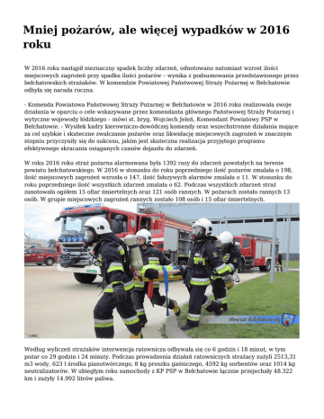 Mniej pożarów, ale więcej wypadków w 2016 roku W 2016 roku nastąpił nieznaczny spadek liczby zdarzeń, odnotowano natomiast wzrost ilości miejscowych zagrożeń przy spadku ilości pożarów – wynika z podsumowania przedstawionego przez bełchatowskich strażaków. W komendzie Powiatowej Państwowej Straży Pożarnej w Bełchatowie odbyła się narada roczna. - Komenda Powiatowa Państwowej Straży Pożarnej w Bełchatowie w 2016 roku realizowała swoje działania w oparciu o cele wskazywane przez komendanta głównego Państwowej Straży Pożarnej i wytyczne wojewody łódzkiego – mówi st. bryg. Wojciech Jeleń, Komendant Powiatowy PSP w Bełchatowie. - Wysiłek kadry kierowniczo-dowódczej komendy oraz wszechstronne działania mające za cel szybkie i skuteczne zwalczanie pożarów oraz likwidację miejscowych zagrożeń w znacznym stopniu przyczyniły się do sukcesu, jakim jest skuteczna realizacja przyjętego programu efektywnego skracania osiąganych czasów dojazdu do zdarzeń. W roku 2016 roku straż pożarna alarmowana była 1392 razy do zdarzeń powstałych na terenie powiatu bełchatowskiego. W 2016 w stosunku do roku poprzedniego ilość pożarów zmalała o 198, ilość miejscowych zagrożeń wzrosła o 147, ilość fałszywych alarmów zmalała o 11. W stosunku do roku poprzedniego ilość wszystkich zdarzeń zmalała o 62. Podczas wszystkich zdarzeń straż zanotowała ogółem 15 ofiar śmiertelnych oraz 121 osób rannych. W pożarach zostało rannych 13 osób. W grupie miejscowych zagrożeń rannych zostało 108 osób i 15 ofiar śmiertelnych. Według wyliczeń strażaków interwencja ratownicza odbywała się co 6 godzin i 18 minut, w tym pożar co 29 godzin i 24 minuty. Podczas prowadzenia działań ratowniczych strażacy zużyli 2513,31 m3 wody, 623 l środka pianotwórczego, 8 kg proszku gaśniczego, 4592 kg sorbentów oraz 1014 kg neutralizatorów. W ubiegłym roku samochody z KP PSP w Bełchatowie łącznie przejechały 48.322 km i zużyły 14.992 litrów paliwa. KP PSP w Bełchatowie posiada własną, nowoczesną siedzibę, samochody i inny specjalistyczny sprzęt pożarniczy na poziomie europejskich standardów, a 88 osobowa kadra funkcjonariuszy i pracowników cywilnych KP PSP jest odpowiednio wyszkolona i przygotowana do prowadzenia działań ratowniczych i niesienia specjalistycznej pomocy. Po naradzie rocznej Zastępca Łódzkiego Komendanta Wojewódzkiego PSP w Łodzi st. bryg. mgr inż. Paweł Stępień przekazał do użytku dla bełchatowskiej jednostki lekki samochód kwatermistrzowski. Zaprezentowano także nowo zakupiono węże gaśnicze i armatkę wodną.