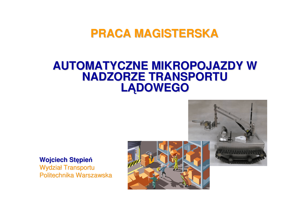 PRACA MAGISTERSKA AUTOMATYCZNE MIKROPOJAZDY W NADZORZE TRANSPORTU LĄDOWEGO Wojciech Stępień Wydział Transportu Politechnika Warszawska Zadanie na prace dyplomową i zakres pracy: Informacje ogó ogólne na temat magazynowania i transportu ładunkó adunków niebezpiecznych Analiza obecnie stosowanych rozwią rozwiązań zań technicznych nadzoru obiektó obiektów transportu lądowego. Analiza teoretyczna moż możliwoś liwości zastosowania mikropojazdó mikropojazdów do nadzoru w obiektach o szczegó szczególnym charakterze wymagań ń . wymaga Projekt konstrukcji mikropojazdu z uwzglę uwzględnieniem rozwią rozwiązań zań telematycznych w aspekcie charakteru realizowanych zadań zadań. Opracowanie dokumentacji dotyczą dotyczącej realizacji zadania. Cele pracy: Przegląd rozwiązań technicznych służących do nadzoru transportu lądowego. Analiza teoretyczna zastosowania robotów mobilnych do nadzoru w obiektach transportowych. Zaprezentowanie projektu zdalnie sterowanego pojazdu obserwacyjno-pomiarowego. Przedstawienie autorskiego oprogramowania służącego do sterownia pojazdem za pomocą sieci bezprzewodowej. Transport i magazynowanie ładunków niebezpiecznych Powszechna obecność towarów niebezpiecznych w domu (farby, kleje, kosmetyki) w budownictwie (smoł (smoły, lepiki, środki czyszczą czyszczące) w rolnictwie (nawozy, środki ochrony roś roślin) w rozrywce (sztuczne ognie, fajerwerki) telekomunikacji (baterie litowe w telefonach komó komórkowych) Akty prawne Dyrektywy Rozporzą Rozporządzenia Ministra, Rady Ministró Ministrów Ustawy Umowa ADR mię międzynarodowa konwencja dotyczą dotycząca drogowego przewozu towaró towarów i ładunkó adunków niebezpiecznych, sporzą sporządzona w Genewie dnia 30 wrześ września 1957 Magazynowanie Wytyczne dotyczą dotyczące konstrukcji obiektu, rozł rozłożenia i segregacji ładunkó adunków oraz warunkó warunków środowiskowych w jakich są są przechowywane. Rozwiązania techniczne służące do nadzoru transportu lądowego Telewizja przemysłowa CCTV – – – przemysł przemysł i handel: monitorowanie produkcji, ochrona towaró towarów, magazynowanie porty morskie i lotnicze: terminale pasaż pasażerskie, pł płyty lotnisk, miejsca przeł przeładunku towaró towarów drogi i miasta: monitorowanie terenó terenów i skrzyż skrzyżowań owań, pomiar GPS oraz GSM/GPRS – pozycjonowanie pojazdó pojazdów System do monitorowania warunków środowiskowych w magazynie Satelitarne systemy monitorowania i lokalizacji pojazdów samochodowych – – Inmarsat Euteltracs Robotyka mobilna Robot mobilny to taki robot, który może dowolnie zmieniać swoje położenie w przestrzeni. Roboty tego rodzaju mogą pływać, latać lub jeździć. Elementy robota mobilnego Układ zasilania Układ sterowania Układ napędowy inne elementy : – – – – elementy pomiarowe (czujniki, dalmierze) układy do komunikacji bezprzewodowej układy wizyjne (obserwacja otoczenia) manipulatory Możliwości wykorzystania w transporcie transport ładunków niebezpiecznych, transport ładunków ciężkich, monitorowanie ładunków niebezpiecznych monitorowanie placów składowych pomiar warunków środowiskowych w magazynach , chłodniach (temperatura, wilgotność, natężenie światła, stężenie gazów) Zalety i wady mobilność małe gabaryty niskie koszty eksploatacji praca bez czynnego udziału człowieka praca w warunkach niebezpiecznych dla człowieka ciągła kontrola nad aktualną wartością mierzonych parametrów problemy z właściwościami jezdnymi w zróżnicowanym terenie podatność na uszkodzenia lekkich konstrukcji zakłócenia w transmisji danych i sygnałach sterujących Pojazd „Terminus” Przeznaczenie pomiar wartości czynników środowiskowych zgodny z wytycznymi pomiarowymi (przykładowa mierzona wielkość – natężenie oświetlenia) rejestracja obrazu otoczenia sygnalizacja wykrycia stężenia gazów większego niż dopuszczalne (gaz ziemny, tlenek węgla, dym) możliwość przystosowanie pojazdu do pomiaru innych wielkości istotnych ze względu na charakter pracy wykonywanej w badanym obiekcie nadzór ładunków niebezpiecznych monitoring obszarów składowania ładunków Przeznaczenie Układ zasilania 12V 7Ah - do zasilania płyty głównej i kamery WIFI 2 x 12V , 12Ah do zasilania silników przetwornica typu step-up 12 V zasilacz picoPSU (do zasilania płyty miniITX) Układ napędowy 4 x silnik prądu stałego (24 V) sprzęgła kłowe do przeniesienia napędu gąsienice wykonane z przemysłowych łańcuchów rolkowych Komunikacja Router z Access Pointem (802.11b/g) Karta WiFi Układ sterowania Płyta główna Intel D510MO (wcześniej ALIX1.D) wyposażona w : Intel Atom DualDual-Core D510 (1,66 GHz) 2 GB DDR2 Porty: LPT RS232 Układ optoizolacji portu LPT Mostki L298N Układ mikroprocesorowy Dekoder służący do sterowania silnikami manipulatora Oprogramowanie Moduł Moduł sterowania pojazdem (TCP/IP, LPT) Moduł Moduł wymiany danych (TCP/IP, RS232) Logowanie zdarzeń zdarzeń Plik konfiguracyjny INI Prezentacja pomiaru Sterowanie manipulatorem Informacje z dalmierzy Wyposażenie dodatkowe Kamera WiFi Odbiornik GPS Czujnik gazów Miernik natężenia oświetlenia Dalmierze ultradźwiękowe Oświetlenie na pojeździe Manipulator Wnioski Zrealizowano założone na wstępie cele (Koncepcja pojazdu, projekt pojazdu, budowa pojazdu, projekt i wdrożenie oprogramowania) Na podstawie analizy teoretycznej wykorzystania robota mobilnego w nadzorze transportu powstał rzeczywisty model takiego pojazdu, dający podstawę do dalszych prac dla studentów Wydziału Transportu. Samodzielne tworzenie pojazdów o rozbudowanej funkcjonalności Szerokie możliwości rozwoju (wyposażenie pojazdów w „Inteligencję”) Dziękuję za uwagę