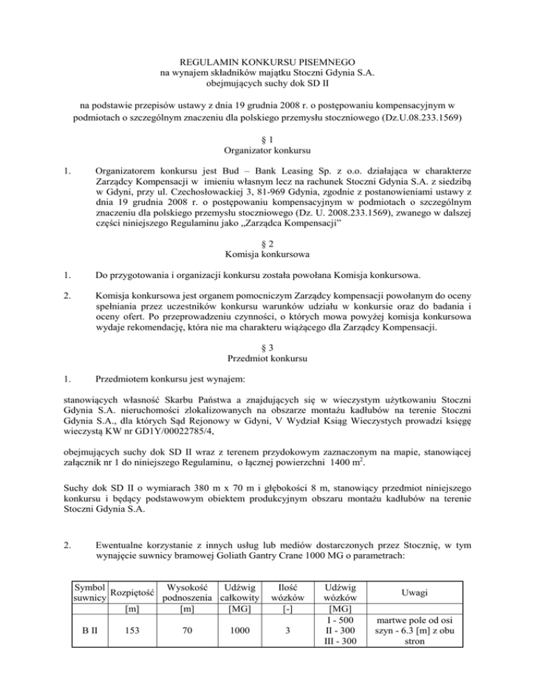 REGULAMIN KONKURSU PISEMNEGO na wynajem składników majątku Stoczni Gdynia S.A. obejmujących suchy dok SD II na podstawie przepisów ustawy z dnia 19 grudnia 2008 r. o postępowaniu kompensacyjnym w podmiotach o szczególnym znaczeniu dla polskiego przemysłu stoczniowego (Dz.U.08.233.1569) §1 Organizator konkursu 1. Organizatorem konkursu jest Bud – Bank Leasing Sp. z o.o. działająca w charakterze Zarządcy Kompensacji w imieniu własnym lecz na rachunek Stoczni Gdynia S.A. z siedzibą w Gdyni, przy ul. Czechosłowackiej 3, 81-969 Gdynia, zgodnie z postanowieniami ustawy z dnia 19 grudnia 2008 r. o postępowaniu kompensacyjnym w podmiotach o szczególnym znaczeniu dla polskiego przemysłu stoczniowego (Dz. U. 2008.233.1569), zwanego w dalszej części niniejszego Regulaminu jako „Zarządca Kompensacji” §2 Komisja konkursowa 1. Do przygotowania i organizacji konkursu została powołana Komisja konkursowa. 2. Komisja konkursowa jest organem pomocniczym Zarządcy kompensacji powołanym do oceny spełniania przez uczestników konkursu warunków udziału w konkursie oraz do badania i oceny ofert. Po przeprowadzeniu czynności, o których mowa powyżej komisja konkursowa wydaje rekomendację, która nie ma charakteru wiążącego dla Zarządcy Kompensacji. §3 Przedmiot konkursu 1. Przedmiotem konkursu jest wynajem: stanowiących własność Skarbu Państwa a znajdujących się w wieczystym użytkowaniu Stoczni Gdynia S.A. nieruchomości zlokalizowanych na obszarze montażu kadłubów na terenie Stoczni Gdynia S.A., dla których Sąd Rejonowy w Gdyni, V Wydział Ksiąg Wieczystych prowadzi księgę wieczystą KW nr GD1Y/00022785/4, obejmujących suchy dok SD II wraz z terenem przydokowym zaznaczonym na mapie, stanowiącej załącznik nr 1 do niniejszego Regulaminu, o łącznej powierzchni 1400 m2. Suchy dok SD II o wymiarach 380 m x 70 m i głębokości 8 m, stanowiący przedmiot niniejszego konkursu i będący podstawowym obiektem produkcyjnym obszaru montażu kadłubów na terenie Stoczni Gdynia S.A. 2. Ewentualne korzystanie z innych usług lub mediów dostarczonych przez Stocznię, w tym wynajęcie suwnicy bramowej Goliath Gantry Crane 1000 MG o parametrach: Symbol Wysokość Udźwig Rozpiętość suwnicy podnoszenia całkowity [m] [m] [MG] B II 153 70 1000 Ilość wózków [-] 3 Udźwig wózków [MG] I - 500 II - 300 III - 300 Uwagi martwe pole od osi szyn - 6.3 [m] z obu stron oraz 4 żurawi o udźwigu: 150 MG÷20MG (wysokość podnoszenia 50 m), nie jest przedmiotem konkursu i wymaga odrębnych uzgodnień §4 Okres najmu 1. Na czas nieoznaczony. 2. Zarządca Kompensacji uprawniony jest do wypowiedzenia najmu z zachowaniem jednomiesięcznego okresu wypowiedzenia, bez konieczności wskazywania przyczyn wypowiedzenia. §5 Termin i miejsce oględzin przedmiotu konkursu 1. Oględzin przedmiotu najmu można dokonać w dniach od 08-02-2010 r. do 19-02-2010 r. w godz. od 8.00 do 15.00 po wcześniejszym, telefonicznym uzgodnieniu terminu (Pan Zbigniew Konieczka - tel. (58) 627 76 41). Dodatkowych informacji udzielał będzie Pan Tadeusz Sakowicz w dni robocze w siedzibie Stoczni Gdynia S.A., tel. (58) 627 15 30. §6 Ogłoszenie o konkursie oraz termin składania ofert 1. Ogłoszenie o konkursie zostanie zamieszczone w prasie codziennej o charakterze ogólnopolskim oraz na stronach internetowych Stoczni Gdynia S.A. 2. Pisemne oferty z proponowaną wysokością miesięcznej stawki najmu uwzględniającą wszelkie opłaty i podatki o charakterze publiczno-prawnym, związane z korzystaniem z suchego doku SD II, zgodnie z obowiązującymi przepisami prawa określającymi warunki, wysokość oraz terminy płatności tych świadczeń należy złożyć w zaklejonych kopertach z dopiskiem „Konkurs na wynajem SD II” w siedzibie Stoczni Gdynia S.A. przy ul. Czechosłowackiej 3, 81-969 Gdynia bądź wysłać na wskazany adres Stoczni Gdynia S.A. w terminie do dnia 22-02-2010 r. do godz. 15.00. 3. Złożenie oferty po terminie wskazanym powyżej skutkuje odrzuceniem złożonej oferty. §7 Wymogi formalne ofert 1. W szczególności, każda z ofert powinna zawierać: 1) nazwę firmy i siedzibę oferenta albo imię, nazwisko i adres zamieszkania, jeżeli oferentem jest osoba fizyczna, adres do korespondencji, adres e-mail, numer telefonu kontaktowego, 2) aktualny odpis z właściwego rejestru (np. z KRS) bądź zaświadczenie z właściwej ewidencji, 3) dokument pełnomocnictwa dla osoby podpisującej ofertę, o ile jej uprawnienia nie wynikają z dokumentu określonego w pkt 2 powyżej 4) składniki majątku Stoczni, stanowiące przedmiot konkursu, 5) proponowaną wysokość miesięcznej stawki czynszu obejmującą kwotę netto + podatek VAT, 6) zaświadczenie z urzędu skarbowego oraz z właściwego oddziału ZUS potwierdzające, że oferent nie zalega z opłacaniem podatków, opłat oraz składek na ubezpieczenia społeczne, wystawione nie wcześniej niż 2 miesiące przed terminem składania ofert, 7) oświadczenie oferenta, że nie wszczęto wobec niego postępowania upadłościowego lub nie została ogłoszona upadłość, 8) oświadczenie oferenta, że zapoznał się z warunkami konkursu i regulaminem oraz że przyjmuje te warunki bez zastrzeżeń. 9) oświadczenie o posiadanym ubezpieczeniu od odpowiedzialności cywilnej do kwoty 1.000.000,00 zł 2. Oferenci ponoszą wszelkie koszty związane ze złożeniem oferty. §8 Obciążenia Prawo użytkowania wieczystego nieruchomości gruntowych wraz z prawem własności znajdujących się na nich budynków i budowli, które stanowią przedmiot niniejszego konkursu, a które ujawnione są w księdze wieczystej KW nr GD1Y/00022785/4 prowadzonej przez Sąd Rejonowy w Gdyni, V Wydział Ksiąg Wieczystych obciążone jest hipotekami na rzecz wierzycieli Stoczni Gdynia S.A. §9 Termin i tryb przeprowadzenia konkursu oraz ocena ofert 1. Konkurs na wynajem suchego doku SD II będzie dwuetapowy. 2. Otwarcie ofert odbędzie się w dniu 23-02-2010 r. o 