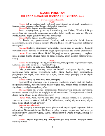 KANON POKUTNY DO PANA NASZEGO JEZUSA CHRYSTUSA. Ton 6: Zwykły początek i Psalm 50. Pieśń 1 Hirmos: Jak po suchym lądzie wędrował Izrael stopami po otchłani i prześladowcę faraona widząc tonącego, wołał: Bogu zwycięską pieśń śpiewajmy. Stichos: Zmiłuj się nade mną, Boże, zmiłuj się. Teraz przystąpiłem, grzeszny i utrudzony, do Ciebie, Władcy i Boga mego, lecz nie mam odwagi patrzeć na niebo, tylko modlę się, mówiąc: Daj mi, Panie, rozum, abym gorzko opłakiwał me czyny! Stichos: Zmiłuj się nade mną, Boże, zmiłuj się. O, biada mi, grzesznemu! Bardziej od wszystkich ludzi jestem nieszczęsny, nie ma we mnie pokuty. Daj mi, Panie, łzy, abym gorzko opłakiwał me czyny! Chwała: Szalony, nieszczęsny człowieku, tracisz czas w lenistwie! Pomyśl o swoim życiu i nawróć się do Pana Boga, i płacz gorzko nad swymi grzechami! I teraz: Przeczysta Matko Boża! Wejrzyj na mnie, grzesznego, i wybaw mnie z sieci diabła, skieruj mnie na drogę pokuty, abym gorzko opłakiwał me czyny! Pieśń 3 Hirmos: Nie ma świętego jako Ty, Panie Boże mój, któryś podniósł róg wiernych Twych, Łaskawy, i umocniłeś nas na opoce wyznania Twego. Stichos: Zmiłuj się nade mną, Boże, zmiłuj się. Gdy postawione zostaną trony na bojaźń budzącym Sądzie, wtedy ujawnione będą czyny wszystkich ludzi, biada będzie tam grzesznikom posyłanym na męki, więc wiedząc o tym, duszo moja, pokajaj się ze złych twych czynów. Stichos: Zmiłuj się nade mną, Boże, zmiłuj się. Sprawiedliwi rozradują się, a grzeszni zapłaczą, wtedy nikt nie będzie mógł nam pomóc, bowiem czyny nasze osądzą nas, przeto przed końcem kajaj się, duszo, ze złych swych czynów. Chwała: Biada mi, wielce grzesznemu! Skalawszy się czynami i myślami, nie mam nawet kropli łez ze względu na okrutne serce! Teraz powstań z ziemi, duszo moja, i kajaj się za złe twoje czyny! I teraz: Oto, Pani, wzywa nas Syn Twój i naucza dobra, a ja, grzeszny, zawsze uciekam od dobra! Jednak Ty, Miłosierna, zmiłuj się nade mną, abym kajał się ze złych swych czynów! Katyzma poetycka, ton 6: Gdy pomyślę o strasznym dniu, płaczę nad mymi złymi czynami: Jakże odpowiem Nieśmiertelnemu Królowi, z jaką odwagą wejrzę na Sędziego, ja marnotrawny? Łaskawy Ojcze, Synu Jednorodzony i Duchu Święty, zmiłuj się nade mną! Pieśń 4 Hirmos: Chrystus moją mocą, Bóg i Pan, śpiewa i głosi Boży Kościół, i z czystym sercem weseli się w Panu. 1 Stichos: Zmiłuj się nade mną, Boże, zmiłuj się. Szeroka jest tutaj droga i łatwo czynić rzeczy przyjemne, lecz gorzko będzie w dniu ostatnim, gdy dusza będzie oddzielać się od ciała! Chroń siebie od tego, człowieku, ze względu na królestwo Boże! Stichos: Zmiłuj się nade mną, Boże, zmiłuj się. Dlaczego biedaka znieważasz, zabierasz mu zapłatę robotnika, brata swego nie lubisz, dążysz do nierządu i pychy? Porzuć wszystko to, duszo moja, kajaj się ze względu na królestwo Boże! Chwała: O, szalony człowieku! Dokąd zabierzesz, jak pszczoła, gromadząc swoje bogactwo? Przecież wkrótce ono zginie jak proch i popiół, ale ty przedtem znajdź królestwo Boże! I teraz: Pani Bogurodzico! Zmiłuj się nade mną, grzesznym i umocnij w cnocie, zachowaj mnie, aby nagła śmierć nie pochwyciła mnie, nieprzygotowanego, i doprowadź mnie, Dziewico, do królestwa Bożego! Pieśń 5 Hirmos: Bożą Twoją światłością, Dobry, od poranku czuwających Tobie dusze oświeć miłością, modlę się, aby poznać Ciebie, Słowo Boże, prawdziwego Boga, i wołam z ciemności grzechu. Stichos: Zmiłuj się nade mną, Boże, zmiłuj się. Wspomnij, nieszczęsny człowieku, jak bardzo jesteś zniewolony przez kłamstwo, oszczerstwo, rozbój i niemoce, dosłownie jak przez dzikie zwierzęta, swoimi grzechami! Duszo moja grzeszna, czyż tego pragnęłaś? Stichos: Zmiłuj się nade mną, Boże, zmiłuj się. Drżą członki mego ciała, bowiem wszystkimi zgrzeszyłem: oczyma patrząc, uszami słuchając, językiem mówiąc zło, całego siebie oddałem gehennie! Duszo moja grzeszna, czyż tego pragnęłaś? Chwała: Syna marnotrawnego i zbójcę kajającego się przyjąłeś do siebie, Zbawco, lecz tylko ja jeden jestem tak zrozpaczony przez grzeszne lenistwo i zniewolony przez złe czyny! Duszo moja grzeszna, czyż tego pragnęłaś? I teraz: Przedziwna i szybka pomocnico wszystkich ludzi, Matko Boża! Pomóż mnie, niegodnemu, bowiem dusza moja grzeszna zapragnęła tego! Pieśń 6 Hirmos: Morze życia wzburzone widząc przez burzę pokus przybiegam do cichej Twej przystani i wołam do Ciebie: Wyprowadź ze zniszczenia życie moje, wielce miłosierny. Stichos: Zmiłuj się nade mną, Boże, zmiłuj się. Życie ziemskie spędziłem marnotrawnie i duszę oddałem ciemności, teraz zaś błagam Ciebie, miłosierny Władco: Wyzwól mnie z tej niewoli wroga i daj mi rozum, abym pełnił Twoją wolę. Stichos: Zmiłuj się nade mną, Boże, zmiłuj się. Kto uczynił coś takiego jak ja? Jak bowiem świnia leży w gnoju, tak i ja służę grzechowi. Jednak Ty, Panie, wyrwij mnie z tej podłości i daj mi serce, abym pełnił Twoje przykazania! Stichos: Zmiłuj się nade mną, Boże, zmiłuj się. Chwała: Powstań dla Boga, nieszczęsny człowieku, wspomnij swoje grzechy, przypadając do Stwórcy, wylewając łzy i jęcząc! On zaś jako miłosierny, da tobie rozum, abyś poznał Jego wolę! 2 Bogurodzico Dziewico! Zachowaj mnie od zła widzialnego i niewidzialnego, Przeczysta, i przyjmij moje prośby, przekaż je Twemu Synowi, aby dał mi rozum pełnić Jego wolę! I teraz: Kontakion: Duszo moja! Dlaczego bogacisz się grzechami? Dlaczego spełniasz wolę diabła? W czym pokładasz swoje nadzieje? Przestań tak postępować i nawróć się do Boga, z płaczem wołając: Miłosierny Panie, zmiłuj się nade mną, grzesznym! Ikos: Pomyśl, duszo moja, o gorzkim czasie śmierci i o Sądzie Ostatecznym, sprawowanym przez twego Stw