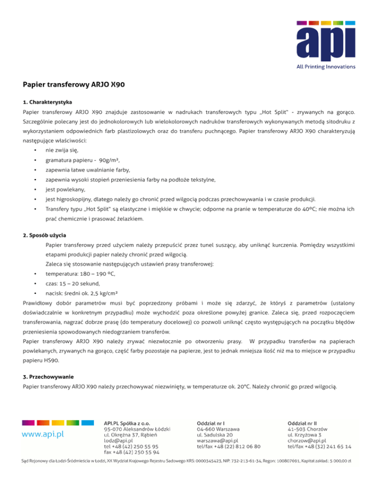 Papier transferowy ARJO X90 1. Charakterystyka Papier transferowy ARJO X90 znajduje zastosowanie w nadrukach transferowych typu „Hot Split“ - zrywanych na gorąco. Szczególnie polecany jest do jednokolorowych lub wielokolorowych nadruków transferowych wykonywanych metodą sitodruku z wykorzystaniem odpowiednich farb plastizolowych oraz do transferu puchnącego. Papier transferowy ARJO X90 charakteryzują następujące właściwości: • nie zwija się, • gramatura papieru - 90g/m², • zapewnia łatwe uwalnianie farby, • zapewnia wysoki stopień przeniesienia farby na podłoże tekstylne, • jest powlekany, • jest higroskopijny, dlatego należy go chronić przed wilgocią podczas przechowywania i w czasie produkcji. • Transfery typu „Hot Split“ są elastyczne i miękkie w chwycie; odporne na pranie w temperaturze do 40ºC; nie można ich prać chemicznie i prasować żelazkiem. 2. Sposób użycia Papier transferowy przed użyciem należy przepuścić przez tunel suszący, aby uniknąć kurczenia. Pomiędzy wszystkimi etapami produkcji papier należy chronić przed wilgocią. Zaleca się stosowanie następujących ustawień prasy transferowej: • temperatura: 180 – 190 ºC, • czas: 15 – 20 sekund, • nacisk: średni ok. 2,5 kg/cm² Prawidłowy dobór parametrów musi być poprzedzony próbami i może się zdarzyć, że któryś z parametrów (ustalony doświadczalnie w konkretnym przypadku) może wychodzić poza określone powyżej granice. Zaleca się, przed rozpoczęciem transferowania, nagrzać dobrze prasę (do temperatury docelowej) co pozwoli uniknąć często występujących na początku błędów przeniesienia spowodowanych niedogrzaniem transferów. Papier transferowy ARJO X90 należy zrywać niezwłocznie po otworzeniu prasy. W przypadku transferów na papierach powlekanych, zrywanych na gorąco, część farby pozostaje na papierze, jest to jednak mniejsza ilość niż ma to miejsce w przypadku papieru HS90. 3. Przechowywanie Papier transferowy ARJO X90 należy przechowywać niezwinięty, w temperaturze ok. 20°C. Należy chronić go przed wilgocią. 4. Opakowanie Papier transferowy ARJO X90 jest dostępny w arkuszach formatu B1(100x70 cm) lub B4 (25x35 cm). Wierzymy, że nasze porady techniczne i zalecenia przekazywane ustnie, pisemnie lub za pomocą prób są prawidłowe. Jednocześnie nie są one wiążące, również w stosunku do ewentualnych praw stron trzecich i nie zwalniają one Państwa z zadania sprawdzenia właściwości naszych produktów odnośnie planowanego ich wykorzystania. Nie ponosimy żadnej odpowiedzialności za wykorzystanie i metody produkcji, które znajdują się poza naszą kontrolą.
