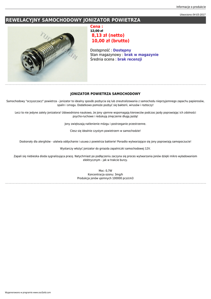 Informacje o produkcie Utworzono 04-03-2017 REWELACYJNY SAMOCHODOWY JONIZATOR POWIETRZA Cena : 12,00 zł 8,13 zł (netto) 10,00 zł (brutto) Dostępność : Dostępny Stan magazynowy : brak w magazynie Średnia ocena : brak recenzji JONIZATOR POWIETRZA SAMOCHODOWY Samochodowy "oczyszczacz" powietrza - jonizator to idealny sposób pozbycia się lub zneutralizowania z samochodu nieprzyjemnego zapachu papierosów, spalin i smogu. Dodatkowo pomoże pozbyć się bakterii, wirusów i roztoczy! Lecz to nie jedyne zalety jonizatora! Udowodniono naukowo, że jony ujemne wspomagają kierowców podczas jazdy poprawiając ich zdolności psycho-ruchowe i redukują zmęczenie długą jazdą! Jony zwiększają natlenienie mózgu i postrzeganie przestrzenne. Ciesz się idealnie czystym powietrzem w samochodzie! Doskonały dla alergików - ułatwia oddychanie i usuwa z powietrza bakterie! Ponadto wytwarzające się jony poprawiają samopoczucie! Wystarczy włożyć jonizator do gniazda zapalniczki samochodowej 12V. Zapali się niebieska dioda sygnalizująca pracę. Natychmiast po podłączeniu zaczyna się proces wytwarzania jonów dzięki mikro wyładowaniom elektrycznym - jak w trakcie burzy. Moc: 0,7W Koncentracja ozonu: 3mg/h Produkcja jonów ujemnych 100000 pcs/cm3 Wygenerowano w programie www.oscGold.com
