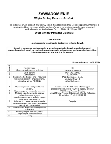 ZAWIADOMIENIE Wójta Gminy Pruszcz Gdański Na podstawie art. 21 oraz art. 173 ustawy z dnia 3 października 2008 r. o udostępnianiu informacji o środowisku i jego ochronie, udziale społeczeństwa w ochronie środowiska oraz o ocenach oddziaływania na środowisko ( Dz.U. z 2008r. Nr 199 poz 1227) Wójt Gminy Pruszcz Gdański ZAWIADAMIA: o umieszczeniu w publicznie dostępnym wykazie danych: Decyzji o umorzeniu postępowania w sprawie o wydanie decyzji o środowiskowych uwarunkowaniach zgody na realizację przedsięwzięcia polegającego na budowie„Innovation Cube nowe centrum innowacji w Straszynie” Pruszcz Gdański 16.02.2009r. Lp. 1 2 3 4 5 6 7 8 9 10 11 12 Numer wpisu Zakres przedmiotowy wniosku Znak sprawy Data złożenia Dane wnioskodawcy ( imię i nazwisko lub nazwa jednostki organizacyjnej, siedziba, adres, REGON) 08 Centrum innowacji OŚ.1.7627/01/09 09.01.2009r. PCB Service sp. z o.o. ul. Żabi Kruk 14 80-822 Gdańsk Wyszczególnienie załączników do wniosku Nazwa organu – adresata wniosku Miejsce przechowywania (nazwa instytucji, nazwa komórki organizacyjnej, numer pokoju, numer telefonu kontaktowego) Informacja o sposobie zakończenia postępowania (numer wpisu w wykazie decyzji lub postanowień Zastrzeżenia dotyczące udostępniania informacji Numery innych kart w wykazie, dotyczących wnioskodawcy Uwagi mapa w skali 1:1000, karta informacyjna przedsięwzięcia, wypis i wyrys z rejestru gruntów Wójt Gminy Pruszcz Gdański Urząd Gminy Pruszcz Gdański, ul. Wojska Polskiego 30, pokój nr 17, tel.0586929425 Decyzja -