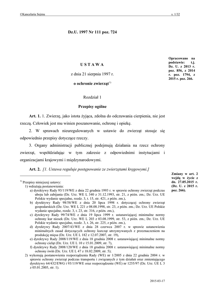 ©Kancelaria Sejmu s. 1/32 Dz.U. 1997 Nr 111 poz. 724 Opracowano na podstawie: t.j. Dz. U. z 2013 r. poz. 856, z 2014 r. poz. 1794, z 2015 r. poz. 266. USTAWA z dnia 21 sierpnia 1997 r. o ochronie zwierząt 1) Rozdział 1 Przepisy ogólne Art. 1. 1. Zwierzę, jako istota żyjąca, zdolna do odczuwania cierpienia, nie jest rzeczą. Człowiek jest mu winien poszanowanie, ochronę i opiekę. 2. W sprawach nieuregulowanych w ustawie do zwierząt stosuje się odpowiednio przepisy dotyczące rzeczy. 3. Organy administracji publicznej podejmują działania na rzecz ochrony zwierząt, współdziałając w tym zakresie z odpowiednimi instytucjami i organizacjami krajowymi i międzynarodowymi. Art. 2. [1. Ustawa reguluje postępowanie ze zwierzętami kręgowymi.] 1) Przepisy niniejszej ustawy: 1) wdrażają postanowienia: a) dyrektywy Rady 93/119/WE z dnia 22 grudnia 1993 r. w sprawie ochrony zwierząt podczas uboju lub zabijania (Dz. Urz. WE L 340 z 31.12.1993, str. 21, z późn. zm.; Dz. Urz. UE Polskie wydanie specjalne, rozdz. 3, t. 15, str. 421, z późn. zm.), b) dyrektywy Rady 98/58/WE z dnia 20 lipca 1998 r. dotyczącej ochrony zwierząt gospodarskich (Dz. Urz. WE L 221 z 08.08.1998, str. 23, z późn. zm.; Dz. Urz. UE Polskie wydanie specjalne, rozdz. 3, t. 23, str. 316, z późn. zm.), c) dyrektywy Rady 99/74/WE z dnia 19 lipca 1999 r. ustanawiającej minimalne normy ochrony kur niosek (Dz. Urz. WE L 203 z 03.08.1999, str. 53, z późn. zm.; Dz. Urz. UE Polskie wydanie specjalne, rozdz. 3, t. 26, str. 225, z późn. zm.), d) dyrektywy Rady 2007/43/WE z dnia 28 czerwca 2007 r. w sprawie ustanowienia minimalnych zasad dotyczących ochrony kurcząt utrzymywanych z przeznaczeniem na produkcję mięsa (Dz. Urz. UE L 182 z 12.07.2007, str. 19), e) dyrektywy Rady 2008/119/WE z dnia 18 grudnia 2008 r. ustanawiającej minimalne normy ochrony cieląt (Dz. Urz. UE L 10 z 15.01.2009, str. 7), f) dyrektywy Rady 2008/120/WE z dnia 18 grudnia 2008 r. ustanawiającej minimalne normy ochrony świń (Dz. Urz. UE L 47 z 18.02.2009, str. 5); 2) wykonują postanowienia rozporządzenia Rady (WE) nr 1/2005 z dnia 22 grudnia 2004 r. w sprawie ochrony zwierząt podczas transportu i związanych z tym działań oraz zmieniającego dyrektywy 64/432/EWG i 93/119/WE oraz rozporządzenie (WE) nr 1255/97 (Dz. Urz. UE L 3 z 05.01.2005, str. 1). 2015-03-17 Zmiany w art. 2 wejdą w życie z dn. 27.05.2015 r. (Dz. U. z 2015 r. poz. 266). ©Kancelaria Sejmu s. 2/32 <1. Ustawa reguluje postępowanie ze zwierzętami kręgowymi, w tym zwierzętami kręgowymi wykorzystywanymi w celach naukowych lub edukacyjnych w zakresie nieuregulowanym w ustawie z dnia 15 stycznia 2015 r. o ochronie zwierząt wykorzystywanych do celów naukowych lub edukacyjnych (Dz. U. poz. 266).> [2. Ustawy nie stosuje się do procedur stanowiących doświadczenie w rozumieniu art. 2 pkt 6 ustawy z dnia 21 stycznia 2005 r. o doświadczeniach na zwierzętach (Dz. U. Nr 33, poz. 289, z późn. zm. 2)).] Art. 3. W celu realizacji przepisów ustawy Inspekcja Weterynaryjna oraz inne właściwe organy administracji rządowej i samorządu terytorialnego współdziałają z samorządem lekarsko-weterynaryjnym oraz z innymi instytucjami i organizacjami społecznymi, których statutowym celem działania jest ochrona zwierząt. Art. 3a. Do postępowań w sprawach: 1) o których mowa w art. 10, art. 13 oraz art. 24a, 2) dotyczących uchylenia, zmiany lub stwierdzenia nieważności decyzji wydanej na podstawie art. 10, art. 13 lub art. 24a oraz w sprawach wznowienia postępowania zakończonego wydaniem takiej decyzji – nie stosuje się przepisów art. 11 ust. 3–9 ustawy z dnia 2 lipca 2004 r. o swobodzie działalności gospodarczej (Dz. U. z 2013 r. poz. 672 i 675) oraz przepisu art. 2 ust. 2 ustawy z dnia 4 marca 2010 r. o świadczeniu usług na terytorium Rzeczypospolitej Polskiej (Dz. U. Nr 47, poz. 278, z późn. zm. 3)). Art. 4. Ilekroć w ustawie jest mowa o: 1) (uchylony); 2) „humanitarnym traktowaniu zwierząt” – rozumie się przez to traktowanie uwzględniające potrzeby zwierzęcia i zapewniające mu opiekę i ochronę; 3) „konieczności bezzwłocznego uśmiercenia” – rozumie się przez to obiektywny stan rzeczy stwierdzony, w miarę możliwości, przez lekarza weterynarii, polegający na tym, że zwierzę może dalej żyć jedynie cierpiąc i znosząc ból, a moralnym obowiązkiem człowieka staje się skrócenie cierpień zwierzęcia; Zmiany wymienionej ustawy zostały ogłoszone w Dz. U. z 2006 r. Nr 171, poz. 1225 i Nr 220, poz. 1600, z 2009 r. Nr 18, poz. 97 oraz z 2011 r. Nr 63, poz. 322 i Nr 106, poz. 622. 3) Zmiany wymienionej ustawy zostały ogłoszone w Dz. U. z 2011 r. Nr 112, poz. 654, Nr 227, poz. 1367 i Nr 228, poz. 1368. 2) 2015-03-17 ©Kancelaria Sejmu 4) s. 3/32 „menażerii objazdowej” – rozumie się przez to przedsiębiorcę wykonującego działalność w zakresie organizowania obwoźnych wystaw zwierząt; 5) (uchylony); 6) „ogłuszaniu zwierzęcia” – rozumie się przez to metodę profesjonalnego całkowitego wyłączenia świadomości zwierzęcia, trwającego aż do jego śmierci; 7) „okrutnych metodach w chowie lub hodowli zwierząt” – rozumie się przez to działania lub zaniechania człowieka prowadzące w sposób oczywisty do zmian patologicznych w organizmie zwierzęcia (somatycznych lub psychicznych), zwłaszcza w postaci skutków znoszenia dotkliwego bólu, przymuszania do określonego zachowania się (uległości) głodem, pragnieniem, działaniem prądu elektrycznego (z wyjątkiem używania pastuchów elektrycznych, treserów oraz urządzeń elektrycznych służących do przepędu zwierząt) bądź innymi zabiegami tego rodzaju, w szczególności karmienie i pojenie zwierząt przemocą; 8) „okrutnym traktowaniu” – rozumie się przez to wymienione w ustawie przypadki znęcania się nad zwierzętami oraz inne postępowanie właściciela bądź innej osoby, prowadzące do skutków porównywalnych