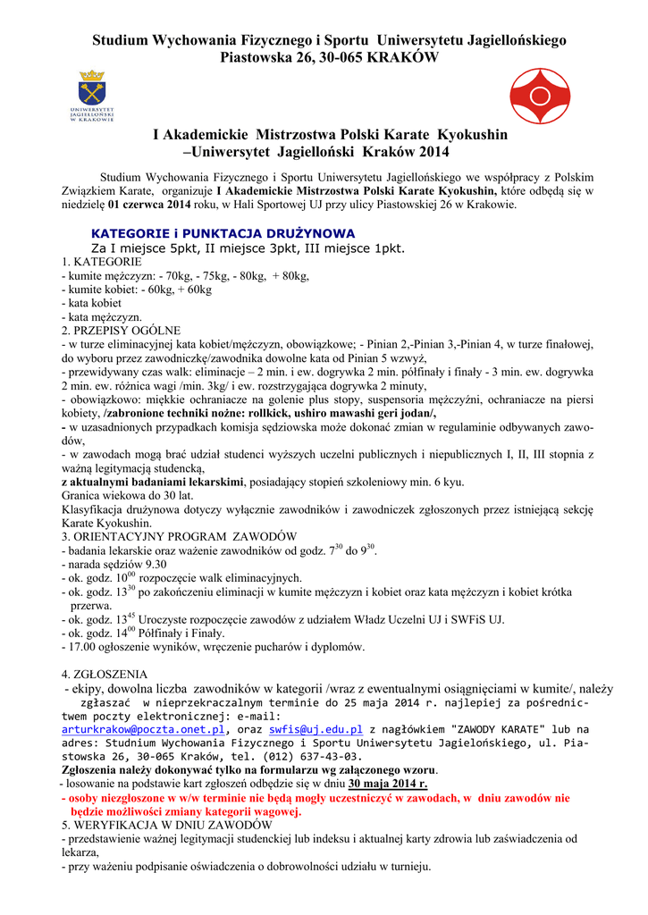 Studium Wychowania Fizycznego i Sportu Uniwersytetu Jagiellońskiego Piastowska 26, 30-065 KRAKÓW I Akademickie Mistrzostwa Polski Karate Kyokushin –Uniwersytet Jagielloński Kraków 2014 Studium Wychowania Fizycznego i Sportu Uniwersytetu Jagiellońskiego we współpracy z Polskim Związkiem Karate, organizuje I Akademickie Mistrzostwa Polski Karate Kyokushin, które odbędą się w niedzielę 01 czerwca 2014 roku, w Hali Sportowej UJ przy ulicy Piastowskiej 26 w Krakowie. KATEGORIE i PUNKTACJA DRUŻYNOWA Za I miejsce 5pkt, II miejsce 3pkt, III miejsce 1pkt. 1. KATEGORIE - kumite mężczyzn: - 70kg, - 75kg, - 80kg, + 80kg, - kumite kobiet: - 60kg, + 60kg - kata kobiet - kata mężczyzn. 2. PRZEPISY OGÓLNE - w turze eliminacyjnej kata kobiet/mężczyzn, obowiązkowe; - Pinian 2,-Pinian 3,-Pinian 4, w turze finałowej, do wyboru przez zawodniczkę/zawodnika dowolne kata od Pinian 5 wzwyż, - przewidywany czas walk: eliminacje – 2 min. i ew. dogrywka 2 min. półfinały i finały - 3 min. ew. dogrywka 2 min. ew. różnica wagi /min. 3kg/ i ew. rozstrzygająca dogrywka 2 minuty, - obowiązkowo: miękkie ochraniacze na golenie plus stopy, suspensoria mężczyźni, ochraniacze na piersi kobiety, /zabronione techniki nożne: rollkick, ushiro mawashi geri jodan/, - w uzasadnionych przypadkach komisja sędziowska może dokonać zmian w regulaminie odbywanych zawodów, - w zawodach mogą brać udział studenci wyższych uczelni publicznych i niepublicznych I, II, III stopnia z ważną legitymacją studencką, z aktualnymi badaniami lekarskimi, posiadający stopień szkoleniowy min. 6 kyu. Granica wiekowa do 30 lat. Klasyfikacja drużynowa dotyczy wyłącznie zawodników i zawodniczek zgłoszonych przez istniejącą sekcję Karate Kyokushin. 3. ORIENTACYJNY PROGRAM ZAWODÓW - badania lekarskie oraz ważenie zawodników od godz. 730 do 930. - narada sędziów 9.30 - ok. godz. 1000 rozpoczęcie walk eliminacyjnych. - ok. godz. 1330 po zakończeniu eliminacji w kumite mężczyzn i kobiet oraz kata mężczyzn i kobiet krótka przerwa. - ok. godz. 1345 Uroczyste rozpoczęcie zawodów z udziałem Władz Uczelni UJ i SWFiS UJ. - ok. godz. 1400 Półfinały i Finały. - 17.00 ogłoszenie wyników, wręczenie pucharów i dyplomów. 4. ZGŁOSZENIA - ekipy, dowolna liczba zawodników w kategorii /wraz z ewentualnymi osiągnięciami w kumite/, należy zgłaszać w nieprzekraczalnym terminie do 25 maja 2014 r. najlepiej za pośrednictwem poczty elektronicznej: e-mail: [email protected], oraz [email protected] z nagłówkiem "ZAWODY KARATE" lub na adres: Studnium Wychowania Fizycznego i Sportu Uniwersytetu Jagielońskiego, ul. Piastowska 26, 30-065 Kraków, tel. (012) 637-43-03. Zgłoszenia należy dokonywać tylko na formularzu wg załączonego wzoru. - losowanie na podstawie kart zgłoszeń odbędzie się w dniu 30 maja 2014 r. - osoby niezgłoszone w w/w terminie nie będą mogły uczestniczyć w zawodach, w dniu zawodów nie będzie możliwości zmiany kategorii wagowej. 5. WERYFIKACJA W DNIU ZAWODÓW - przedstawienie ważnej legitymacji studenckiej lub indeksu i aktualnej karty zdrowia lub zaświadczenia od lekarza, - przy ważeniu podpisanie oświadczenia o dobrowolności udziału w turnieju. Studium Wychowania Fizycznego i Sportu Uniwersytetu Jagiellońskiego Piastowska 26, 30-065 KRAKÓW KARTA ZGŁOSZENIA ZAWODNIKÓW NAZWA I ADRES UCZELNI ….…………….…………………………………………………..................................... Lp. Nazwisko Imię Data ur. kyu/dan Konkurencja 1 2 Kumite mężczyzn - 70kg 3 4 Kumite mężczyzn - 75kg 5 6 Kumite mężczyzn - 80kg 7 8 Kumite mężczyzn + 80kg 9 10 Kumite kobiet -55kg 11 12 Kumite kobiet +55kg 13 14 Kata kobiet 15 16 Kata mężczyzn drużyna I/II
