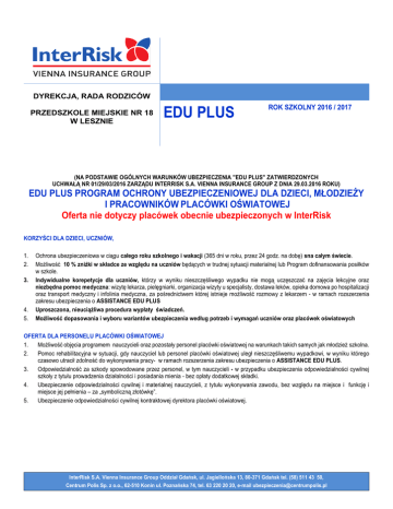 DYREKCJA, RADA RODZICÓW PRZEDSZKOLE MIEJSKIE NR 18 W LESZNIE EDU PLUS ROK SZKOLNY 2016 / 2017 (NA PODSTAWIE OGÓLNYCH WARUNKÓW UBEZPIECZENIA "EDU PLUS" ZATWIERDZONYCH UCHWAŁĄ NR 01/29/03/2016 ZARZĄDU INTERRISK S.A. VIENNA INSURANCE GROUP Z DNIA 29.03.2016 ROKU) EDU PLUS PROGRAM OCHRONY UBEZPIECZENIOWEJ DLA DZIECI, MŁODZIEŻY I PRACOWNIKÓW PLACÓWKI OŚWIATOWEJ Oferta nie dotyczy placówek obecnie ubezpieczonych w InterRisk KORZYŚCI DLA DZIECI, UCZNIÓW, 1. 2. 3. 4. 5. Ochrona ubezpieczeniowa w ciągu całego roku szkolnego i wakacji (365 dni w roku, przez 24 godz. na dobę) sna całym świecie. Możliwość 10 % zniżki w składce ze względu na uczniów będących w trudnej sytuacji materialnej lub Program dofinansowania posiłków w szkole. Indywidualne korepetycje dla uczniów, którzy w wyniku nieszczęśliwego wypadku nie mogą uczęszczać na zajęcia lekcyjne oraz niezbędna pomoc medyczna: wizytę lekarza, pielęgniarki, organizacja wizyty u specjalisty, dostawa leków, opieka domowa po hospitalizacji oraz transport medyczny i infolinia medyczna, za pośrednictwem której istnieje możliwość rozmowy z lekarzem - w ramach rozszerzenia zakresu ubezpieczenia o ASSISTANCE EDU PLUS Uproszczona, nieuciążliwa procedura wypłaty świadczeń. Możliwość dopasowania i wyboru wariantów ubezpieczenia według potrzeb i wymagań uczniów oraz placówek oświatowych OFERTA DLA PERSONELU PLACÓWKI OŚWIATOWEJ 1. Możliwość objęcia programem nauczycieli oraz pozostały personel placówki oświatowej na warunkach takich samych jak młodzież szkolna. 2. Pomoc rehabilitacyjna w sytuacji, gdy nauczyciel lub personel placówki oświatowej uległ nieszczęśliwemu wypadkowi, w wyniku którego czasowo utracił zdolność do wykonywania pracy- w ramach rozszerzenia zakresu ubezpieczenia o ASSISTANCE EDU PLUS. 3. Odpowiedzialność za szkody spowodowane przez personel, w tym nauczycieli - w przypadku ubezpieczenia odpowiedzialności cywilnej szkoły z tytułu prowadzenia działalności i posiadania mienia - bez opłaty dodatkowej składki. 4. Ubezpieczenie odpowiedzialności cywilnej i materialnej nauczycieli, z tytułu wykonywania zawodu, bez względu na miejsce i funkcję i miejsce jej pełnienia – za „symboliczną złotówkę”. 5. Ubezpieczenie odpowiedzialności cywilnej kontraktowej dyrektora placówki oświatowej. InterRisk S.A. Vienna Insurance Group Oddział Gdańsk, ul. Jagiellońska 13, 80-371 Gdańsk tel. (58) 511 43 50, Centrum Polis Sp. z o.o., 62-510 Konin ul. Poznańska 74, tel. 63 220 20 20, e-mail [email protected] OPCJA OCHRONA PLUS Na podstawie OWU EDU PLUS zatwierdzonych uchwałą nr 01/29/03/2016 z dnia 29.03.2016 r. Wysokość świadczenia Rodzaj świadczenia WARIANT II WARIANT III WARIANT IV WARIANT V WARIANT VI suma suma suma suma suma ubezpieczenia ubezpieczenia ubezpieczenia ubezpieczenia ubezpieczenia 16.000 zł 18.000 zł 20.000 zł 25.000 zł 30.000 zł Śmierć Ubezpieczonego w następstwie wypadku komunikacyjnego (suma wypłat) 26.000 zł 28.000 zł 30.000 zł 35.000 zł 40.000 zł Śmierć Ubezpieczonego w wyniku nieszczęśliwego wypadku 16.000 zł 18.000 zł 20.000 zł 25.000 zł 30.000 zł Śmierć Ubezpieczonego w wyniku zawału serca i udar mózgu 16.000 zł 18.000 zł 20.000 zł 25.000 zł 30.000 zł do 4.800 zł do 5.400 zł do 6.000 zł do 7.500 zł do 9.000 zł do 4.800 zł do 5.400 zł do 6.000 zł do 7.500 zł do 9.000 zł 160 zł 180 zł 200 zł 250 zł 300 zł 1.600 zł 1.800 zł 2.000 zł 2.500 zł 3.000 zł Oparzenia w wyniku nieszczęśliwego wypadku do 500 zł do 500 zł do 500 zł do 500 zł do 500 zł Odmrożenia do 500 zł do 500 zł do 500 zł do 500 zł do 500 zł Koszty leczenia stomatologicznego w wyniku wypadku Śmierć rodzica Ubezpieczonego w NNW – jednorazowe świadczenie do 400 zł do 400 zł do 400 zł do 400 zł do 400 zł 1.600 zł 1.800 zł 2.000 zł 2.500 zł 3.000 zł 320 zł 360 zł 400 zł 500 zł 600 zł w zależności od rodzaju wg Tabeli nr 4 w OWU) do 20.000 zł w zależności od rodzaju wg Tabeli nr 4 w OWU) do 25.000 zł w zależności od rodzaju wg Tabeli nr 4 w OWU) do 30.000 zł Zwrot kosztów nabycia wyrobów medycznych, będących przedmiotami ortopedycznymi i środków pomocniczych Zwrot kosztów przekwalifikowania zawodowego osób niepełnosprawnych Z tytułu uszczerbku na zdrowiu w wyniku ataku padaczki – jednorazowe świadczenie Zdiagnozowanie u Ubezpieczonego sepsy – jednorazowe świadczenie Pogryzienie przez psa i inne zwierzęta oraz pokąsanie przez owady – jednorazowe świadczenie (związane z pobytem w szpitalu) Z tytułu trwałego inwalidztwa częściowego Z tytułu złamań kości, zwichnięć lub skręceń stawów w zależności w zależności od rodzaju od rodzaju – 24 ŚWIADCZENIA według (wg Tabeli nr (wg Tabeli nr tabeli nr 4 OWU 4 w OWU) 4 w OWU) do 16.000 zł do 18.000 zł – 30 ŚWIADCZEŃ według tabeli nr 5 OWU w zależności w zależności w zależności w zależności w zależności od rodzaju od rodzaju od rodzaju od rodzaju od rodzaju urazu urazu urazu urazu urazu (wg Tabeli nr (wg Tabeli nr (wg Tabeli nr (wg Tabeli nr (wg Tabeli nr 5 w OWU) 5 w OWU) 5 w OWU) 5 w OWU) 5 w OWU) Z tytułu nagłego zatrucia gazami, substancjami i produktami chemicznymi, bądź z tytułu porażenia prądem lub piorunem 800 900 1.000 1.250 1.500 Z tytułu uszkodzeń ciała w następstwie nieszczęśliwego wypadku, które wymagały interwencji lekarskiej w placówce medycznej oraz leczenia i co najmniej jednej wizyty kontrolnej 240 270 300 375 450 SKŁADKA ROCZNA ZAOSOBĘ Pakiet Podstawowy * 24 zł 27 zł 30 zł 36 zł 43 zł SKŁADKA ROCZNA ZA OSOBĘ W PLACÓWCE Z PAKIETAMI A+B+C 32,50 zł 35,50 zł 38,50 zł 44,50 zł 51,50 zł "Za zapłatą dodatkowej składki 30% InterRisk TU S.A. Vienna Insurance Group udziela również ochrony osobom wyczynowo uprawiającym sport, tj. biorącym udział w: a) treningach, zawodach, zgrupowaniach i obozach kondycyjnych lub szkoleniowych w ramach pozasz