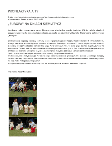 PROFILAKTYKA A TY Źródło: http://pat.policja.gov.pl/pat/wydarzenia/764,Europa-na-Dniach-Siemiatycz.html Wygenerowano: Sobota, 4 marca 2017, 03:20 „EUROPA” NA DNIACH SIEMIATYCZ Każdego roku czerwcową porą Siemiatycze obchodzą swoje święto. Wśród wielu atrakcji przygotowanych dla mieszkańców miasta, znalazło się również widowisko historyczno-patriotyczne „Europa”. Dni Siemiatycz rozpoczął kolorowy teatralny korowód poprzedzający XI Przegląd Teatrów Szkolnych i Przedszkolnych, którego zwycięzcą okazała się grupa teatralna z Szerszeń. Teatralnym akcentem 11 czerwca był natomiast spektakl plenerowy „Europa” w obsadzie siemiatyckiej grupy PaT z Gimnazjum Nr 1. Ta sama grupa 21 maja zagrała „Europę” na warszawskiej Cytadeli podczas ogólnopolskiego spotkania grup rekonstrukcyjnych. Tym razem scenerią dla spektaklu był amfiteatr nad zalewem, gdzie przez cały dzień trwała impreza muzyczna pod nazwą Siemiatycze Flow Festiwal. Oprócz przedstawień teatralnych odbyły się także koncerty Edyty Geppert i Lombard. Warto dodać, iż siemiatycka grupa PaT działa dzięki wsparciu dyrektora gimnazjum nr 1 Janusza Łopuskiego, zastępcy dyrektora Barbary Kłopotowskiej, burmistrza miasta Siemiatycze Piotra Siniakowicza oraz Komendanta Powiatowego Policji mł. insp. Piotra Prokopczuka. Dziękujemy! Koordynatorem programu PaT w Siemiatyczach jest Elżbieta Jakubiuk, a liderem Aleksandra Krzysztoń. foto: Monika Kaiser-Maciejczak Ocena: 0/5 (0) Tweetnij