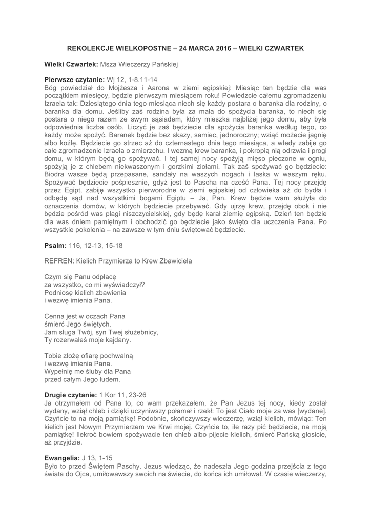 REKOLEKCJE WIELKOPOSTNE – 24 MARCA 2016 – WIELKI CZWARTEK Wielki Czwartek: Msza Wieczerzy Pańskiej Pierwsze czytanie: Wj 12, 1-8.11-14 Bóg powiedział do Mojżesza i Aarona w ziemi egipskiej: Miesiąc ten będzie dla was początkiem miesięcy, będzie pierwszym miesiącem roku! Powiedzcie całemu zgromadzeniu Izraela tak: Dziesiątego dnia tego miesiąca niech się każdy postara o baranka dla rodziny, o baranka dla domu. Jeśliby zaś rodzina była za mała do spożycia baranka, to niech się postara o niego razem ze swym sąsiadem, który mieszka najbliżej jego domu, aby była odpowiednia liczba osób. Liczyć je zaś będziecie dla spożycia baranka według tego, co każdy może spożyć. Baranek będzie bez skazy, samiec, jednoroczny; wziąć możecie jagnię albo koźlę. Będziecie go strzec aż do czternastego dnia tego miesiąca, a wtedy zabije go całe zgromadzenie Izraela o zmierzchu. I wezmą krew baranka, i pokropią nią odrzwia i progi domu, w którym będą go spożywać. I tej samej nocy spożyją mięso pieczone w ogniu, spożyją je z chlebem niekwaszonym i gorzkimi ziołami. Tak zaś spożywać go będziecie: Biodra wasze będą przepasane, sandały na waszych nogach i laska w waszym ręku. Spożywać będziecie pośpiesznie, gdyż jest to Pascha na cześć Pana. Tej nocy przejdę przez Egipt, zabiję wszystko pierworodne w ziemi egipskiej od człowieka aż do bydła i odbędę sąd nad wszystkimi bogami Egiptu – Ja, Pan. Krew będzie wam służyła do oznaczenia domów, w których będziecie przebywać. Gdy ujrzę krew, przejdę obok i nie będzie pośród was plagi niszczycielskiej, gdy będę karał ziemię egipską. Dzień ten będzie dla was dniem pamiętnym i obchodzić go będziecie jako święto dla uczczenia Pana. Po wszystkie pokolenia – na zawsze w tym dniu świętować będziecie. Psalm: 116, 12-13, 15-18 REFREN: Kielich Przymierza to Krew Zbawiciela Czym się Panu odpłacę za wszystko, co mi wyświadczył? Podniosę kielich zbawienia i wezwę imienia Pana. Cenna jest w oczach Pana śmierć Jego świętych. Jam sługa Twój, syn Twej służebnicy, Ty rozerwałeś moje kajdany. Tobie złożę ofiarę pochwalną i wezwę imienia Pana. Wypełnię me śluby dla Pana przed całym Jego ludem. Drugie czytanie: 1 Kor 11, 23-26 Ja otrzymałem od Pana to, co wam przekazałem, że Pan Jezus tej nocy, kiedy został wydany, wziął chleb i dzięki uczyniwszy połamał i rzekł: To jest Ciało moje za was [wydane]. Czyńcie to na moją pamiątkę! Podobnie, skończywszy wieczerzę, wziął kielich, mówiąc: Ten kielich jest Nowym Przymierzem we Krwi mojej. Czyńcie to, ile razy pić będziecie, na moją pamiątkę! Ilekroć bowiem spożywacie ten chleb albo pijecie kielich, śmierć Pańską głosicie, aż przyjdzie. Ewangelia: J 13, 1-15 Było to przed Świętem Paschy. Jezus wiedząc, że nadeszła Jego godzina przejścia z tego świata do Ojca, umiłowawszy swoich na świecie, do końca ich umiłował. W czasie wieczerzy, gdy diabeł już nakłonił serce Judasza Iskarioty syna Szymona, aby Go wydać, wiedząc, że Ojciec dał Mu wszystko w ręce oraz że od Boga wyszedł i do Boga idzie, wstał od wieczerzy i złożył szaty. A wziąwszy prześcieradło nim się przepasał. Potem nalał wody do miednicy. I zaczął umywać uczniom nogi i ocierać prześcieradłem, którym był przepasany. Podszedł więc do Szymona Piotra, a on rzekł do Niego: Panie, Ty chcesz mi umyć nogi? Jezus mu odpowiedział: Tego, co Ja czynię, ty teraz nie rozumiesz, ale później będziesz to wiedział. Rzekł do Niego Piotr: Nie, nigdy mi nie będziesz nóg umywał. Odpowiedział mu Jezus: Jeśli cię nie umyję, nie będziesz miał udziału ze Mną. Rzekł do Niego Szymon Piotr: Panie, nie tylko nogi moje, ale i ręce, i głowę. Powiedział do niego Jezus: Wykąpany potrzebuje tylko nogi sobie umyć, bo cały jest czysty. I wy jesteście czyści, ale nie wszyscy. Wiedział bowiem, kto Go wyda, dlatego powiedział: Nie wszyscy jesteście czyści. A kiedy im umył nogi, przywdział szaty i znów zajął miejsce przy stole, rzekł do nich: Czy rozumiecie, co wam uczyniłem? Wy Mnie nazywacie Nauczycielem i Panem i dobrze mówicie, bo nim jestem. Jeżeli więc Ja, Pan i Nauczyciel, umyłem wam nogi, to i wyście powinni sobie nawzajem umywać nogi. Dałem wam bowiem przykład, abyście i wy tak czynili, jak Ja wam uczyniłem. Temat dnia: Eucharystia – sakrament miłosierdzia Słowo dnia: „Jezus, wiedząc, że nadeszła Jego godzina przejścia z tego świata do Ojca, umiłowawszy swoich na świecie, do końca ich umiłował” (J 13,1). Medytacja: Dzięki Komunii świętej otrzymujemy łaskę miłości. By pokochać naszego Pana jak przyjaciela, potrzebujemy specjalnej łaski. Jezus przynosi ją nam, gdy obdarowuje swoją obecnością naszą duszę. Przed Ostatnią Wieczerzą Pan nie wymagał od uczniów, by potrafili kochać tak, jak On ich kochał. Nie mówił: „Trwajcie w miłości mojej”. Wtedy by jeszcze tego nie zrozumieli. Po Ostatniej Wieczerzy poleca im nie tylko, by kochali Boga i bliźniego. Prosi, by pokochali Go jak brata, jak kogoś bliskiego, miłością, która jest życiem, prawem życia. […] Po Ostatniej Wieczerzy nasz Pan powiedział Apostołom: „Już Was nie nazywam sługami”. Jak więc nazwiesz ich, Panie? Chwałą Boga, Mocą Boga, Lekarstwem Boga, Ogniem Boga… jak Archaniołów? Nazwę przyjaciółmi. „(…) Nazwałem was przyjaciółmi, albowiem oznajmiłem wam wszystko, co usłyszałem od Ojca mego”. Jesteście Moimi przyjaciółmi, bowiem powierzyłem wam Mój największy sekret. […] Im częściej będziecie Mnie przyjmować, tym bardziej rozszerzy się wasze serce, tym żarliwsza będzie wasza miłość, czulsza i gorętsza, a jej płomień – intensywniejszy. Jezus składa w nas łaskę miłości. To On sam przychodzi do naszych wnętrz rozpalić w nas jej ogień. Podtrzymuje go dzięki swoim częstym odwiedzinom, roznieca go, m