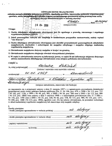 OSWIADCZENIE MAJ~TKOWE I I , .' - , .,."'-I , .--..-... .....,",,J Uwaga: 1........c ,:!- c,!, i,i 1 ..-.--.J .. . K :o ;: r, , , ~ 4r.r n k 9 ....................dnia28. ........... . . . . 1. .',: 2 8 -04- 2006 7 ,. .. ., < _ , ! , >.,<.>: i . . ..... ~ ....... .d ?., . i; (miejscowo~s .' z prawdq, starannego i zupdnego .. wypelnienia pnypadku zastosowania, naleZy wpisa6 "nie dotyczy". 3. Osoba skladajqca oiwiadczenie obowiqzana jest okreMit przynaleinoi6 poszczeg6lnych skladnik6w majqtkowych, dochod6w i zobowiqzan do majqtku odrebnego i majqtku objetego malieliskq wsp6lnohciq majqtkowq. 4. Oiwiadczenie majqtkowe dotyczy majqtku w kraju i za granicq. 5. mwiadczenie majqtkowe obejmuje r6wniei wienytelnoici pienieine. 6. W czeici A oiwiadczenia zawarte sq informacje jawne, w czeici B zah informacje niejawne dotyczqce adresu zamieszkania skladajqcego ohviadczenie oraz miejsca poloienia nieruchomohci. CZ&~A C Ja, nizej podpisanyM &/XU 4 ...................................................................................................................................... , (imiona i nazwisko oraz nazwisko rodowe) ................." ................... ..................................................................................................................................... (miejsce zatrudnienia, stanowisko lub funkcja) po zapoznaniu siq z przepisarni ustawy z dnia 21 sierpnia 1997 r. o ograniczeniu prowadzenia dziaialnoici gospodarczej przez osoby pehiqce funkcje publiczne (Dz. U. Nr 106, poz. 679, z 1998 r. Nr 113, poz. 715 i Nr 162, poz. 1126, z 1999 r. Nr 49, poz. 483, z 2000 r. Nr 26, poz. 306 oraz z 2002 r. Nr 113, poz. 984 i Nr 214, poz. 1806) oraz ustawy z dnia 5 czerwca 1998 r. o sarnorzqdzie powiatowym (Dz. U. z 2001 r. Nr 142, poz. 1592 oraz z 2002 r. Nr 23, poz. 220, Nr 62, poz. 558, Nr 113, poz. 984, Nr 153, poz. 1271, Nr 200, poz. 1688 i Nr 214, poz. 1806), zgodnie z art. 25c tej ustawy oiwiadczam, ie posiadam wchodzqce w skiad maizehskiej wsp6lnoici majqtkowej lub stanowiqce m6j majqtek odrqbny: Zasoby pieniqine: - irodki pieniqzne zgromadzone w walucie polskiej: - irodki pieniqkne zgromadzone w walucie obcej: - papiery wartoiciowe: ................................................................. .................................... na kwotq: ................................................ ..............."................. .................... .M............................ @&.fi*/ ................................................................................................................................. M.e....... .... . n. Al%4utorc' &wny: ................................ 1. Dom o powierrchni: .................&. m2,o wartoici: ..................... &4? QslC 2. Mieszkanie o powierzchni: ........6Q.m2, o wartoki: & . @?!?$.&utl prawny: ............................... 3. Gospodarstwo rolne: rodzaj gospodarstwa: , powierzchnia: ................................... o wartosci: ................................... ...... .................................... rodzaj zabudowy: ....................... .. tytul prawny: ~TQ,(;( .... 4. Inne nieruchomoici: powierzchnia: ........................... r / ..@e..... . . . . B ~ ............................................................................. #~ o wartosci: tytul prawny: - naleiy podaC liczbq i emitenta udzial6w: .................................... .................................................................................................................................. handlowych ........&. ... udzialy te stanowiq pakiet wiqkszy niz 10% udzial6w w space: Z tego tytulu osiqgnqlem(qlam) w roku ubieglym doch6d w wysokoici: ........................... IV. Posiadam akcje w sp6lkach handlowych - naleiy podaC liczbq i emitenta akcji: ....... .......................... akcje te stanowiq pakiet wiqkszy nii 10% akcji w sp6lce: ............................. Z tego tytulu osicgnqlem(q4am) w roku ubieglym doch6d w wysokoici: .......... Nabylem(am) (nabyl m6j malzonek, z wylqczeniem mienia przynaleznego do jego majqtku odrqbnego) od Skarbu Paristwa, innej patistwowej osoby prawnej, jednostek samorzqdu terytorialnego, ich zwiqzkow lub od kornunalnej osoby prawnej nastqpujqce w drodze przetargu - naleiy podaC opis mienia i date nabycia, od kogo: ..................................................... VI. (naleky podaC forme prawnq i przedmiot dzialalnobci): ....................... - osobibcie ........ ..... ........................................................................................................................................................................ - wsp6lnie z innymi osobami .....&@ .....&$ .@ 'f ................................................................................. ...................................................................................................................................................................... Z tego tytulu osiqgnqlem(qlam) w roku ubieglym przych6d i doch6d w wysokogci: ......& f?....de 2. Zarqdzam dzialalnoiciq gospodarcq lub jestem przedstawiciele~,pehom c ikiem takiej dzialalnobci (naleky p d a i forme prawnq i ..........fie.......@?fg7 ................................ - osobiicie .......................... . ................................................................................. - wsp6lnie z innymi osobami ...... ......... Z tego tytulu osizgnqlem(elam) w roku ubieglym doch6d w wysokoici: WI. 1. W sp6lkach handlowych (nazwa, siedziba sp6lki): ............ ............................................. ........................................................................................................................................................................ - jestem czlonkiem zarqdu (od kiedy): .......................................................................................... .. ...... - jestem czlonkiem rady nadzorczej (od kiedy): ...........................................................................................