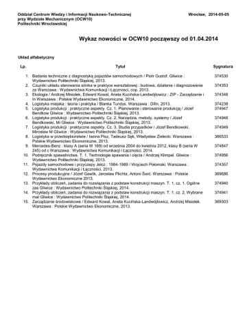 Oddział Centrum Wiedzy i Informacji Naukowo-Technicznej przy Wydziale Mechanicznym (OCW10) Politechniki Wrocławskiej Wrocław, 2014-05-05 Wykaz nowości w OCW10 począwszy od 01.04.2014 Układ alfabetyczny Lp. Tytuł 1. Badania techniczne z diagnostyką pojazdów samochodowych / Piotr Gustof. Gliwice : Wydawnictwo Politechniki Śląskiej, 2013. 2. Czujniki układu sterowania silnika w praktyce warsztatowej : budowa, działanie i diagnozowanie za Warszawa : Wydawnictwa Komunikacji i Łącznosci, cop. 2013. 3. Ekologia / Andrzej Misiołek, Edward Kowal, Aneta Kucińska-Landwójtowicz ; ZIP - Zarządzanie i In Warszawa : Polskie Wydawnictwo Ekonomiczne, 2014. 4. Logistyka miejska : teoria i praktyka / Blanka Tundys. Warszawa : Difin, 2013. 5. Logistyka produkcji : praktyczne aspekty. Cz. 1, Planowanie i sterowanie produkcją / Józef Bendkow Gliwice : Wydawnictwo Politechniki Śląskiej, 2013. 6. Logistyka produkcji : praktyczne aspekty. Cz. 2, Narzędzia, metody, systemy / Józef Bendkowski, Mi Gliwice : Wydawnictwo Politechniki Śląskiej, 2013. 7. Logistyka produkcji : praktyczne aspekty. Cz. 3, Studia przypadków / Józef Bendkowski, Mirosław M Gliwice : Wydawnictwo Politechniki Śląskiej, 2013. 8. Logistyka w przedsiębiorstwie / Iwona Pisz, Tadeusz Sęk, Władysław Zielecki. Warszawa : Polskie Wydawnictwo Ekonomiczne, 2013. 9. Mercedes-Benz : klasy A (seria W 169) od września 2004 do kwietnia 2012, klasy B (seria W 245) od c Warszawa : Wydawnictwa Komunikacji i Łączności, 2014. 10. Podręcznik spawalnictwa. T. 1, Technologie spawania i cięcia / Andrzej Klimpel. Gliwice : Wydawnictwo Politechniki Śląskiej, 2013. 11. Pojazdy samochodowe i przyczepy Jelcz : 1984-1989 / Wojciech Połomski. Warszawa : Wydawnictwa Komunikacji i Łączności, 2013. 12. Procesy produkcyjne / Józef Gawlik, Jarosław Plichta, Antoni Świć. Warszawa : Polskie Wydawnictwo Ekonomiczne 2013. 13. Przykłady obliczeń, zadania do rozwiązania z podstaw konstrukcji maszyn. T. 1, cz. 1, Ogólne zas Gliwice : Wydawnictwo Politechniki Śląskiej, 2014. 14. Przykłady obliczeń, zadania do rozwiązania z podstaw konstrukcji maszyn. T. 1, cz. 2, Wybrane mat Gliwice : Wydawnictwo Politechniki Śląskiej, 2014. 15. Zarządzanie środowiskowe / Edward Kowal, Aneta Kucińska-Landwójtowicz, Andrzej Misiołek. Warszawa : Polskie Wydawnictwo Ekonomiczne, 2013. Sygnatura 374530 374353 374348 374238 374947 374948 374949 366533 374847 374956 374357 369686 374940 374941 369303