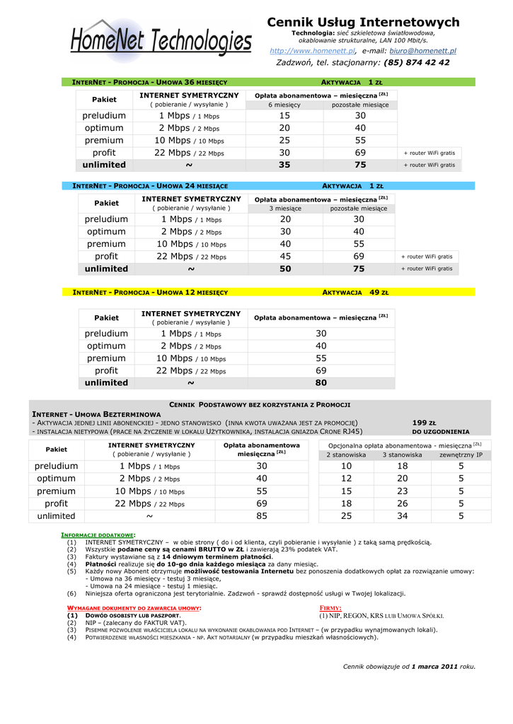 Cennik Usług Internetowych Technologia: sieć szkieletowa światłowodowa, okablowanie strukturalne, LAN 100 Mbit/s. http://www.homenett.pl, e-mail: [email protected] Zadzwoń, tel. stacjonarny: (85) 874 42 42 INTERNET - PROMOCJA - UMOWA 36 MIESIĘCY Pakiet preludium optimum premium profit unlimited INTERNET SYMETRYCZNY ( pobieranie / wysyłanie ) AKTYWACJA Opłata abonamentowa – miesięczna [ZŁ] 6 miesięcy pozostałe miesiące 1 Mbps / 1 Mbps 2 Mbps / 2 Mbps 10 Mbps / 10 Mbps 22 Mbps / 22 Mbps ~ 15 20 25 30 35 INTERNET - PROMOCJA - UMOWA 24 MIESIĄCE Pakiet preludium optimum premium profit unlimited INTERNET SYMETRYCZNY ( pobieranie / wysyłanie ) preludium optimum premium profit unlimited ( pobieranie / wysyłanie ) + router WiFi gratis + router WiFi gratis 1 ZŁ Opłata abonamentowa – miesięczna [ZŁ] 3 miesiące pozostałe miesiące 1 Mbps / 1 Mbps 2 Mbps / 2 Mbps 10 Mbps / 10 Mbps 22 Mbps / 22 Mbps ~ INTERNET SYMETRYCZNY 30 40 55 69 75 AKTYWACJA 20 30 40 45 50 INTERNET - PROMOCJA - UMOWA 12 MIESIĘCY Pakiet 1 ZŁ 30 40 55 69 75 AKTYWACJA + router WiFi gratis + router WiFi gratis 49 ZŁ Opłata abonamentowa – miesięczna 1 Mbps / 1 Mbps 2 Mbps / 2 Mbps 10 Mbps / 10 Mbps 22 Mbps / 22 Mbps ~ [ZŁ] 30 40 55 69 80 CENNIK PODSTAWOWY BEZ KORZYSTANIA Z PROMOCJI INTERNET - UMOWA BEZTERMINOWA - AKTYWACJA JEDNEJ LINII ABONENCKIEJ - JEDNO STANOWISKO (INNA KWOTA UWAŻANA JEST ZA PROMOCJĘ) - INSTALACJA NIETYPOWA (PRACE NA ŻYCZENIE W LOKALU UŻYTKOWNIKA, INSTALACJA GNIAZDA CRONE RJ45) INTERNET SYMETRYCZNY ( pobieranie / wysyłanie ) Pakiet preludium optimum premium profit unlimited 1 Mbps / 1 Mbps 2 Mbps / 2 Mbps 10 Mbps / 10 Mbps 22 Mbps / 22 Mbps ~ 199 ZŁ DO UZGODNIENIA Opcjonalna opłata abonamentowa - miesięczna [ZŁ] Opłata abonamentowa miesięczna [ZŁ] 2 stanowiska 3 stanowiska zewnętrzny IP 30 40 55 69 85 10 12 15 18 25 18 20 23 26 34 5 5 5 5 5 INFORMACJE DODATKOWE: (1) INTERNET SYMETRYCZNY – w obie strony ( do i od klienta, czyli pobieranie i wysyłanie ) z taką samą prędkością. (2) Wszystkie podane ceny są cenami BRUTTO w ZŁ i zawierają 23% podatek VAT. (3) Faktury wystawiane są z 14 dniowym terminem płatności. (4) Płatności realizuje się do 10-go dnia każdego miesiąca za dany miesiąc. (5) Każdy nowy Abonent otrzymuje możliwość testowania Internetu bez ponoszenia dodatkowych opłat za rozwiązanie umowy: - Umowa na 36 miesięcy - testuj 3 miesiące, - Umowa na 24 miesiące - testuj 1 miesiąc. (6) Niniejsza oferta ograniczona jest terytorialnie. Zadzwoń - sprawdź dostępność usługi w Twojej lokalizacji. FIRMY: WYMAGANE DOKUMENTY DO ZAWARCIA UMOWY: (1) DOWÓD OSOBISTY LUB PASZPORT. (1) NIP, REGON, KRS LUB UMOWA SPÓŁKI. (2) NIP – (zalecany do FAKTUR VAT). (3) PISEMNE POZWOLENIE WŁAŚCICIELA LOKALU NA WYKONANIE OKABLOWANIA POD INTERNET – (w przypadku wynajmowanych lokali). (4) POTWIERDZENIE WŁASNOŚCI MIESZKANIA - NP. AKT NOTARIALNY (w przypadku mieszkań własnościowych). Cennik obowiązuje od 1 marca 2011 roku.