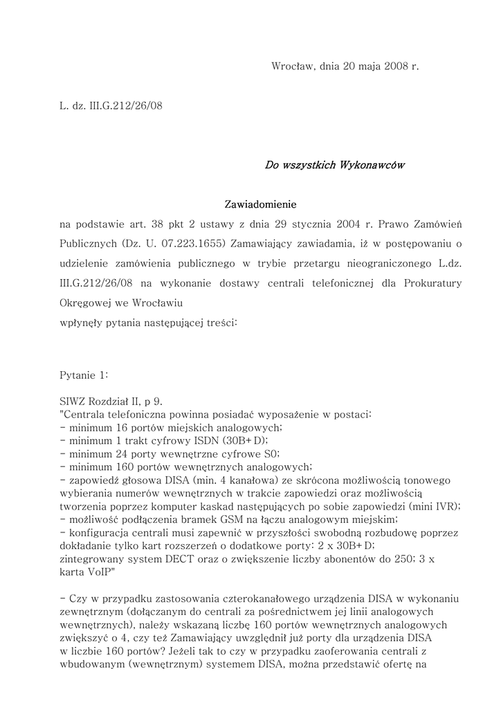 Wrocław, dnia 20 maja 2008 r. L. dz. III.G.212/26/08 Do wszystkich Wykonawców Zawiadomienie na podstawie art. 38 pkt 2 ustawy z dnia 29 stycznia 2004 r. Prawo Zamówień Publicznych (Dz. U. 07.223.1655) Zamawiający zawiadamia, iż w postępowaniu o udzielenie zamówienia publicznego w trybie przetargu nieograniczonego L.dz. III.G.212/26/08 na wykonanie dostawy centrali telefonicznej dla Prokuratury Okręgowej we Wrocławiu wpłynęły pytania następującej treści: Pytanie 1: SIWZ Rozdział II, p 9. "Centrala telefoniczna powinna posiadać wyposażenie w postaci: - minimum 16 portów miejskich analogowych; - minimum 1 trakt cyfrowy ISDN (30B+D); - minimum 24 porty wewnętrzne cyfrowe S0; - minimum 160 portów wewnętrznych analogowych; - zapowiedź głosowa DISA (min. 4 kanałowa) ze skrócona możliwością tonowego wybierania numerów wewnętrznych w trakcie zapowiedzi oraz możliwością tworzenia poprzez komputer kaskad następujących po sobie zapowiedzi (mini IVR); - możliwość podłączenia bramek GSM na łączu analogowym miejskim; - konfiguracja centrali musi zapewnić w przyszłości swobodną rozbudowę poprzez dokładanie tylko kart rozszerzeń o dodatkowe porty: 2 x 30B+D; zintegrowany system DECT oraz o zwiększenie liczby abonentów do 250; 3 x karta VoIP" - Czy w przypadku zastosowania czterokanałowego urządzenia DISA w wykonaniu zewnętrznym (dołączanym do centrali za pośrednictwem jej linii analogowych wewnętrznych), należy wskazaną liczbę 160 portów wewnętrznych analogowych zwiększyć o 4, czy też Zamawiający uwzględnił już porty dla urządzenia DISA w liczbie 160 portów? Jeżeli tak to czy w przypadku zaoferowania centrali z wbudowanym (wewnętrznym) systemem DISA, można przedstawić ofertę na 2 centralę z wyposażeniem dla 156 portów analogowych wewnętrznych? - czy poprzez wprowadzenie zapisu "konfiguracja centrali musi zapewnić w przyszłości swobodną rozbudowę poprzez dokładanie tylko kart rozszerzeń..." oznacza, że Zamawiający wymaga dostarczenia centrali z niezbędną ilością obudów, zasilaczy oraz wymaganych przez producenta dodatkowych elementów wyposażenia (filtry, kable połączeniowe itp.) tak, aby przyszła rozbudowa była realizowana wyłącznie przez instalację kart elektronicznych (pakietów wyposażeń wewnętrznych, zewnętrznych, funkcyjnych)? Jeżeli nie - to czy przez określenie "kart rozszerzeń" mogę rozumieć również takie podzespoły centrali telefonicznej jak: obudowa rozszerzająca, zasilacz, itp.? - czy przez wprowadzenie zapisu "3 x karta VoIP" Zamawiający chce wskazać rozwiązanie konkretnego producenta i/lub modelu centrali telefonicznej czy też Zamawiający chce określić liczbę kanałów VoIP, które zamierza w przyszłości wykorzystać do wykonania zsieciowanego układu central? Czy jest to liczba wynikająca ze schematu przedstawionego w SIWZ czy inna? Odpowiedź: a. W ilości minimum 160 portów wewnętrznych analogowych są już przewidziane porty do podłączenia 4 kanałowego modułu DISA, jednakże zastosowanie wbudowanego (wewnętrznego) systemu DISA nie może powodować zmniejszenia dostępnych portów analogowych. b. Wprowadzenie zapisu "konfiguracja centrali musi zapewnić w przyszłości swobodną rozbudowę poprzez dokładanie tylko kart rozszerzeń..." oznacza, że Zamawiający wymaga dostarczenia centrali z niezbędną ilością obudów, zasilaczy oraz wymaganych przez producenta dodatkowych elementów wyposażenia (filtry, kable połączeniowe itp.) tak, aby przyszła rozbudowa była realizowana wyłącznie przez instalację kart elektronicznych. c. Poprzez wprowadzenie zapisu "3 x karta VoIP" intencją Zamawiającego jest stworzenie bezpiecznego systemu z możliwością zamienności pakietów VoIP, a także zapewnienie minimalnej (nie docelowej) przepustowości poprzez VoIP wg załączonego w SIWZ schematu. Pytanie 2: SIWZ Rozdział II, p 15. "Zamawiający wymaga przedstawienia wykazu sprzętu, który zostanie zainstalowany (specyfikacja) oraz wykazu sprzętu, jaki docelowo miałby być instalowany dla pełnej koncepcji połączenia wszystkich lokalizacji oraz rysunek poglądowy zainstalowanych elementów." W związku z żądaniem przedstawienia "wykazu sprzętu, jaki docelowo miałby być instalowany dla pełnej koncepcji połączenia wszystkich lokalizacji .. " 3 proszę o podanie wykazu central telefonicznych opisanych na schemacie przedstawionym w SIWZ jako "centrala 6" do "centrala 10" oraz "centrala do zsieciowania". Odpowiedź: Poprzez "wykaz sprzętu, jaki docelowo miałby być instalowany dla pełnej koncepcji połączenia wszystkich lokalizacji" Zamawiający rozumie podanie symboli central telefonicznych, które mogą być zintegrowane z systemem. Aktualnie centrale 6 - 8 nie mają możliwości sieciowania, a centrala 9 i 10 mają zostać zainstalowane w przyszłości, dlatego po to jest wymagana od oferenta koncepcja połączeń wszystkich lokalizacji, aby podczas ich wymiany (zakupu) można było powołać się na konieczność współpracy (zsieciowanie) z proponowanym rozwiązaniem. Można jednak założyć, że dla lokalizacji 6 - 10 będą to zbliżone konfiguracje jak dla central z lokalizacji 1-5. "Centrala do zsieciowania" ma być docelowo zsieciowanym (połączonym) systemem (bez stosowania dodatkowych urządzeń zewnętrznych) po minimum 30 kanałach ISDN dla około 150 numerów wewnętrznych (SIWZ rozdział II pkt. 2). Pytanie 3: SIWZ Rozdział II, p 11, SIWZ Rozdział II, p 12 - "funkcja głośnomówiąca" Czy przez "funkcję głośnomówiącą" Zamawiający rozumie możliwość odsłuchu rozmówcy przez głośnik, który jest wyposażony aparat, czy też możliwość prowadzenia dwustronnej rozmowy bez korzystania z mikrotelefonu (aparaty wyposażone w głośnik i mikrofon). Odpowiedź: Funkcja głośnomówiąca jest określeniem jednoznacznym stosowanym w branży telekomunikacyjnej i oznacza rozmowę bez podnoszenia słuchawki (aparat wyposażo