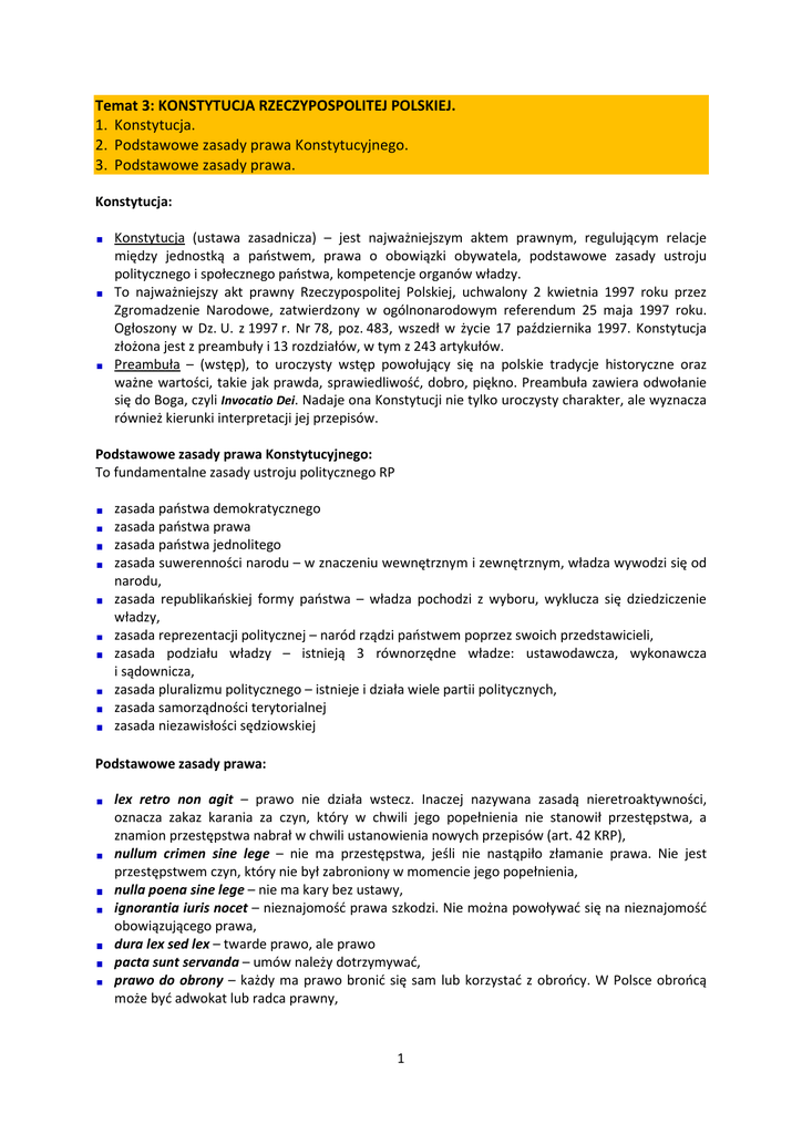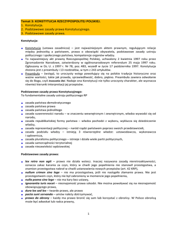 Temat 3: KONSTYTUCJA RZECZYPOSPOLITEJ POLSKIEJ. 1. Konstytucja. 2. Podstawowe zasady prawa Konstytucyjnego. 3. Podstawowe zasady prawa. Konstytucja: Konstytucja (ustawa zasadnicza) – jest najważniejszym aktem prawnym, regulującym relacje między jednostką a państwem, prawa o obowiązki obywatela, podstawowe zasady ustroju politycznego i społecznego państwa, kompetencje organów władzy. To najważniejszy akt prawny Rzeczypospolitej Polskiej, uchwalony 2 kwietnia 1997 roku przez Zgromadzenie Narodowe, zatwierdzony w ogólnonarodowym referendum 25 maja 1997 roku. Ogłoszony w Dz. U. z 1997 r. Nr 78, poz. 483, wszedł w życie 17 października 1997. Konstytucja złożona jest z preambuły i 13 rozdziałów, w tym z 243 artykułów. Preambuła – (wstęp), to uroczysty wstęp powołujący się na polskie tradycje historyczne oraz ważne wartości, takie jak prawda, sprawiedliwość, dobro, piękno. Preambuła zawiera odwołanie się do Boga, czyli Invocatio Dei. Nadaje ona Konstytucji nie tylko uroczysty charakter, ale wyznacza również kierunki interpretacji jej przepisów. Podstawowe zasady prawa Konstytucyjnego: To fundamentalne zasady ustroju politycznego RP zasada państwa demokratycznego zasada państwa prawa zasada państwa jednolitego zasada suwerenności narodu – w znaczeniu wewnętrznym i zewnętrznym, władza wywodzi się od narodu, zasada republikańskiej formy państwa – władza pochodzi z wyboru, wyklucza się dziedziczenie władzy, zasada reprezentacji politycznej – naród rządzi państwem poprzez swoich przedstawicieli, zasada podziału władzy – istnieją 3 równorzędne władze: ustawodawcza, wykonawcza i sądownicza, zasada pluralizmu politycznego – istnieje i działa wiele partii politycznych, zasada samorządności terytorialnej zasada niezawisłości sędziowskiej Podstawowe zasady prawa: lex retro non agit – prawo nie działa wstecz. Inaczej nazywana zasadą nieretroaktywności, oznacza zakaz karania za czyn, który w chwili jego popełnienia nie stanowił przestępstwa, a znamion przestępstwa nabrał w chwili ustanowienia nowych przepisów (art. 42 KRP), nullum crimen sine lege – nie ma przestępstwa, jeśli nie nastąpiło złamanie prawa. Nie jest przestępstwem czyn, który nie był zabroniony w momencie jego popełnienia, nulla poena sine lege – nie ma kary bez ustawy, ignorantia iuris nocet – nieznajomość prawa szkodzi. Nie można powoływać się na nieznajomość obowiązującego prawa, dura lex sed lex – twarde prawo, ale prawo pacta sunt servanda – umów należy dotrzymywać, prawo do obrony – każdy ma prawo bronić się sam lub korzystać z obrońcy. W Polsce obrońcą może być adwokat lub radca prawny, 1 domniemanie niewinności – osoba oskarżona o popełnienie przestępstwa nie może być uznana za winną, dopóki jej wina nie zostanie udowodniona i nie zostanie wydany prawomocny wyrok (art. 42, ust. 3 KRP), in dubio pro reo – w razie wątpliwości na korzyść oskarżonego, zasada jawności – jawność procesu karnego wypełnia prawo obywateli do uzyskania informacji o działalności organów państwowych (art. 45 KRP), zasada prawdy materialnej – nakłada obowiązek na organy prowadzące postępowanie do ustalenia wszystkich faktów i okoliczności popełnienia przestępstwa i oparcia na nich rozstrzygnięcia, zasada obiektywizmu – polega na bezstronnym stosunku organu prowadzącego postępowanie do oskarżonego i do oskarżyciela zasada swobodnej oceny dowodów – sąd oceniając dowody kieruje się zasadami logicznego rozumowania, własną wiedzą i doświadczeniem życiowym, si in ius vocatio – wzywają cię, idź. zasada niezawisłości sądu: − władzę w Polsce sprawują sądy, oprócz władzy ustawodawczej i wykonawczej (zasada trójpodziału władzy), − prawo obywatela do sprawiedliwego procesu, − niezawisłość sędziów: są mianowania przez Prezydenta RP, nieusuwalni, posiadają immunitet sędziowski, zakaz łączenia funkcji sędziego, apolityczność, zasada instancyjności – postępowanie sądowe jest wieloinstancyjne, zasada udziału obywateli w sprawowaniu wymiaru sprawiedliwości – obecność ławników w trakcie procesu. Są oni wybierani przez rady gmin na 4-letnią kadencję, zasada jednolitości – na terenie całego kraju obowiązuje jednolita struktura sądów oraz przepisy regulujące sposób postępowania i orzekania. Wyroki są wydawane w imieniu Rzeczypospolitej Polskiej. 2