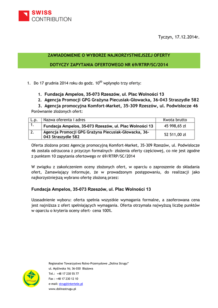 Tyczyn, 17.12.2014r. ZAWIADOMIENIE O WYBORZE NAJKORZYSTNIEJSZEJ OFERTY DOTYCZY ZAPYTANIA OFERTOWEGO NR 69/RTRP/SC/2014 1. Do 17 grudnia 2014 roku do godz. 1000 wpłynęło trzy oferty: 1. Fundacja Ampelos, 35-073 Rzeszów, ul. Plac Wolności 13 2. Agencja Promocji GPG Grażyna Piecusiak-Głowacka, 36-043 Straszydle 582 3. Agencja promocyjna Komfort-Market, 35-309 Rzeszów, ul. Podwisłocze 46 Porównanie złożonych ofert: L.p. 1. 2. Nazwa oferenta i adres Kwota brutto Fundacja Ampelos, 35-073 Rzeszów, ul. Plac Wolności 13 Agencja Promocji GPG Grażyna Piecusiak-Głowacka, 36043 Straszydle 582 45 998,65 zł 52 511,00 zł Oferta złożona przez Agencję promocyjną Komfort-Market, 35-309 Rzeszów, ul. Podwisłocze 46 została odrzucona z przyczyn formalnych- złożenia oferty częściowej, co nie jest zgodne z punktem 10 zapytania ofertowego nr 69/RTRP/SC/2014 W związku z zakończeniem oceny złożonych ofert, w oparciu o zaproszenie do składania ofert, Zamawiający informuje, że w prowadzonym postępowaniu, do realizacji jako najkorzystniejszą wybrano ofertę złożoną przez: Fundacja Ampelos, 35-073 Rzeszów, ul. Plac Wolności 13 Uzasadnienie wyboru: oferta spełnia wszystkie wymagania formalne, a zaoferowana cena jest najniższa z ofert spełniających wymagania. Oferta otrzymała najwyższą liczbę punktów w oparciu o kryteria oceny ofert- cena 100%. Regionalne Towarzystwo Rolno-Przemysłowe „Dolina Strugu” ul. Myśliwska 16; 36-030 Błażowa Tel.: +48 17 230 55 77 DOLINA S TR UGU Fax : +48 17 230 12 10 e-mail: [email protected] www.dolinastrugu.pl