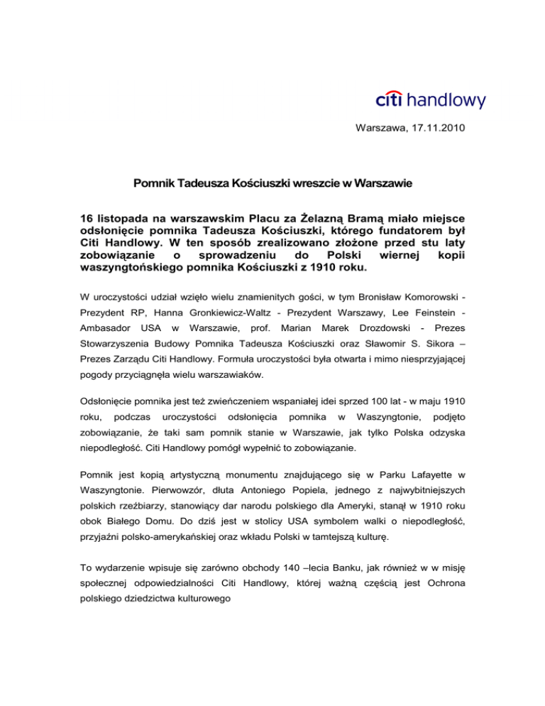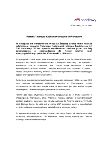 Warszawa, 17.11.2010 Pomnik Tadeusza Kościuszki wreszcie w Warszawie 16 listopada na warszawskim Placu za śelazną Bramą miało miejsce odsłonięcie pomnika Tadeusza Kościuszki, którego fundatorem był Citi Handlowy. W ten sposób zrealizowano złoŜone przed stu laty zobowiązanie o sprowadzeniu do Polski wiernej kopii waszyngtońskiego pomnika Kościuszki z 1910 roku. W uroczystości udział wzięło wielu znamienitych gości, w tym Bronisław Komorowski Prezydent RP, Hanna Gronkiewicz-Waltz - Prezydent Warszawy, Lee Feinstein Ambasador USA w Warszawie, prof. Marian Marek Drozdowski - Prezes Stowarzyszenia Budowy Pomnika Tadeusza Kościuszki oraz Sławomir S. Sikora – Prezes Zarządu Citi Handlowy. Formuła uroczystości była otwarta i mimo niesprzyjającej pogody przyciągnęła wielu warszawiaków. Odsłonięcie pomnika jest teŜ zwieńczeniem wspaniałej idei sprzed 100 lat - w maju 1910 roku, podczas uroczystości odsłonięcia pomnika w Waszyngtonie, podjęto zobowiązanie, Ŝe taki sam pomnik stanie w Warszawie, jak tylko Polska odzyska niepodległość. Citi Handlowy pomógł wypełnić to zobowiązanie. Pomnik jest kopią artystyczną monumentu znajdującego się w Parku Lafayette w Waszyngtonie. Pierwowzór, dłuta Antoniego Popiela, jednego z najwybitniejszych polskich rzeźbiarzy, stanowiący dar narodu polskiego dla Ameryki, stanął w 1910 roku obok Białego Domu. Do dziś jest w stolicy USA symbolem walki o niepodległość, przyjaźni polsko-amerykańskiej oraz wkładu Polski w tamtejszą kulturę. To wydarzenie wpisuje się zarówno obchody 140 –lecia Banku, jak równieŜ w w misję społecznej odpowiedzialności Citi Handlowy, której waŜną częścią jest Ochrona polskiego dziedzictwa kulturowego ### Dodatkowych informacji udziela: Paweł Zegarłowicz, Dyrektor Biura Prasowego, tel. (0-22) 657 72 97 E-mail: [email protected] Agata Charuba-Chadryś, Kierownik ds. Kontaktów z Mediami, tel. (0-22) 692 90 52 E-mail: [email protected] Bank Handlowy w Warszawie SA to jedna z największych instytucji finansowych w Polsce, oferująca pod marką Citi Handlowy bogaty i nowoczesny asortyment produktów i usług bankowości korporacyjnej, inwestycyjnej i detalicznej. Bank Handlowy obsługuje 20 tys. klientów korporacyjnych i 1 mln klientów indywidualnych poprzez nowoczesne kanały dystrybucji oraz sieć ponad 200 oddziałów. W skład grupy kapitałowej Banku wchodzą takie podmioty jak: Dom Maklerski Banku Handlowego i Handlowy Leasing. PrzynaleŜność do Citigroup, największej na świecie instytucji finansowej, zapewnia klientom Banku Handlowego dostęp do usług finansowych w ponad 100 krajach. Dodatkowe informacje moŜna uzyskać na stronie internetowej www.citihandlowy.pl. Citi (NYSE:C) to wiodąca globalna instytucja finansowa, mająca około 200 milionów klientów w ponad 140 krajach. Poprzez swoje dwie odrębne jednostki operacyjne: Citicorp i Citi Holdings, Citi obsługuje klientów indywidualnych, korporacyjnych, rządowych i instytucjonalnych zapewniając im bogaty wachlarz produktów i usług finansowych w zakresie bankowości detalicznej, bankowości korporacyjnej i inwestycyjnej, usług maklerskich i zarządzania aktywami. Dodatkowe informacje moŜna uzyskać na stronie internetowej www.citigroup.com lub or www.citi.com.