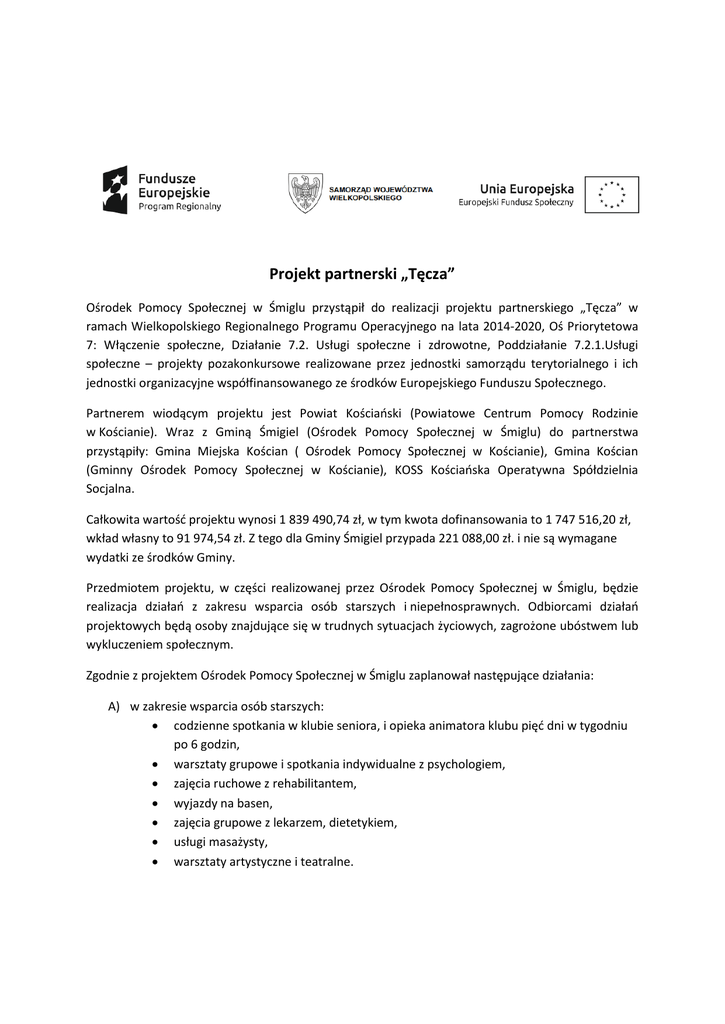 Projekt partnerski „Tęcza” Ośrodek Pomocy Społecznej w Śmiglu przystąpił do realizacji projektu partnerskiego „Tęcza” w ramach Wielkopolskiego Regionalnego Programu Operacyjnego na lata 2014-2020, Oś Priorytetowa 7: Włączenie społeczne, Działanie 7.2. Usługi społeczne i zdrowotne, Poddziałanie 7.2.1.Usługi społeczne – projekty pozakonkursowe realizowane przez jednostki samorządu terytorialnego i ich jednostki organizacyjne współfinansowanego ze środków Europejskiego Funduszu Społecznego. Partnerem wiodącym projektu jest Powiat Kościański (Powiatowe Centrum Pomocy Rodzinie w Kościanie). Wraz z Gminą Śmigiel (Ośrodek Pomocy Społecznej w Śmiglu) do partnerstwa przystąpiły: Gmina Miejska Kościan ( Ośrodek Pomocy Społecznej w Kościanie), Gmina Kościan (Gminny Ośrodek Pomocy Społecznej w Kościanie), KOSS Kościańska Operatywna Spółdzielnia Socjalna. Całkowita wartość projektu wynosi 1 839 490,74 zł, w tym kwota dofinansowania to 1 747 516,20 zł, wkład własny to 91 974,54 zł. Z tego dla Gminy Śmigiel przypada 221 088,00 zł. i nie są wymagane wydatki ze środków Gminy. Przedmiotem projektu, w części realizowanej przez Ośrodek Pomocy Społecznej w Śmiglu, będzie realizacja działań z zakresu wsparcia osób starszych i niepełnosprawnych. Odbiorcami działań projektowych będą osoby znajdujące się w trudnych sytuacjach życiowych, zagrożone ubóstwem lub wykluczeniem społecznym. Zgodnie z projektem Ośrodek Pomocy Społecznej w Śmiglu zaplanował następujące działania: A) w zakresie wsparcia osób starszych: codzienne spotkania w klubie seniora, i opieka animatora klubu pięć dni w tygodniu po 6 godzin, warsztaty grupowe i spotkania indywidualne z psychologiem, zajęcia ruchowe z rehabilitantem, wyjazdy na basen, zajęcia grupowe z lekarzem, dietetykiem, usługi masażysty, warsztaty artystyczne i teatralne. B) w zakresie wsparcia specjalistycznego dla osób niepełnosprawnych: asystowanie w codziennych czynnościach mających na celu angażowanie w życie społeczne, usługi masażysty. Autorzy projektu zakładają, że zaplanowane działania przyczynią się do poprawy funkcjonowania osób starszych w Gminie Śmigiel, ograniczenia zjawiska wykluczenia społecznego tej grupy mieszkańców oraz poprawy zdrowia psychofizycznego. W odniesieniu do osób niepełnosprawnych oczekuje się ograniczenia zjawiska wykluczenia i alienacji społecznej. Ośrodek Pomocy Społecznej w Śmiglu czyni przygotowania do wdrożenia projektu, chociaż stosowne umowy nie są jeszcze podpisane przewiduje się, że pierwsze działania zostaną podjęte w już miesiącu grudniu 2016 r. Osoby chętne do podjęcia pracy z osobami starszymi w charakterze animatora klubu seniora lub z osobami niepełnosprawnymi jako asystent osoby niepełnosprawnej - proszone są o składanie swoich ofert do Ośrodka Pomocy Społecznej w Śmiglu, ul. Kościańska 1. Wkrótce na stronie internetowej Gminy Śmigiel ukaże się stosowne zaproszenie. Ponadto szczegółowych informacji udziela Pani Edyta Małek pod numerem telefonu 65 5180 969 nr wew. 14.