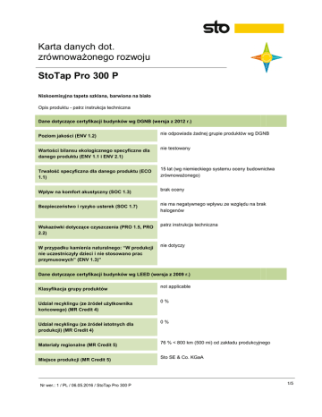 Karta danych dot. zrównoważonego rozwoju StoTap Pro 300 P Niskoemisyjna tapeta szklana, barwiona na biało Opis produktu - patrz instrukcja techniczna Dane dotyczące certyfikacji budynków wg DGNB (wersja z 2012 r.) Poziom jakości (ENV 1.2) Wartości bilansu ekologicznego specyficzne dla danego produktu (ENV 1.1 i ENV 2.1) Trwałość specyficzna dla danego produktu (ECO 1.1) Wpływ na komfort akustyczny (SOC 1.3) Bezpieczeństwo i ryzyko usterek (SOC 1.7) Wskazówki dotyczące czyszczenia (PRO 1.5, PRO 2.2) W przypadku kamienia naturalnego: “W produkcji nie uczestniczyły dzieci i nie stosowano prac przymusowych” (ENV 1.3)” nie odpowiada żadnej grupie produktów wg DGNB nie testowany 15 lat (wg niemieckiego systemu oceny budownictwa zrównoważonego) brak oceny nie ma negatywnego wpływu ze względu na brak halogenów patrz instrukcja techniczna nie dotyczy Dane dotyczące certyfikacji budynków wg LEED (wersja z 2009 r.) Klasyfikacja grupy produktów Udział recyklingu (ze źródeł użytkownika końcowego) (MR Credit 4) Udział recyklingu (ze źródeł istotnych dla produkcji) (MR Credit 4) Materiały regionalne (MR Credit 5) Miejsce produkcji (MR Credit 5) Nr wer.: 1 / PL / 06.05.2016 / StoTap Pro 300 P not applicable 0% 0% 76 % < 800 km (500 mi) od zakładu produkcyjnego Sto SE & Co. KGaA 1/5 Karta danych dot. zrównoważonego rozwoju StoTap Pro 300 P Surowce szybkoodnawialne (MR Credit 6) Drewno certyfikowane (FSC lub PEFC) (MR Credit 7) Zawartość związków VOC (IEQ Credit 4.1): materiały o niskiej zawartości substancji szkodliwych – materiały klejące i uszczelniające Zawartość związków VOC (IEQ Credit 4.2): materiały o niskiej zawartości substancji szkodliwych – farby i powłoki Zawartość związków VOC (IEQ Credit 4.3): materiały o niskiej zawartości substancji szkodliwych – systemy podłogowe 0% nie dotyczy nie dotyczy < 0,1 g/l (bez wody) nie dotyczy Ekologiczne znaki jakości i oznaczenia Certyfikaty / ekologiczne znaki jakości ® Oeko-Tex Standard 100 - Zertifikat 13.0.21450 Declaration of conformity No. ECO-FR-094 Deklaracja środowiskowa produktu (EPD) Klasyfikacja substancji szkodliwych (GISCODE, EMICODE, RAL itd.) Karta charakterystyki (SDB) Instrukcja techniczna (TM) brak nie dotyczy niedostępne dostępne Składniki produktu Skład Nr wer.: 1 / PL / 06.05.2016 / StoTap Pro 300 P nie testowany 2/5 Karta danych dot. zrównoważonego rozwoju StoTap Pro 300 P Składniki niebezpieczne (wg rozporządzeń UE) Udział substancji mineralnych (wg natureplus / baubook) Udział substancji organicznych (wg natureplus / baubook) Lotne związki organiczne Zawartość związków VOC (wg dyrektywy Decopaint) Zawartość zmiękczacza Wolny formaldehyd Biocyd(y)/Substancja(e) aktywna(e) chroniąca(e) powłokę (wg rozporządzenia UE 528/2012) Biocyd(y)/Substancja(e) aktywna(e) chroniąca(e) podczas składowania (wg rozporządzenia UE 528/2012) Metale ciężkie Przestrzeganie granicy emisji w przemyśle, gdzie powstaje tlenek tytanu (wg dyrektywy 2010/75/UE lub 25.BImSchV) Halogenowe węglowodory (np. FCKW, HFKW, HFCKW) Halogenowe związki organiczne (np. IPBC, HBCD, polichlorek winylu) nie zawiera < 95 % >5% nie zawiera < 0,1 g/l (Produkt nie podlega wytycznym 2004/42/WE) nie zawiera plastyfikatorów (wg VdL-RL 01) nie zawiera nie zawiera nie zawiera nie zawiera tak nie zawiera brak Emisje Formaldehyd Nr wer.: 1 / PL / 06.05.2016 / StoTap Pro 300 P ≤ 10 µg/m³ po 24 h (wg DIN EN ISO 16000-9 lub badanie zawartości formaldehydu paskami testowymi 3/5 Karta danych dot. zrównoważonego rozwoju StoTap Pro 300 P Merckoquant) Półlotne związki organiczne SVOC niewykrywalny (granica wykrywalności: 2 µg/m³) (wg DIN EN ISO 16000-9 lub DIN EN 16402) Utylizacja / ponowne zastosowanie / recykling Ponowne zastosowanie / recykling Utylizacja Opakowanie / wiadro / folia Tapety nie są poddawane recyklingowi nie testowany Odbieranie zużytych opakowań oraz ich prawidłowe ponowne wykorzystanie zostało ustalone na podstawie przepisów z lokalną firmą utylizacyjną posiadającą odpowiednie certyfikaty. Odpowiedzialność firmy Sto Misja firmy / kierownictwo firmy Sto UN Global Compact — członkowstwo Podstawowe normy pracy ILO Zarządzanie jakością i zarządzanie środowiskowe Kodeks dostawcy Nr wer.: 1 / PL / 06.05.2016 / StoTap Pro 300 P Głównym celem firmy Sto jest zajęcie pozycji technologicznego lidera w dziedzinie zrównoważonego, przyjaznego dla człowieka budownictwa. Na całym świecie. Pozostałe informacje: www.sto.com Firma Sto jest członkiem UN Global Compact i zobowiązuje się do przestrzegania dziesięciu uznanych zasad, obejmujących prawa człowieka, normy pracy, ochronę środowiska i zwalczanie korupcji. Pozostałe informacje: www.unglobalcompact.org Firma Sto zobowiązała się do przestrzegania we wszystkich swoich lokalizacjach podstawowych norm pracy ILO. Miejsce produkcji zostało poddane certyfikacji wg DIN EN 9001 oraz DIN EN 14001. Kodeks dostawcy firmy Sto opiera się o zasady UN Global Compact oraz misję firmy Sto. Dostawcy zobowiązują się do jego przestrzegania i będą stale sprawdzani. 4/5 Karta danych dot. zrównoważonego rozwoju StoTap Pro 300 P Za pomocą niniejszego dokumentu chcielibyśmy ułatwić Państwu ocenę zrównoważonego rozwoju naszych produktów. Jako zrównoważony rozwój rozumiemy kompleksowe współdziałanie kryteriów ekonomicznych, ekologicznych i społecznych, które ma na celu zaspokojenie potrzeb obecnych i przyszłych pokoleń. Chcemy, aby nasze produkty miały swój wkład w ten proces i jednocześnie spełniały wymagania związane z dobrostanem oraz jakością i funkcjonalnością. Zrównoważony rozwój nie oznacza dla nas stanu, ale proces ciągłej poprawy. Z tego powodu zdefiniowaliśmy z myślą o naszych produktach kluczowe deklaracje: 1. Produkty Sto mają swój wkład w kwestie związane ze zrównoważonym rozwojem: np. ochrona klimatu, efektywność w budownictwie, efektyw