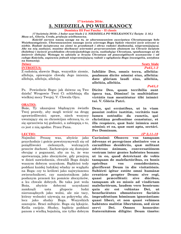 17 kwietnia 2016r. 3. NIEDZIELA PO WIELKANOCY Dominica III Post Pascha – II classis 17 kwietnia 2016r. [ kolor szat białe ] 3. NIEDZIELA PO WIELKANOCY.( Święto 2. kl.) Msza wł., Gloria, Credo, prefacja wielkanocna. Kościół zwraca naszą uwagę na to, że ukoronowaniem zwycięstwa Chrystusowego było Wniebowstąpienie. Ukoronowaniem naszego życia wiernego Bogu będzie również życie wieczne w niebie. Radość świąteczna na ziemi to przedsmak i obraz radości doskonałej, nieprzemijającej. Aby na nią zasłużyć, musimy dochować wierności przyrzeczeniom złożonym na Chrzcie świętym (kolekta) i świecić przykładem chrześcijańskiego życia, naśladując Chrystusa, «posłusznego aż do śmierci» (lekcja). Wymaga to udziału w krzyżu Chrystusa od poszczególnych wyznawców i od całego Kościoła, zapewnia jednak nieprzemijającą radość z oglądania Boga (ewangelia, antyfona na komunię). 2klasy Szaty białe INTROITUS: Z radością sławcie Boga, wszystkie ziemie, Iubiláte Deo, omnis terra, alleluja, opiewajcie chwałę Jego imienia, psalmum dícite nómini eius, alleluja, alleluja, alleluja. date glóriam laudi eius, allelúia, allelúia. Ps65,1-2 allelúia: allelúia: allelúia, Ps65,3 Ps. Powiedzcie Bogu: jak dziwne są Twe Dícite Deo, quam terribília sunt dzieła! Wrogowie Twoi Ci schlebiają dla ópera tua, Dómine! in multitúdine wielkiej mocy Twojej. V. Chwała Ojcu. virtútis tuæ mentiéntur tibi inimíci tui. V. Glória Patri. ORATIO: Boże, Ty ukazujesz błądzącym światło Deus, qui errántibus, ut in viam Twej prawdy, aby mogli wrócić na drogę possint redíre iustítiæ, veritátis tuæ sprawiedliwości; spraw, niech wszyscy lumen osténdis: da cunctis, qui uważający się za chrześcijan odrzucą to, co christiána professióne censéntur, et się sprzeciwia tej godności, a zabiegają o to, illa respúere, quæ huic inimíca sunt nómini; et ea, quæ sunt apta, sectári. co jest z nią zgodne. Przez Pana. Per Dominum. LECTIO: 1P 2,11-19 Najmilsi: Proszę was, abyście jako Caríssimi: Obsecro vos tamquam przychodnie i goście powstrzymywali się od ádvenas et peregrínos abstinére vos a pożądliwości cielesnych, walczących carnálibus desidériis, quæ mílitant przeciw duchowi. Zachowujcie się dostojnie advérsus ánimam, conversatiónem obcując z poganami, aby za to, że was vestram inter gentes habéntes bonam: spotwarzają jako złoczyńców, gdy przejrzą ut in eo, quod detréctant de vobis w dzień nawiedzenia, chwalili Boga dzięki tamquam de malefactóribus, ex bonis waszym dobrym uczynkom. Bądźcież tedy opéribus vos considerántes, poddani każdej ludzkiej władzy ze względu gloríficent Deum in die visitatiónis. na Boga: czy to królowi jako najwyższemu Subiécti ígitur estóte omni humánæ zwierzchnikowi, czy namiestnikom jako creatúræ propter Deum: sive regi, posłanym przezeń ku pomście złoczyńców, quasi præcellénti: sive dúcibus, a ku chwale dobrych. Bo taka jest wola tamquam ab eo missis ad vindíctam Boża, abyście dobrymi uczynkami malefactórum, laudem vero bonórum: zamknęli usta głupocie ludzi quia sic est volúntas Dei, ut nierozsądnych jako wolni, ale nie tacy, benefaciéntes obmutéscere faciátis którzy wolności używają na pokrywkę zła, imprudéntium hóminum ignorántiam: lecz jako słudzy Boga. Wszystkich quasi líberi, et non quasi velámen szanujcie. Braci miłujcie. Boga się lękajcie. habéntes malítiæ libertátem, sed sicut Króla czcijcie. Słudzy, bądźcie poddani servi Dei. Omnes honoráte: panom z wielką bojaźnią, nie tylko dobrym fraternitátem dilígite: Deum timéte: i skromnym, ale też i przykrym. Bo to jest regem honorificáte Servi, súbditi łaską w Chrystusie Jezusie, Panu naszym. estóte in omni timóre dóminis, non tantum bonis et modéstis, sed étiam dýscolis. Hæc est enim grátia: in Christo Iesu, Dómino nostro. GRADUALE: Alleluja, alleluja Ps. Pan zesłał odkupienie Allelúia, alleluia Ps110,9 swojemu ludowi. Alleluja. V. Trzeba było, Redemptiónem misit Dóminus pópulo aby Chrystus cierpiał i zmartwychwstał suo Łk24,46 Oportebat pati Christum, dnia trzeciego i tak wszedł do swojej et resúrgere a mórtuis: et ita intráre chwały. Alleluja. in glóriam suam. Allelúia. J16,16-22 In illo témpore: Dixit Iesus discípulis suis: Módicum, et iam non vidébitis me: et íterum módicum, et vidébitis me: quia vado ad Patrem. Dixérunt ergo ex discípulis eius ad ínvicem: Quid est hoc, quod dicit nobis: Módicum, et non vidébitis me: et íterum módicum, et vidébitis me, et quia vado ad Patrem? Dicébant ergo: Quid est hoc, quod dicit: Modicum? nescímus, quid lóquitur. Cognóvit autem Iesus, quia volébant eum interrogáre, et dixit eis: De hoc quaeritis inter vos, quia dixi: Modicum, et non vidébitis me: et íterum módicum, et vidébitis me. Amen, amen, dico vobis: quia plorábitis et flébitis vos, mundus autem gaudébit: vos autem contristabímini, sed tristítia vestra vertétur in gáudium. Múlier cum parit, tristítiam habet, quia venit hora eius: cum autem pepérerit púerum, iam non méminit pressúræ propter gáudium, quia natus est homo in mundum. Et vos igitur nunc quidem tristítiam habétis, íterum autem vidébo vos, et gaudébit cor vestrum: et gáudium vestrum nemo tollet a vobis. OFFERTORIUM: Ps145,2 Chwal, duszo moja, Pana! Boga wielbić Lauda, anima mea, Dóminum: laudábo pragnę przez całe me życie; śpiewać Mu Dóminum in vita mea: psallam Deo będę, dopóki będę żył, alleluja. meo, quámdiu ero, allelúia. SECRETA: Panie, przez te misteria udziel nam His nobis, Dómine, mystériis pomocy abyśmy poskramiali ziemskie conferátur, quo, terréna desidéria pragnienia i nauczyli się miłować rzeczy mitigántes, discámus amáre coeléstia. Per Dominum. niebieskie. Przez Pana. EVANGELIUM: Onego czasu rzekł Jezus uczniom swoim: «Już niedługo, a nie będziecie mnie oglądać, i znowu niedługo, a ujrzy