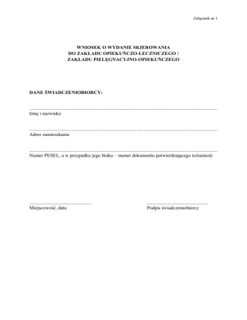 Załącznik nr 1 WNIOSEK O WYDANIE SKIEROWANIA DO ZAKŁADU OPIEKUŃCZO-LECZNICZEGO / ZAKŁADU PIELĘGNACYJNO-OPIEKUŃCZEGO DANE ŚWIADCZENIOBIORCY: ....................................................................................................................................................... Imię i nazwisko ....................................................................................................................................................... Adres zamieszkania ....................................................................................................................................................... Numer PESEL, a w przypadku jego braku – numer dokumentu potwierdzającego tożsamość .................................................. Miejscowość, data ................................................. Podpis świadczeniobiorcy Załącznik nr 2 WYWIAD PIELĘGNIARSKI I ZAŚWIADCZENIE LEKARSKIE WYWIAD PIELĘGNIARSKI 1. Dane świadczeniobiorcy ....................................................................................................................................................... Imię i nazwisko ....................................................................................................................................................... Adres zamieszkania ....................................................................................................................................................... Numer PESEL, a w przypadku jego braku – numer dokumentu potwierdzającego tożsamość 2. Rozpoznanie problemów z zakresu pielęgnacji (zaznaczyć właściwe, ewentualnie opisać): a) odżywianie –samodzielny/przy pomocy/utrudnienia* karmienie przez gastrostomię lub zgłębnik .................................................................... karmienie pacjenta z zaburzonym połykaniem .............................................................. zakładanie zgłębnika ...................................................................................................... inne niewymienione ....................................................................................................... b) higiena ciała –samodzielny/przy pomocy/utrudnienia* w przypadku pacjenta wentylowanego mechanicznie – toaleta jamy ustnej lub toaleta drzewa oskrzelowego oraz wymiana rurki tracheostomijnej .......................................... inne niewymienione ........................................................................................................ c) oddawanie moczu –samodzielny/przy pomocy/utrudnienia* cewnik inne niewymienione ........................................................................................................ d) oddawanie stolca –samodzielny/przy pomocy/utrudnienia* pielęgnacja stomii ........................................................................................................... wykonywanie lewatyw i irygacji .................................................................................... inne niewymienione ........................................................................................................ e) przemieszczanie pacjenta –samodzielny/przy pomocy/utrudnienia* z zaawansowaną osteoporozą ......................................................................................... którego stan zdrowia wymaga szczególnej ostrożności ................................................. inne niewymienione ........................................................................................................ f) rany przewlekłe odleżyny ............................................................................................................................ rany cukrzycowe inne niewymienione ........................................................................................... g) oddychanie wspomagane ....................................................................................................... h) świadomość pacjenta: tak/nie/z przerwami *........................................................................ i) inne .......................................................................................................................................... 3. Liczba punktów uzyskanych w skali Barthel **/*** ....................................................... ....................................... ............................................. Miejscowość, data Podpis oraz pieczęć pielęgniarki ZAŚWIADCZENIE LEKARSKIE Stwierdzam, że wyżej wymieniona osoba wymaga/nie wymaga * skierowania do zakładu opiekuńczo-leczniczego /zakładu pielęgnacyjno-opiekuńczego*. ............................................ Miejscowość, data ....................................................... Podpis oraz pieczęć lekarza _____________________________________________________________________________ * Niepotrzebne skreślić. W przypadkach określonych w art. 25 ustawy z dnia 19 sierpnia 2011 r. o weteranach działań poza granicami państwa (Dz. U. Nr 205, poz. 1203) opinia konsultanta ochrony zdrowia, o którym mowa w art. 5 ustawy z dnia 6 listopada 2008 r. o konsultantach w ochronie zdrowia (Dz. U. z 2009 r. Nr 52, poz. 419, z późn. zm.), zastępuje ocenę skalą Barthel. *** W przypadku dzieci do ukończenia 3 roku życia wpisać: "nie ma zastosowania” ** Załącznik nr 3 SKIEROWANIE DO ZAKŁADU OPIEKUŃCZO-LECZNICZEGO/ ZAKŁADU PIELĘGNACYJNO-OPIEKUŃCZEGO* Niniejszym kieruję: ....................................................................................................................................................... Imię i nazwisko świadczeniobiorcy ....................................................................................................................................................... Adres zamieszkania świadczeniobiorcy ................................................................................................