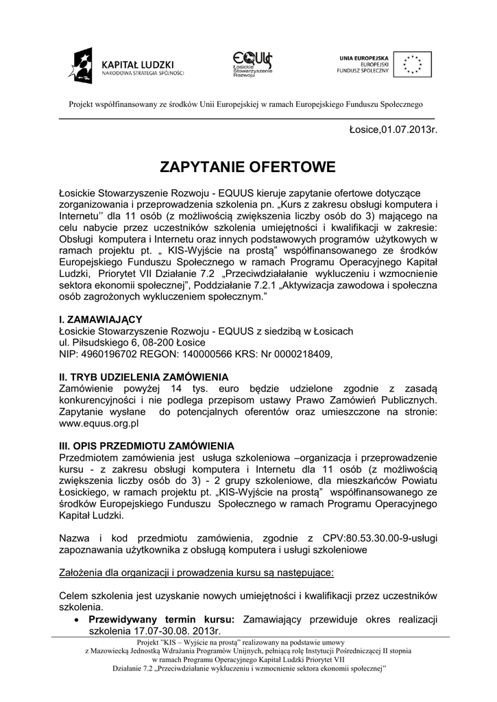 Projekt współfinansowany ze środków Unii Europejskiej w ramach Europejskiego Funduszu Społecznego Łosice,01.07.2013r. ZAPYTANIE OFERTOWE Łosickie Stowarzyszenie Rozwoju - EQUUS kieruje zapytanie ofertowe dotyczące zorganizowania i przeprowadzenia szkolenia pn. „Kurs z zakresu obsługi komputera i Internetu’’ dla 11 osób (z możliwością zwiększenia liczby osób do 3) mającego na celu nabycie przez uczestników szkolenia umiejętności i kwalifikacji w zakresie: Obsługi komputera i Internetu oraz innych podstawowych programów użytkowych w ramach projektu pt. „ KIS-Wyjście na prostą” współfinansowanego ze środków Europejskiego Funduszu Społecznego w ramach Programu Operacyjnego Kapitał Ludzki, Priorytet VII Działanie 7.2 „Przeciwdziałałanie wykluczeniu i wzmocnienie sektora ekonomii społecznej”, Poddziałanie 7.2.1 „Aktywizacja zawodowa i społeczna osób zagrożonych wykluczeniem społecznym.” I. ZAMAWIAJĄCY Łosickie Stowarzyszenie Rozwoju - EQUUS z siedzibą w Łosicach ul. Piłsudskiego 6, 08-200 Łosice NIP: 4960196702 REGON: 140000566 KRS: Nr 0000218409, II. TRYB UDZIELENIA ZAMÓWIENIA Zamówienie powyżej 14 tys. euro będzie udzielone zgodnie z zasadą konkurencyjności i nie podlega przepisom ustawy Prawo Zamówień Publicznych. Zapytanie wysłane do potencjalnych oferentów oraz umieszczone na stronie: www.equus.org.pl III. OPIS PRZEDMIOTU ZAMÓWIENIA Przedmiotem zamówienia jest usługa szkoleniowa –organizacja i przeprowadzenie kursu - z zakresu obsługi komputera i Internetu dla 11 osób (z możliwością zwiększenia liczby osób do 3) - 2 grupy szkoleniowe, dla mieszkańców Powiatu Łosickiego, w ramach projektu pt. „KIS-Wyjście na prostą” współfinansowanego ze środków Europejskiego Funduszu Społecznego w ramach Programu Operacyjnego Kapitał Ludzki. Nazwa i kod przedmiotu zamówienia, zgodnie z CPV:80.53.30.00-9-usługi zapoznawania użytkownika z obsługą komputera i usługi szkoleniowe Założenia dla organizacji i prowadzenia kursu są następujące: Celem szkolenia jest uzyskanie nowych umiejętności i kwalifikacji przez uczestników szkolenia. Przewidywany termin kursu: Zamawiający przewiduje okres realizacji szkolenia 17.07-30.08. 2013r. Projekt ”KIS – Wyjście na prostą” realizowany na podstawie umowy z Mazowiecką Jednostką Wdrażania Programów Unijnych, pełniącą rolę Instytucji Pośredniczącej II stopnia w ramach Programu Operacyjnego Kapitał Ludzki Priorytet VII Działanie 7.2 „Przeciwdziałanie wykluczeniu i wzmocnienie sektora ekonomii społecznej” Projekt współfinansowany ze środków Unii Europejskiej w ramach Europejskiego Funduszu Społecznego Zamawiający zastrzega sobie prawo wydłużenia terminu realizacji zamówienia. Liczba godzin kursu: - Proponowana liczba godzin: 60 , według przedłożonego programu szkolenia. - Zamówienie ma być zrealizowane zgodnie z programem szkolenia. Wymaga się, aby zajęcia odbywały się wg wcześniej ustalonego z Zamawiającym harmonogramem. Maksymalna dzienna liczba godzin szkolenia nie może przekroczyć 4 godzin zegarowych. Miejsce i sposób organizacji zajęć: -Uczestnicy szkolenia podzieleni są na dwie grupy, zróżnicowane pod względem poziomu umiejętności obsługi komputera, poziom podstawowy 5 osób; poziom średniozaawansowany 6 osób - Miejsce realizacji szkolenia: Łosice. Wykonawca zobowiązuje się zapewnić salę dydaktyczną adekwatną do wielkości grupy, z osobnymi miejscami dla każdego uczestnika szkolenia-jedno stanowisko komputerowe na jedną osobę, z odpowiednim oświetleniem, wentylacją i akustyką, salę wyposażoną w tablicę i inny niezbędny sprzęt do realizacji programu szkoleniowego. Wykonawca zobowiązuje się ubezpieczyć od następstw nieszczęśliwych wypadków osoby skierowane na szkolenie, zgodnie z dostarczoną przez Zamawiającego listą uczestników. Wykonawca zapewni warunki szkolenia zgodne z przepisami bezpieczeństwa i higieny pracy w tym salę szkoleniową, posiłki-lunch na zajęciach grupowych i serwis kawowy. Na pierwszych zajęciach Wykonawca przedstawi i wręczy każdemu uczestnikowi szkolenia Szczegółowy Program Szkolenia i Harmonogram Zajęć, zaakceptowane przez Zamawiającego. Wykonawca zobowiązany jest do przeprowadzenia egzaminu końcowego, sprawdzającego nabytą wiedzę i umiejętności oraz wystawić dla każdego uczestnika zaświadczenie o ukończeniu kursu. Ramowy program kursu: 1.Obsługa Windows-15godz. 2. Obsługa edytora tekstu Word-15 godz. 3. Obsługa arkusza kalkulacyjnego Excel-15 godz. 4. Internet-15 Zamawiający dopuszcza zmianę godzin w podziale na w/w zakresy kursu, biorąc pod uwagę zróżnicowany poziom wiedzy i umiejętności grup szkoleniowych. Zamawiający wymaga opracowania i przedstawienia w ofercie oddzielnych, dwóch programów szkoleniowych dla dwóch grup uczestników, różniących się poziomem wiedzy i umiejętności. Materiały szkoleniowe i pomoce szkoleniowe oferowane uczestnikom szkolenia na własność: Projekt ”KIS – Wyjście na prostą” realizowany na podstawie umowy z Mazowiecką Jednostką Wdrażania Programów Unijnych, pełniącą rolę Instytucji Pośredniczącej II stopnia w ramach Programu Operacyjnego Kapitał Ludzki Priorytet VII Działanie 7.2 „Przeciwdziałanie wykluczeniu i wzmocnienie sektora ekonomii społecznej” Projekt współfinansowany ze środków Unii Europejskiej w ramach Europejskiego Funduszu Społecznego Każdy z uczestników musi otrzymać niezbędne materiały dydaktyczne na własność, obejmujące co najmniej: zeszyt/notatnik, długopis, teczka z drukowanymi materiałami, podręcznik lub skrypt dotyczący podstaw obsługi komputera, pendrive o pojemności min. 2 GB Wykonawca zobowiązuje się do prowadzenia dziennika kursu, list obecności oraz innych dokumentów wg zaleceń Zamawiającego Pomieszczenia, w których będą odbywały się zajęcia muszą być oznaczone poprzez umieszczenie logo Unii