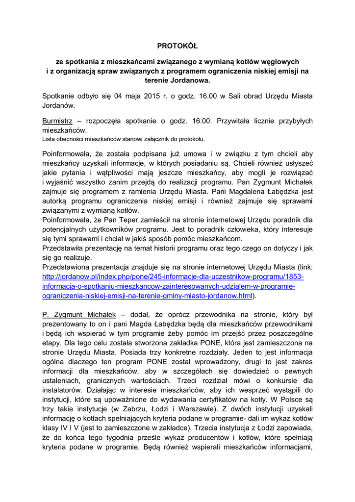 PROTOKÓŁ ze spotkania z mieszkańcami związanego z wymianą kotłów węglowych i z organizacją spraw związanych z programem ograniczenia niskiej emisji na terenie Jordanowa. Spotkanie odbyło się 04 maja 2015 r. o godz. 16.00 w Sali obrad Urzędu Miasta Jordanów. Burmistrz – rozpoczęła spotkanie o godz. 16.00. Przywitała licznie przybyłych mieszkańców. Lista obecności mieszkańców stanowi załącznik do protokołu. Poinformowała, że została podpisana już umowa i w związku z tym chcieli aby mieszkańcy uzyskali informacje, w których posiadaniu są. Chcieli również usłyszeć jakie pytania i wątpliwości mają jeszcze mieszkańcy, aby mogli je rozwiązać i wyjaśnić wszystko zanim przejdą do realizacji programu. Pan Zygmunt Michałek zajmuje się programem z ramienia Urzędu Miasta. Pani Magdalena Łabędzka jest autorką programu ograniczenia niskiej emisji i również zajmuje się sprawami związanymi z wymianą kotłów. Poinformowała, że Pan Teper zamieścił na stronie internetowej Urzędu poradnik dla potencjalnych użytkowników programu. Jest to poradnik człowieka, który interesuje się tymi sprawami i chciał w jakiś sposób pomóc mieszkańcom. Przedstawiła prezentację na temat historii programu oraz tego czego on dotyczy i jak się go realizuje. Przedstawiona prezentacja znajduje się na stronie internetowej Urzędu Miasta (link: http://jordanow.pl/index.php/pone/245-informacje-dla-uczestnikow-programu/1853informacja-o-spotkaniu-mieszkancow-zainteresowanych-udzialem-w-programieograniczenia-niskiej-emisji-na-terenie-gminy-miasto-jordanow.html). P. Zygmunt Michałek – dodał, że oprócz przewodnika na stronie, który był prezentowany to on i pani Magda Łabędzka będą dla mieszkańców przewodnikami i będą ich wspierać w tym programie żeby pomóc im przejść przez poszczególne etapy. Dla tego celu została stworzona zakładka PONE, która jest zamieszczona na stronie Urzędu Miasta. Posiada trzy konkretne rozdziały. Jeden to jest informacja ogólna dlaczego ten program PONE został wprowadzony, drugi to jest zakres informacji dla mieszkańców, aby w szczegółach się dowiedzieć o pewnych ustaleniach, granicznych wartościach. Trzeci rozdział mówi o konkursie dla instalatorów. Działając w interesie mieszkańców, aby ich wesprzeć wystąpili do instytucji, które są upoważnione do wydawania certyfikatów na kotły. W Polsce są trzy takie instytucje (w Zabrzu, Łodzi i Warszawie). Z dwóch instytucji uzyskali informację o kotłach spełniających kryteria podane w programie- dali im wykaz kotłów klasy IV I V (jest to zamieszczone w zakładce). Trzecia instytucja z Łodzi zapowiada, że do końca tego tygodnia prześle wykaz producentów i kotłów, które spełniają kryteria podane w programie. Będą również wspierali mieszkańców informacjami, które posiadają od producentów danych kotłów, ponieważ nawiązali kontakty zarówno z producentami posiadającymi odpowiednie świadectwa i certyfikaty krajów unijnych, a konkretnie Czech. Oprócz tych kryteriów, o których mówiła Pani Burmistrz, czyli wymiany 80 kotłów, drugim kryterium jest zmniejszenie mocy grzewczej w stosunku do starych kotłów o 20%. To jest ilość graniczna. Trzecim kryterium jest kryterium emisji gazów. Jest to dość skomplikowana sytuacja, ale określona jest dokładnie w certyfikatach, które są podane, czyli w polskiej normie klasy IV i V. Niepożądane emisje gazów mają wartości progowe, których nie powinno się przekraczać, aby był spełniony warunek dotacji. Bo zasadniczo najważniejszym celem tego programu, prócz tego, że mieszkańcy wymienią kotły na nowoczesne, jest zmniejszenie gazów trujących substancji. Również w imieniu mieszkańców wystąpili do producentów o wskazanie zakładów instalatorskich posiadających prawa autorskie do występowania w ich imieniu oraz wystąpili do firm instalatorskich, które działały na terenie województwa małopolskiego ale również na terenie województwa śląskiego. Kilku z nich odpowiedziało na apel zobowiązując się przystąpić na zasadzie wspierania tego programu. Najważniejsza rzecz, która dotyczy wszystkich inwestorów, którzy będą realizować ich program to jest to, że w zakładce o naborze instalatorów podane są wszelkie dokumenty i treści, które będą dotyczyły zarówno tych, którzy sami sobie pozyskają instalatorów jak i tych, którzy skorzystają z listy instalatorów zamieszczonej na stronie, których w imieniu mieszkańców sprawdzą i wyedukują czego od nich będą się chcieli spodziewać. Powiedział, że mieszkańcy nie są specjalistami w tej dziedzinie i trudno ich obarczać odpowiedzialnością za wszelkie poprawne działania i będą chcieli podpowiadać co należy żądać od instalatora jeśli sami sobie go wybiorą, jak również zamieszczone będą wzory dokumentów, które instalator musi wypełnić. Istotną sprawa przy wyborze instalatora jest żądanie od niego kosztorysu ofertowego. Czyli żeby mieszkańcy przystępując do transakcji wiedzieli jakie oni chcą w ich imieniu wartości wnosić w dbałości o ich interes. Podane są kryteria dotyczące gwarancji, robót, które będą wykonywane, zakresy robót zaliczanych do kosztów kwalifikowanych, ale również dot. sprawy likwidacji starego kotła. Stary kocioł musi być zlikwidowany, wyzłomowany i odpowiednio poświadczony, że został wyzłomowany. WFOŚ żąda stosownego potwierdzenia likwidacji kotła i stosowanego zaświadczenia o tym. Przygotowali wzory różnych formularzy aby mieszkańcy mogli z tego korzystać. Wszystko znajduje się w zakładce na stronie internetowej, a jeśli ktoś nie ma dostępu do Internetu to zaprasza do Urzędu i wydrukują te dokumenty. Dodał, że na stronie, która dedykowana jest jako informacja zbiorowa dla mieszkańców są zamieszczone nazwy kotłów i producentów, które posiadają certyfikaty. Certyfikaty były potwierdzon