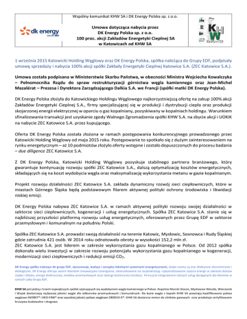 Wspólny komunikat KHW SA i DK Energy Polska sp. z o.o. Umowa dotycząca nabycia przez DK Energy Polska sp. z o.o. 100 proc. akcji Zakładów Energetyki Cieplnej SA w Katowicach od KHW SA 1 września 2015 Katowicki Holding Węglowy oraz DK Energy Polska, spółka należąca do Grupy EDF, podpisały umowę sprzedaży i nabycia 100% akcji spółki Zakłady Energetyki Cieplnej Katowice S.A. (ZEC Katowice S.A.). Umowa została podpisana w Ministerstwie Skarbu Państwa, w obecności Ministra Wojciecha Kowalczyka – Pełnomocnika Rządu do spraw restrukturyzacji górnictwa węgla kamiennego oraz Jean-Michel Mazalérat – Prezesa i Dyrektora Zarządzającego Dalkia S.A. we Francji (spółki matki DK Energy Polska). DK Energy Polska złożyła do Katowickiego Holdingu Węglowego najkorzystniejszą ofertę na zakup 100% akcji Zakładów Energetyki Cieplnej S.A., firmy specjalizującej się w produkcji i dystrybucji ciepła oraz produkcji skojarzonej energii elektrycznej w oparciu o gaz kopalniany, pozyskiwany w kopalniach holdingu. Warunkiem sfinalizowania transakcji jest uzyskanie zgody Walnego Zgromadzenia spółki KHW S.A. na zbycie akcji i UOKiK na nabycie ZEC Katowice S.A. przez kupującego. Oferta DK Energy Polska została złożona w ramach postępowania konkurencyjnego prowadzonego przez Katowicki Holding Węglowy od maja 2015 roku. Postępowanie to spotkało się z dużym zainteresowaniem na rynku energetycznym – aż 10 podmiotów złożyło oferty wstępne i zostało dopuszczonych do procesu badania – due diligence ZEC Katowice S.A. Z DK Energy Polska, Katowicki Holding Węglowy pozyskuje stabilnego partnera branżowego, który gwarantuje kontynuację rozwoju spółki ZEC Katowice S.A., dalszą optymalizację kosztów energetycznych, składających się na koszt wydobycia węgla oraz maksymalizację wykorzystania metanu w gazie kopalnianym. Projekt rozwoju działalności ZEC Katowice S.A. zakłada dynamiczny rozwój sieci ciepłowniczych, które w miastach Górnego Śląska będą podstawowym filarem aktywnej polityki ochrony środowiska i likwidacji niskiej emisji. DK Energy Polska nabywa ZEC Katowice S.A. w ramach aktywnej polityki rozwoju swojej działalności w sektorze sieci ciepłowniczych, kogeneracji i usług energetycznych. Spółka ZEC Katowice S.A. stanie się w najbliższej przyszłości platformą rozwoju usług energetycznych, oferowanych przez Grupę EDF w sektorze przemysłowym i komunalnym na południu Polski. Spółka ZEC Katowice S.A. prowadzi swoją działalność na terenie Katowic, Mysłowic, Sosnowca i Rudy Śląskiej gdzie zatrudnia 421 osób. W 2014 roku odnotowała obroty w wysokości 152,2 mln zł. ZEC Katowice S.A. jest liderem w zakresie wykorzystania gazu kopalnianego w Polsce. Od 2012 spółka dokonała wielu inwestycji w zakresie rozwoju potencjału wykorzystania gazu kopalnianego w kogeneracji, modernizacji sieci ciepłowniczych i redukcji emisji CO2. DK Energy spółka należąca do grupy EDF, opracowuje, buduje i zarządza lokalnymi systemami energetycznymi, dzięki czemu są one efektywne ekonomicznie i ekologiczne. DK Energy oferuje swoim klientom innowacyjne rozwiązania, ukierunkowane na racjonalizację i optymalizowanie zużycia energii w zakresie dostaw ciepła i chłodu, energii elektrycznej, mediów przemysłowych oraz obsługi technicznej instalacji. Firma jest integratorem różnych usług dostępnych dla klientów w ramach całej Grupy EDF. KHW SA jest jedną z trzech największych spółek zajmujących się wydobyciem węgla kamiennego w Polsce. Kopalnie Murcki-Staszic, Mysłowice-Wesoła, Wieczorek i Wujek dostarczają najlepszej jakości węgle dla odbiorców przemysłowych i komunalnych. Na bazie węgla z kopalń KHW SA powstają kwalifikowane paliwa węglowe EKORET® i EKO-FINS® oraz wysokiej jakości paliwo węglowe ORZECH-E®. KHW SA dostarcza metan do silników gazowych oraz produkuje certyfikowane kruszywa budowalne i drogowe.