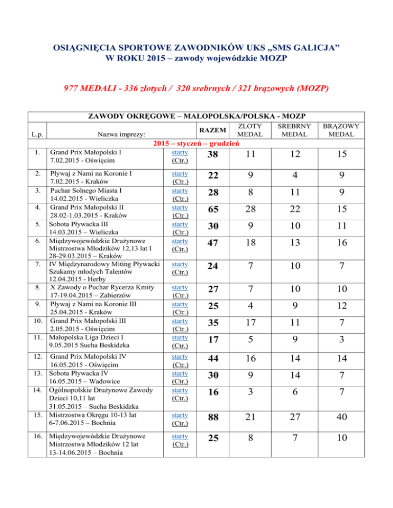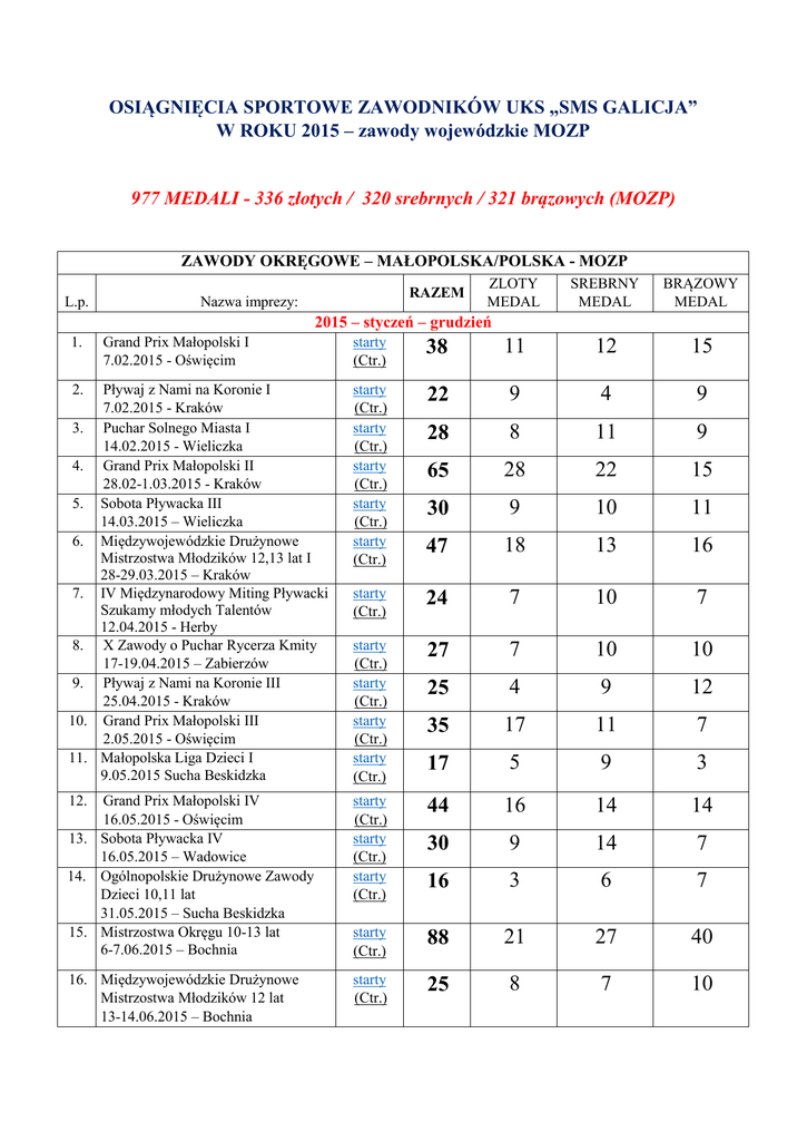 OSIĄGNIĘCIA SPORTOWE ZAWODNIKÓW UKS „SMS GALICJA” W ROKU 2015 – zawody wojewódzkie MOZP 977 MEDALI - 336 złotych / 320 srebrnych / 321 brązowych (MOZP) ZAWODY OKRĘGOWE – MAŁOPOLSKA/POLSKA - MOZP L.p. RAZEM Nazwa imprezy: ZLOTY MEDAL SREBRNY MEDAL BRĄZOWY MEDAL 2015 – styczeń – grudzień 1. Grand Prix Małopolski I 7.02.2015 - Oświęcim starty (Ctr.) 38 11 12 15 Pływaj z Nami na Koronie I 7.02.2015 - Kraków 3. Puchar Solnego Miasta I 14.02.2015 - Wieliczka 4. Grand Prix Małopolski II 28.02-1.03.2015 - Kraków 5. Sobota Pływacka III 14.03.2015 – Wieliczka 6. Międzywojewódzkie Drużynowe Mistrzostwa Młodzików 12,13 lat I 28-29.03.2015 – Kraków 7. IV Międzynarodowy Miting Pływacki Szukamy młodych Talentów 12.04.2015 - Herby 8. X Zawody o Puchar Rycerza Kmity 17-19.04.2015 – Zabierzów 9. Pływaj z Nami na Koronie III 25.04.2015 - Kraków 10. Grand Prix Małopolski III 2.05.2015 - Oświęcim 11. Małopolska Liga Dzieci I 9.05.2015 Sucha Beskidzka starty (Ctr.) starty (Ctr.) starty (Ctr.) starty (Ctr.) starty (Ctr.) 22 9 4 9 28 8 11 9 65 28 22 15 30 9 10 11 47 18 13 16 starty (Ctr.) 24 7 10 7 starty (Ctr.) starty (Ctr.) starty (Ctr.) starty (Ctr.) 27 7 10 10 25 4 9 12 35 17 11 7 17 5 9 3 Grand Prix Małopolski IV 16.05.2015 - Oświęcim 13. Sobota Pływacka IV 16.05.2015 – Wadowice 14. Ogólnopolskie Drużynowe Zawody Dzieci 10,11 lat 31.05.2015 – Sucha Beskidzka 15. Mistrzostwa Okręgu 10-13 lat 6-7.06.2015 – Bochnia starty (Ctr.) starty (Ctr.) starty (Ctr.) 44 16 14 14 30 9 14 7 16 3 6 7 starty (Ctr.) 88 21 27 40 16. Międzywojewódzkie Drużynowe Mistrzostwa Młodzików 12 lat 13-14.06.2015 – Bochnia starty (Ctr.) 25 8 7 10 2. 12. 17. 18. 19. 20. 21 22. 23. 24. 25. 26. 27. Puchar Solnego Miasta II 20.06.2015 – Wieliczka Mistrzostwa Okręgu 14lat i starsi 19-20.06.2015 - Oświęcim Międzywojewódzkie Drużynowe Mistrzostwa Młodzików 13 lat 20-21.06.2015 - Kraków Grand Prix Małopolski I Puchar Wszechstronności Stylowej 10.10.2015 – Bochnia Pływaj z Nami na Koronie III 17.10.2015 - Kraków Sobota Pływacka I 7.11.2015 – Sucha Beskidzka Grand Prix Małopolski II 8.11.2015 – Bochnia Sobota Pływacka II 21.11.2015 – Bochnia Małopolska Liga Dzieci II 28.11.2015 – Tarnów Zimowe Mistrzostwa Okręgu 5-6.12.2015 – Bochnia Już Pływam 6.12.2015 - Miechów RAZEM: starty (Ctr.) starty (Ctr.) starty (Ctr.) 16 7 6 3 8 1 3 4 2 1 0 1 starty (Ctr.) 17 6 6 5 starty (Ctr.) starty (Ctr.) starty (Ctr.) starty (Ctr.) starty (Ctr.) starty (Ctr.) starty (Ctr.) 38 15 11 12 39 16 11 12 57 18 18 21 46 15 13 18 36 13 14 9 153 64 48 41 4 0 1 3 336 320 321 977 Okienka kolumny z nazwą „starty (Ctr.)” umożliwia połączenie się online z szczegółowymi zestawieniami wyników poszczególnych zawodów. Link łączy z zestawieniami indywidualnymi, na których oprócz osiągniętego miejsca każdego zawodnika można śledzić jego „progres” – procent uzyskanego czasu do rekordu życiowego - Oprócz widocznych wyżej zestawień wyników indywidualnych nasi zawodnicy wielokrotnie wygrywali, bądź zajmowali miejsca 1-3 w zestawieniach punktów drużynowych na zawodach cyklicznych jak: Już Pływam, Małopolska Liga Dzieci, Sobota Pływacka, Grand Prix Małopolski czy Mistrzostwa Okręgu. Indywidualnie nasi zawodnicy byli również wielokrotnie klasyfikowani na najwyższych miejscach w zestawieniach na „najlepszego zawodnika” – za sumę punktów, startów indywidualnych. - na zakończenie sezonu letniego 2014/2015 MOZP powołał do Kardy Wojewódzkiej Juniorów i Młodzików następujących zawodników UKS „SMS Galicja”: 42 ZAWODNIKÓW – KADRA WOJEWÓDZKA MOZP 2015: Junior Młodszy 16 lat: Rogowska Angelika Szczepaniak Paweł Junior Młodszy 15 lat: Balicki Michał Lechowicz Nadia Junior Młodszy 14 lat: Batko Karol Cholewa Karolina Goraj Marcin Hojoł Agata Pogorzelska Laura Staniszewska Laura Woźniak Łukasz Wójcik Paweł Młodzik 13 lat: Pająk Jakub Augustyn Jan Krzysztyński Jan Pniak Bartosz Czajka Michał Król Wiktoria Widurska Kinga Spórna Weronika Kulisiewicz Adrianna Nogieć Aleksandra Kozera Zuzanna Pomorska Maja Młodzik 12 lat: Lewicki Filip Wanat Grzegorz Dybowski Jan Sikora Kacper Gwóźdź Kacper Skrzypek Filip Grzenkowicz Paweł Bartłomowicz Tomasz Sowa Łukasz Fortuna Filip Płonka Jakub Basa Szymon Chabałowska Ewa Kozdęba Karolina Klimczyk Emilia Jodłowska Zuzanna Tasak Aleksandra Oczkowska Daria - na zakończenie roku kalendarzowego 2015, nasi zawodnicy ustanowili 10 NOWYCH REKORDÓW OKRĘGU MAŁOPOLSKIEGO w wyścigach indywidualnych: MARCIN GORAJ (14 lat): Basen 25m: 100m stylem grzbietowym 0:56,41 200m stylem grzbietowym 2:02,85 50m stylem motylkowym 0:25,70 100m stylem motylkowym 0:56,07 100m stylem zmiennym 0:58,86 200m stylem zmiennym 2:09,79 Basen 50m: 100m stylem dowolnym 0:56,16 50m stylem grzbietowym 0:28,00 100m stylem grzbietowym 0:59,12 100m stylem motylkowym 0:57,63 - oraz 3 NOWE REKORDY OKRĘGU MAŁOPOLSKIEGO w wyścigach sztafetowych 4x50m stylem zmiennym 14 lat: 1:51,79 płynąc w składzie DUDZIK SEBASTIAN, GORAJ MARCIN, WOŹNIAK ŁUKASZ, BATKO KAROL 4x50m stylem zmiennym mix 12 lat: 2:27,04 płynąc w składzie PIOTROWICZ MARTYNA, BRYG BARTOSZ, STANEK KACPER, PLUCIŃSKA KLAUDIA 4x50m stylem zmiennym mix 110 lat: 2:38,18 płynąc w składzie CICHA ALEKSANDRA, ZAWODNY OLIWIA, SOWA BARTŁOMIEJ, GOŚCIŃSKI JAKUB