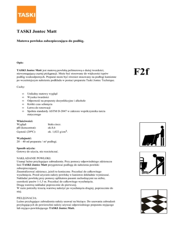 TASKI Jontec Matt Matowa powłoka zabezpieczająca do podłóg. Opis: TASKI Jontec Matt jest matową powłoką polimerową o dużej twardości, niewymagającą częstej pielęgnacji. Może być stosowany do większości typów podłóg wodoodpornych. Preparat może być również stosowany na podłogi kamienne po wcześniejszym nałożeniu podkładu w postaci preparatu Taski Jontec Technique. Cechy: • • • • • • Unikalny matowy wygląd Wysoka twardości Odporność na preparaty dezynfekcyjne i alkohole Krótki czas schnięcia Łatwa do renowacji Spełnia standardy ASTM D-2047 w zakresie współczynnika tarcia statycznego Właściwości: Wygląd: pH (koncentrat): Gęstość (20oC): biała ciecz. ok.8,6 ok. 1,022 g/cm3. Wydajność: 20 – 40 ml preparatu / m² podłogi. Sposób użycia: Gotowy do użycia, nie rozcieńczać. NAKŁADANIE POWŁOKI: Usunąć luźno przylegające zabrudzenia. Przy pomocy odpowiedniego zdzieracza linii TASKI Jontec Matt przygotować podłogę do nałożenia powłoki zabezpieczającej. Zneutralizować zdzieracz, jeżeli to konieczne. Poczekać do całkowitego wyschnięcia. Przed użyciem należy powłokę w kanistrze dokładnie wymieszać. Nakładać powłokę przy pomocy aplikatora pasami zachodzącymi na siebie, szerokość pasów 1-1,5 m. Poczekać do całkowitego wyschnięcia. Drugą warstwę nakładać poprzecznie do pierwszej. W razie potrzeby trzecią warstwę nałożyć po wyschnięciu drugiej, poprzecznie do niej. PIELĘGNACJA: Luźno przylegające zabrudzenia należy usuwać na bieżąco. Do usuwania zabrudzeń przylegających do powierzchni należy używać odpowiedniego preparatu myjącego lub myjąco-powlekającego TASKI Jontec.Matt. F2f UWAGA: Nie wlewać preparatu ponownie do opakowania. Warunki przechowywania i środki ostrożności: Kompletne informacje odnośnie warunków przechowywania i środków ostrożności wymaganych przy pracy z preparatem Taski Jontec Matt znajdują się w karcie charakterystyki preparatu niebezpiecznego. Przechowywać w oryginalnych opakowaniach w temperaturze powyżej 5oC. UWAGA: Preparat przeznaczony do profesjonalnego stosowania. Dokładny sposób użycia preparatu, dostosowany do Państwa potrzeb określi nasz przedstawiciel.