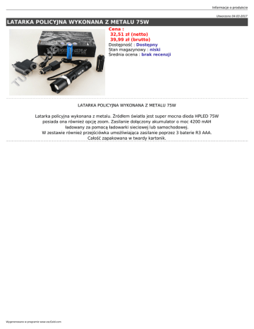 Informacje o produkcie Utworzono 04-03-2017 LATARKA POLICYJNA WYKONANA Z METALU 75W Cena : 32,51 zł (netto) 39,99 zł (brutto) Dostępność : Dostępny Stan magazynowy : niski Średnia ocena : brak recenzji LATARKA POLICYJNA WYKONANA Z METALU 75W Latarka policyjna wykonana z metalu. Źródłem światła jest super mocna dioda HPLED 75W posiada ona również opcję zoom. Zasilanie dołączony akumulator o moc 4200 mAH ładowany za pomocą ładowarki sieciowej lub samochodowej. W zestawie również przejściówka umożliwiająca zasilanie poprzez 3 baterie R3 AAA. Całość zapakowana w twardy kartonik. Wygenerowano w programie www.oscGold.com