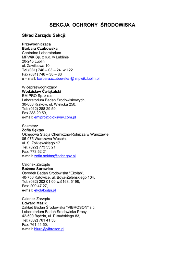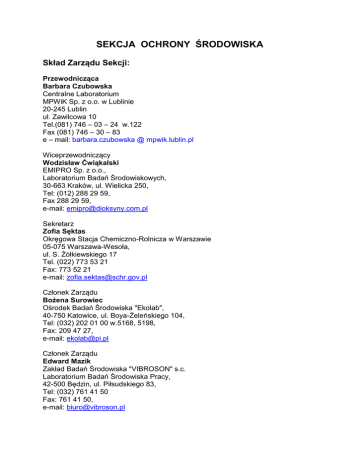 SEKCJA OCHRONY ŚRODOWISKA Skład Zarządu Sekcji: Przewodnicząca Barbara Czubowska Centralne Laboratorium MPWiK Sp. z o.o. w Lublinie 20-245 Lublin ul. Zawilcowa 10 Tel.(081) 746 – 03 – 24 w.122 Fax (081) 746 – 30 – 83 e – mail: barbara.czubowska @ mpwik.lublin.pl Wiceprzewodniczący Wodzisław Ćwiąkalski EMIPRO Sp. z o.o., Laboratorium Badań Środowiskowych, 30-663 Kraków, ul. Wielicka 250, Tel: (012) 288 29 59, Fax 288 29 59, e-mail: [email protected] Sekretarz Zofia Sęktas Okręgowa Stacja Chemiczno-Rolnicza w Warszawie 05-075 Warszawa-Wesoła, ul. S. Żółkiewskiego 17 Tel. (022) 773 53 21 Fax: 773 52 21 e-mail: [email protected] Członek Zarządu Bożena Surowiec Ośrodek Badań Środowiska "Ekolab", 40-750 Katowice, ul. Boya-Żeleńskiego 104, Tel: (032) 202 01 00 w.5168, 5198, Fax: 209 47 27, e-mail: [email protected] Członek Zarządu Edward Mazik Zakład Badań Środowiska "VIBROSON" s.c. Laboratorium Badań Środowiska Pracy, 42-500 Będzin, ul. Piłsudskiego 83, Tel: (032) 761 41 50 Fax: 761 41 50, e-mail: [email protected] Skład Zarządu Sekcji – wybory przeprowadzone 28 – 29.11.2013r. Przewodnicząca Zofia Sęktas Okręgowa Stacja Chemiczno-Rolnicza w Warszawie 05-075 Warszawa-Wesoła, ul. S. Żółkiewskiego 17 Tel. (22) 773 53 21 Fax: 773 52 21 e-mail: [email protected] Wiceprzewodniczący Michał Kuryło Centralne Laboratorium MPWiK Sp. z o.o. w Lublinie 20-245 Lublin ul. Zawilcowa 10 Tel.(81) 746 03 24 w.116 Fax (81) 746 30 83 e – mail: michal.kurylo @ mpwik.lublin.pl Sekretarz Jadwiga Jakubowska WIOŚ Rzeszów Delegatura Przemyśl 35-7101 Rzeszów, ul. M. Langiewicza 26, Tel: (17) 854 36 83, (16) 678 44 96 w.39 Fax: 854 38 41, e-mail: [email protected] Członek Zarządu Anna Ruchała EMIPRO Sp. z o.o., Laboratorium Badań Środowiskowych, 30-663 Kraków, ul. Wielicka 250, Tel: (12) 288 29 59, Fax 288 29 60, e-mail: [email protected] Członek Zarządu Krzysztof Jędrzejczyk Przedsiębiorstwo Geologiczne Sp. z o.o. Laboratorium Badań Środowiskowych 25-214 Kielce, ul. Hauke Bosaka 3A, Tel: (41) 365 10 13 Fax: 365 10 10, e-mail: krzysztof.ję[email protected] Sprawozdanie z działalności za 2013r. Sekcja Ochrony Środowiska Klubu Laboratoriów Badawczych POLLAB aktualnie liczy 112 członków rzeczywistych wywodzących się z laboratoriów badających środowisko naturalne (laboratoria wodociągowe, inspekcji ochrony środowiska, SANEPID) oraz wykonujących pomiary w środowisku pracy. W 2013r. w ramach swej działalności Sekcja zgodnie z Planem Działalności odbyła jedno spotkanie: W dniach 28 - 29.11.2013r. w Lublinie w Miejskim Przedsiębiorstwie Wodociągów i Kanalizacji Sp. z o.o. Sekcja Ochrony Środowiska zebrała się na swoje coroczne spotkanie. W spotkaniu uczestniczyło 21 osób. Tematami spotkania były: 1. 2. 3. 4. Badania sensoryczne wody – oznaczanie barwy. Metody referencyjne i alternatywne w obszarach regulowanych prawnie. Korozyjność wody. Zadania laboratorium analiz środowiskowych w rozwiązywaniu współczesnych problemów ekorozwoju. Jakość prezentacji, przygotowanie i zaangażowanie prowadzących w oczach Kolegium Sekcji oraz uczestników spotkania zyskała bardzo pozytywną ocenę, co pozwala uznać spotkanie Sekcji za wysoce profesjonalne szkolenia merytoryczne. Prelekcje zrealizowane zostały wyłącznie przez członków Sekcji. Prelegentami spotkania Sekcji byli: Ewa Bielecka PSSE Siedlce, Tomasz Żytyński: Centralne Laboratorium MPWiK Sp. z o.o. w Lublinie Jadwiga Jakubowska WIOŚ Rzeszów Delegatura Przemyśl oraz Paweł Golianek Politechnika Lubelska. Materiały z prezentacji przekazano do Klubu Polskich Laboratoriów Badawczych POLLAB. Ponadto w trakcie spotkania w gronie uczestników omówiono szereg interesujących członków Sekcji tematów – m.in. poruszono następujące zagadnienia: - wymiana doświadczeń na temat bieżącego funkcjonowania, nadzorowania oraz doskonalenia skuteczności systemów zarządzania w laboratorium badawczym, - praktyczne rozwiązania problemów systemowych i merytorycznych w analityce laboratoryjnej na przykładach prezentowanych przez członków Sekcji, - rola i obowiązki Kierownika ds. jakości i Kierownictwa Technicznego, - organizowanie badań porównawczych pobierania próbek wody - nowe wydanie dokumentu PCA DAB – 07 wyd. 10 z dnia 16.10.2013r. W trakcie spotkania rozważono propozycje tematów prezentacji, które Sekcja zamierza zgłosić na Sympozjum POLLAB w roku 2014. Przedyskutowano również wstępne propozycje tematyczne na spotkania Sekcji na rok 2014. -2Sekcja w 2013 nie przeprowadziła badań porównawczych. Mimo zachęty ze strony Zarządu Sekcji nie zgłosiła się żadna jednostka, która podjęłaby się organizowania takich badań. Zachęcam więc członków Sekcji do większej aktywności w tym zakresie w roku 2014. Wstępnie ustalono, że Sekcja przeprowadzi badania porównawcze pobierania próbek wody. Inne propozycje tematyczne proszę kierować na adres e-mailowy Przewodniczącej Sekcji. Członkowie Sekcji Ochrony Środowiska POLLAB w 2013r. nie uczestniczyli w wyjazdach zagranicznych organizowanych przez POLLAB. Sekcja Ochrony Środowiska określiła działania na rok 2014 w Planie Działalności przekazanym do Klubu POLLAB. Plan obejmuje jedno spotkanie członków Sekcji oraz zorganizowanie czterech badań PT/ILC. Spotkania Sekcji, umożliwiające wymianę doświadczeń poprzez dyskusje poruszające bieżące problemy merytoryczne oraz dotyczące funkcjonowania laboratoriów w systemach zarządzania, dają możliwości szkoleniowe w zakresie nowych wymagań. Są niezmiernie korzystne dla członków Klubu POLLAB i w sposób rzetelny i nieoceniony wypełniają ideę istnienia i funkcjonowania Klubu POLLAB. Z uwagi na przewidywane przejście na emeryturę z początkiem roku 2015 członkom Sekcji dziękuję za aktywność, życzliwość i serdeczną atmosferę podczas spotkań. Zachęcam do twórczej i konstruktywnej współpracy w roku 2014 oraz