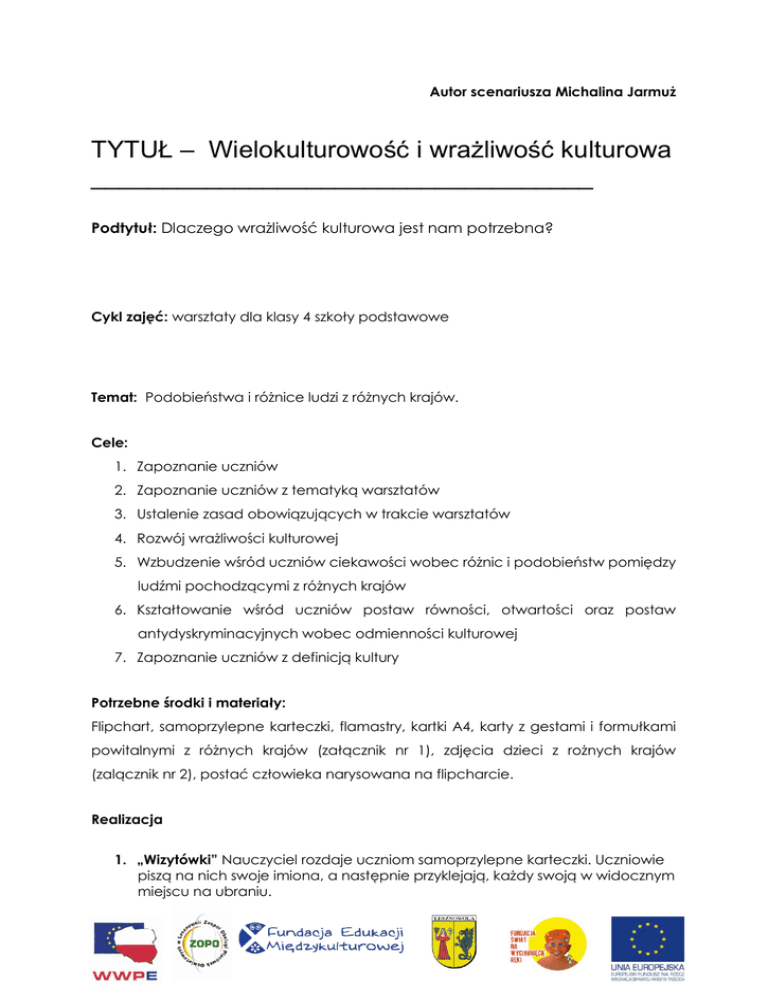 Autor scenariusza Michalina Jarmuż TYTUŁ – Wielokulturowość i wrażliwość kulturowa ___________________________________ Podtytuł: Dlaczego wrażliwość kulturowa jest nam potrzebna? Cykl zajęć: warsztaty dla klasy 4 szkoły podstawowe Temat: Podobieństwa i różnice ludzi z różnych krajów. Cele: 1. Zapoznanie uczniów 2. Zapoznanie uczniów z tematyką warsztatów 3. Ustalenie zasad obowiązujących w trakcie warsztatów 4. Rozwój wrażliwości kulturowej 5. Wzbudzenie wśród uczniów ciekawości wobec różnic i podobieństw pomiędzy ludźmi pochodzącymi z różnych krajów 6. Kształtowanie wśród uczniów postaw równości, otwartości oraz postaw antydyskryminacyjnych wobec odmienności kulturowej 7. Zapoznanie uczniów z definicją kultury Potrzebne środki i materiały: Flipchart, samoprzylepne karteczki, flamastry, kartki A4, karty z gestami i formułkami powitalnymi z różnych krajów (załącznik nr 1), zdjęcia dzieci z rożnych krajów (zalącznik nr 2), postać człowieka narysowana na flipcharcie. Realizacja 1. „Wizytówki” Nauczyciel rozdaje uczniom samoprzylepne karteczki. Uczniowie piszą na nich swoje imiona, a następnie przyklejają, każdy swoją w widocznym miejscu na ubraniu. 2. „O czym będą warsztaty?” Nauczyciel opowiada uczniom czego będą dotyczyły warsztaty, jaka będzie forma pracy w trakcie ich trwania i czym jest rozwój wrażliwości/ inteligencji kulturowej. 3. „Kontrakt” Nauczyciel zapisuje na flipcharcie ustalone razem z uczniami zasady, które będą obowiązywały wszystkich w trakcie warsztatów. Ustalone zasady - kontrakt na każdym warsztacie będą zawieszone w widocznym miejscu, będą pomagały w realizacji zajęć w formie warsztatowej tj., aktywnej. Zasady kontraktu m.in. mogą być następujące: szanujemy siebie i innych; gdy mówi jedna osoba, reszta słucha; nie używamy telefonów i Inn.; nie oceniamy się; jesteśmy punktualni itd. Zostawiamy miejsce na inne zasady, które pojawią się w trakcie następnych warsztatów. 4. „Powitania w różnych kulturach” nauczyciel rozdaje wcześniej przygotowane karteczki na których są opisane gesty powitalne z różnych krajów lub formułki powitalne. Zadaniem uczniów jest przywitać się każdy z każdym zgodnie z instrukcją na wylosowanej karteczce (załącznik nr 1). 5. „Dzieci z różnych stron świata” nauczyciel dzieli klasę na 4 grupy. Każda grupa otrzymuje zestaw zdjęć (załącznik nr 2), na których są przedstawione dzieci pochodzące z różnych krajem. Zadaniem każdej grupy jest wypisanie na kartce jakie są podobieństwa, a jakie są różnice pomiędzy dziećmi na zdjęciach. Kiedy grupy będą gotowe nauczyciel prosi po kolei o przedstawienie zapisanych podobieństw i różnic, które zapisuje na flipcharcie obok narysowanego wcześniej człowieka. Wszystkie te cechy które odnoszą się do cech indywidualnych ludzi (tj. kolor skóry, oczy etc) nauczyciel zapisuje w górnej części postaci, cechy które odnoszą się do cech uniwersalnych wszystkich ludzi (tj. ludzie, uczucia, dzieci etc) zapisuje w środkowej części postaci człowiek, natomiast kulturowe (tj. strój tradycyjny, kraj etc) w dolnej. Wtrakcie zapisywania cech nauczyciel nie tłumaczy uczniom podziału, to zostanie zrobione w podsumowaniu. 6. „Podsumowanie” W trakcie podsumowania nauczyciel odczytuje wszystkie zapisane wcześniej cechy. Mówi również że wszystkie te cechy podzielił na 3 grupy. Nauczyciel zadaje pytanie uczniom, jak myślą co to są za grupy cech, których podziału dokonał. W razie potrzeby nauczyciel naprowadza uczniów do właściwych odpowiedzi. Następnie zadaje pytania odnoszące się do części cech kulturowe: Czy w każdym kraju jest tak samo? Czy ludzie z różnych krajów się różnią? 7. „Kwiatek – co nas łączy, co nas dzieli” Nauczyciel dzieli klasę na grupy 4-5 osobowe. Zadaniem każdej z grup jest narysowanie kwiatka, który będzie miał tyle płatków ilu jest członków grupy. Na środku kwiatka wypisujemy co najmniej 5 rzeczy, które łączą wszystkie osoby w grupie (wspólne zainteresowania, umiejętności, doświadczenia). Każdy płatek jest przypisany do jednej osoby i podpisany jej imieniem. Na płatkach wpisujemy, co odróżnia daną osobę od pozostałych członków grupy. Następnie grupy po kolei prezentują swoje kwiatki reszcie klasy. Załącznik nr 1 1. POWITANIA W RÓŻNYCH KRAJACH, RYTUAŁY POWITALNE: INSTRUKCJA: Witając się ze wszystkimi powiedz z jakiego kraju jesteś i wykonaj poniżej opisany gest przywitania Chiny: lekki pokłon ze skrzyżowanymi na piersiach ramionami; Francja: podanie dłoni i pocałunek w oba policzki; Rosja: objęcie i trzy pocałunki w policzki; Indie: lekki ukłon, złożone dłonie trzymane są przy tym na wysokości czoła; Japonia: lekki pokłon, ramiona i dłonie blisko ciała; Niemcy: podanie dłoni patrzymy w oczy partnerowi; Malezja: lekkie uściśnięcie dłoni partnera obiema rękami, przy czym dotykają się one tylko koniuszkami palców. INSTRUKCJA: Witając się ze wszystkimi powiedz z jakiego kraju jesteś i wypowiedz lub przeczytaj poniższą formułkę powitalną. Włochy: Bon giorno. Szwajcaria: Gruezi. Japonia: Konicziła. Stany Zjednoczone: Hi. Czechy: Dobry den. Anglia: Hello. Niemcy: Guten Tag. Hiszpania: Buenos Dias. Hawaje: Aloha. Francja: Bonjours; Salut. Malezja: Selamat datang. Rosja: Sdrastvuj. Czechy: Dobry den. Izrael: Shalom. Dania: Goddag Egipt: Asalam Aleikum. Turcja: Merhaba Załącznik nr 2