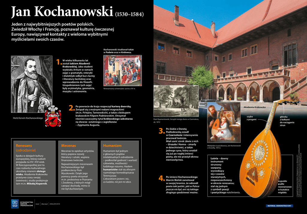 Jan Kochanowski (1530–1584) Dante Gabriel Rossetti Święty Graal, 1874 Jeden z najwybitniejszych poetów polskich. Zwiedził Włochy i Francję, poznawał kulturę ówczesnej Europy, nawiązywał kontakty z wieloma wybitnymi myślicielami swoich czasów. Kochanowski studiował także w Padwie oraz w Królewcu. 2. Herb Korwin Kochanowskiego Renesans (odrodzenie) Epoka w dziejach kultury europejskiej, której rozkwit przypada na XV i XVI wiek. W Rzeczypospolitej jest to czas rozkwitu kulturalnego określany mianem złotego wieku. Akademia Krakowska przeżywa czasy swojej świetności, studia podejmuje tam m.in. Mikołaj Kopernik. Renesansowy uniwersytet, rycina z XV w. Po powrocie do kraju rozpoczął karierę dworską. Związał się z możnymi rodami magnackimi (m.in. Firlejów, Tarnowskich), a także z biskupem krakowskim Filipem Padniewskim. Otrzymał również zaszczytny tytuł królewskiego sekretarza na dworze ostatniego z Jagiellonów – Zygmunta Augusta. Mecenas Humanizm Mecenas to opiekun artystów, który popiera rozwój literatury i sztuki, wspiera finansowo twórców. Najważniejszym mecenasem Kochanowskiego był podkanclerzy Piotr Myszkowski. Dzięki jego pomocy poeta otrzymał m.in. probostwa w Poznaniu i Zwoleniu, z których mógł czerpać dochody, mimo iż nie był duchownym. Humanizm był jednym z głównych prądów intelektualnych odrodzenia – podkreślał godność i wartość człowieka, możliwości ludzkiego rozumu. Hasłem humanistów stał się aforyzm rzymskiego komediopisarza Terencjusza: Człowiekiem jestem i nic, co ludzkie, nie jest mi obce. Akademia Krakowska szyjka z progami Piotr Dyamentowski, Szczątki starego dworu w Czarnolesiu, ok. 1872 3. 4. Po ślubie z Dorotą Podlodowską osiadł w Czarnolesie i intensywnie pracował twórczo. Miał sześć córek (dwie z nich – Urszula i Hanna – zmarły w dzieciństwie), a także jednego syna, który urodził się już po nagłej śmierci poety, ale nie przeżył okresu niemowlęctwa. Po śmierci Kochanowskiego Marcin Bielski zanotował w swojej kronice, że odszedł poeta taki polski, jaki w Polsce jeszcze nie był, ani się takiego drugiego spodziewać można. główka z kołkami do naciągania strun Władysław Łuszczkiewicz, Jan Kochanowski z Urszulką, XIX w. Lutnia – dawny instrument strunowy szarpany, wywodzący się z czasów starożytnych, rozpowszechniony w okresie renesansu; stał się jednym z symboli poezji i poetyckiego natchnienia. wypukłe pudło rezonansowe w kształcie migdału © Copyright by Wydawnictwa Szkolne i Pedagogiczne sp. z o.o., Warszawa 2015 Źródła ilustracji i fotografii: (Akademia Krakowska) Janusz Leśniak, (lutnia) Charles O. Cecil/Alamy/BE&W; opracowanie graficzne: Paweł Pawiński; modyfikacje graficzne:Krzysztof Płuciennik 1. W wieku kilkunastu lat został żakiem Akademii Krakowskiej. Jako student wydziału Artium w ramach zajęć z gramatyki, retoryki i dialektyki odbył kurs łaciny i literatury łacińskiej oraz wprowadzenie do filozofii. Uzupełnieniem tych zajęć były arytmetyka, geometria, muzyka i astronomia.