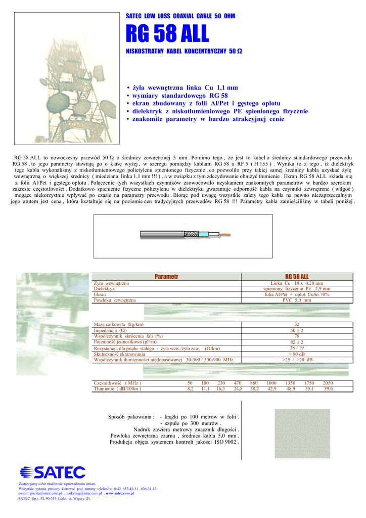 SATEC LOW LOSS COAXIAL CABLE 50 OHM RG 58 ALL NISKOSTRATNY KABEL KONCENTRYCZNY 50 Ω • • • • • żyła wewnętrzna linka Cu 1,1 mm wymiary standardowego RG 58 ekran zbudowany z folii Al/Pet i gęstego oplotu dielektryk z niskotłumieniowego PE spienionego fizycznie znakomite parametry w bardzo atrakcyjnej cenie RG 58 ALL to nowoczesny przewód 50 Ω o średnicy zewnętrznej 5 mm . Pomimo tego , że jest to kabel o średnicy standardowego przewodu RG 58 , to jego parametry stawiają go o klasę wyżej , w szeregu pomiędzy kablami RG 58 a RF 5 ( H 155 ) . Wynika to z tego , iż dielektryk tego kabla wykonaliśmy z niskotłumieniowego polietylenu spienionego fizycznie , co pozwoliło przy takiej samej średnicy kabla uzyskać żyłę wewnętrzną o większej średnicy ( miedziana linka 1,1 mm !!! ) , a w związku z tym zdecydowanie obniżyć tłumienie . Ekran RG 58 ALL składa się z folii Al/Pet i gęstego oplotu . Połączenie tych wszystkich czynników zaowocowało uzyskaniem znakomitych parametrów w bardzo szerokim zakresie częstotliwości . Dodatkowo spienienie fizyczne polietylenu w dielektryku gwarantuje odporność kabla na czynniki zewnętrzne ( wilgoć ) mogące niekorzystnie wpływać po czasie na parametry przewodu . Biorąc pod uwagę wszystkie zalety tego kabla na pewno niezaprzeczalnym jego atutem jest cena , która kształtuje się na poziomie cen tradycyjnych przewodów RG 58 !!! Parametry kabla zamieściliśmy w tabeli poniżej . Parametr RG 58 ALL Żyła wewnętrzna Dielektryk Ekran Powłoka zewnętrzna Linka Cu 19 x 0,20 mm spieniony fizycznie PE 2,9 mm folia Al/Pet + oplot CuSn 70% PVC 5,0 mm Masa całkowita (kg/km) Impedancja () Współczynnik skrócenia fali (%) Pojemność jednostkowa (pF/m) Rezystancja dla prądu stałego - żyła wew./żyła zew. (/km) Skuteczność ekranowania Współczynnik tłumienności niedopasowanej 30-300 / 300-900 MHz Częstotliwość ( MHz ) Tłumienie ( dB/100m ) Sposób pakowania : 50 8,2 100 11,1 230 16,3 32 50 2 78 82 2 38 / 19 > 80 dB >25 / >20 dB 470 24,8 - krążki po 100 metrów w folii . - szpule po 300 metrów . Nadruk zawiera metrowy znacznik długości . Powłoka zewnętrzna czarna , średnica kabla 5,0 mm . Produkcja objęta systemem kontroli jakości ISO 9002 . Zastrzegamy sobie możliwość wprowadzania zmian. Wszystkie pytania prosimy kierować pod numery telefonów 0-42 637-43-31 , 636-31-17 . e-mail: [email protected] , [email protected] , www.satec.com.pl SATEC Sp.j., PL 90-319 Łódź, ul. Wigury 21. 860 38,2 1000 42,9 1350 48,9 1750 55,1 2050 59,6