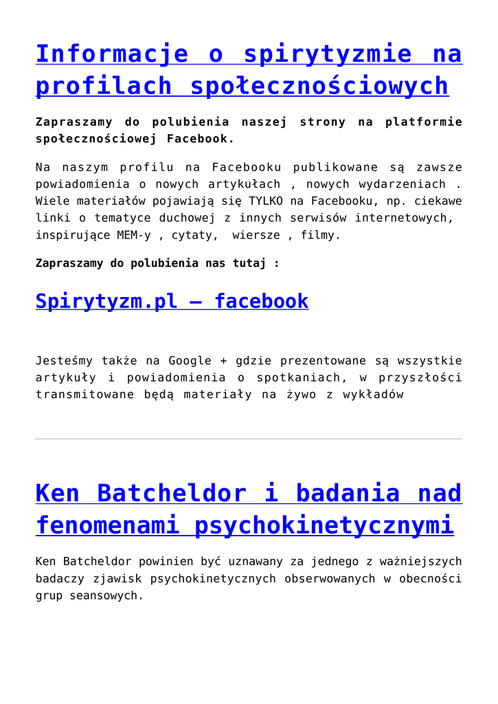 Informacje o spirytyzmie na profilach społecznościowych Zapraszamy do polubienia naszej społecznościowej Facebook. Na naszym profilu na Facebooku powiadomienia o nowych artykułach Wiele materiałów pojawiają się TYLKO linki o tematyce duchowej z innych inspirujące MEM-y , cytaty, wiersze strony na platformie publikowane są zawsze , nowych wydarzeniach . na Facebooku, np. ciekawe serwisów internetowych, , filmy. Zapraszamy do polubienia nas tutaj : Spirytyzm.pl – facebook Jesteśmy także na Google + gdzie prezentowane są wszystkie artykuły i powiadomienia o spotkaniach, w przyszłości transmitowane będą materiały na żywo z wykładów Ken Batcheldor i badania nad fenomenami psychokinetycznymi Ken Batcheldor powinien być uznawany za jednego z ważniejszych badaczy zjawisk psychokinetycznych obserwowanych w obecności grup seansowych. Zafascynowany historiami ery wiktoriańskiej o wirujących stolikach, rozpoczął badania tego fenomenu we własnym domu. Pomimo początkowego sceptycyzmu, Ken szybko uświadomił sobie, że faktycznie możliwe jest uzyskanie efektów, które wykluczają powszechnie znane oddziaływania. Batcheldor był świadomy, że istnieje możliwość samooszukiwania się, wiedział również, jakie są metody fabrykowania zjawisk. Był równie świadomy pojęcia UMA (nieświadomych ruchów mięśni), które polega na tym, że uczestnicy grupy nieświadomie wykonują ruchy i w taki sposób osiągają pozytywny ruch (np. stołu). Ken był wytrwałym, ambitnym badaczem, który chciał zgłębić mechanizmy makro-PK (psychokinetyczne). Ken urodził się 1921 roku. Pracował jako główny psycholog kliniczny dla grupy szpitali w Devonshire. Przeszedł na emeryturę wcześnie, w wieku 55 lat i resztę swojego życia spędził na badaniu i ocenie dowodów zjawisk ruchu i lewitacji stołów w trakcie seansów. Poświęcał dwa, trzy wieczory w miesiącu, by przeprowadzać seanse ruchów stolika razem z kilkoma sąsiadami oraz przyjaciółmi. Jego pomysł odrestaurowania tradycyjnego XIXwiecznego zwyczaju poobiedniego seansu pojawił się spontanicznie na wieczornym spotkaniu towarzyskim w 1964 r. Jeden z gości opowiedział wtedy kilka dobrych opowieści o duchach i wtedy Ken zasugerował, by przeprowadzić seans ze stolikiem, dla zabawy. Na pierwszej sesji nic się nie wydarzyło, lecz po kilku wieczorach zebrani spróbowali ponownie i zostali wynagrodzeni głośnym stukiem. Nie wiedziano jeszcze, czy był to efekt paranormalny czy nie, ale zjawisko zachęciło uczestników do kontynuowania eksperymentów. Na jedenastym spotkaniu (pierwszym przeprowadzonym w całkowitej ciemności) otrzymano efekt uniesienia się stołu nad podłogę bez pomocy konwencjonalnych środków, a wszyscy uczestnicy spotkania potwierdzili to w pisemnym protokole. Typowe fenomeny seansu “stukającego stołu” Po tym sukcesie Ken zdecydował poświęcić resztę swojego życia na badanie zjawisk związanych z ruchem i lewitacją stołów. Próbował dowiedzieć się o najbardziej odpowiednich warunkach, by z sukcesem otrzymywać te raczej niezwykłe fenomeny. Ken stwierdził: „Jest coś takiego w ‘wirujących stolikach’, co umożliwia grupie zwykłych ludzi uzyskanie efektów psychokinetycznych nawet bez podejmowania prób, pod warunkiem że są oni dosyć otwarci. Jeżeli tak jest – w większości przypadków stół zacznie ruszać się z powodu nieświadomej aktywności mięśni. To może stworzyć iluzję, że stół rusza się samodzielnie, ożywiony jakąś mistyczną siłą. Można odnieść wrażenie, że uzyskało się już efekt paranormalny. Wywołany w ten sposób ruch ma dokładnie ten sam wpływ na ciebie, jaki miałby twój rzeczywisty sukces, odsuwa twoje wątpliwości na bok i tworzy silną wiarę… ”Taka wiara, jak mówi Batcheldor, jest bardzo trudna do uzyskania jedynie poprzez przemyślenia. Wzywa ona nas do całkowitego zawieszenia jakiegokolwiek obiektywnego nastawienia, co wprawdzie jest warunkiem sprzyjającym generowaniu zjawisk psychokinetycznych, ale pozostaje sprzeczne z zasadami naukowego eksperymentu. Odkrycia Kena Batcheldora Odkrycia Batcheldora były zarówno natury technicznej jak i psychologicznej. Były owocem wieloletnich prac nad powyższym tematem. Przez kilka lat Ken współpracował blisko z Colinem Brookes-Smith-em, czego efektem było stworzenie „Listy zasad dla uczestników seansów” W eksperymentach używane były stoły połączone z tensometrami i czujnikami ruchu, które dostarczały informacji zwrotnych. Członkowie grupy siedzieli dookoła stoły, podczas gdy aparatura była informacji. wykorzystywana do zbierania obiektywnych W okresie od kwietnia 1964 do grudnia 1965 przeprowadzono ponad 200 sesji, podczas których rzekome paranormalne fenomeny miały miejsce. Kolega Kena, William Chick, brał udział w osiemdziesięciu spotkaniach, z czego podczas siedemdziesięciu dochodziło do zjawisk. Ken opublikował rezultaty badań w kilku gazetach. Jedną z ważniejszych publikacji był artykuł omawiający: Odkrycia techniczne Ken przeprowadzał eksperymenty w warunkach ścisłej kontroli, wkładał wiele wysiłku, by upewnić się, że ruchy (stołu) nie były wynikiem zjawisk konwencjonalnych, jak na przykład UMA (nieświadome skurcze mięśni). Jego pierwsza całkowita lewitacja stołu nastąpiła w całkowitej ciemności, co pozostawiło grupę w pewnej niepewności odnośnie tego, co naprawdę się stało. Wtedy Ken podłączył elektryczne czujniki do każdej nogi stołu i połączył je z małą lampką znajdującą się na górze stołu. Światło zapalało się jedynie w przypadku, gdy wszystkie nogi stołu unosiły się nad podłogą. Zdarzało się, że stół lewitował nad podłogą przez około 20 sekund. Światło dawało także szansę, żeby podczas lewitacji zobaczyć, że ręce wszystkich osób były na wierzchu stołu, a nie pod spodem. Wszystkie późniejsze posiedzenia nagrywano na taśmę, więc z
