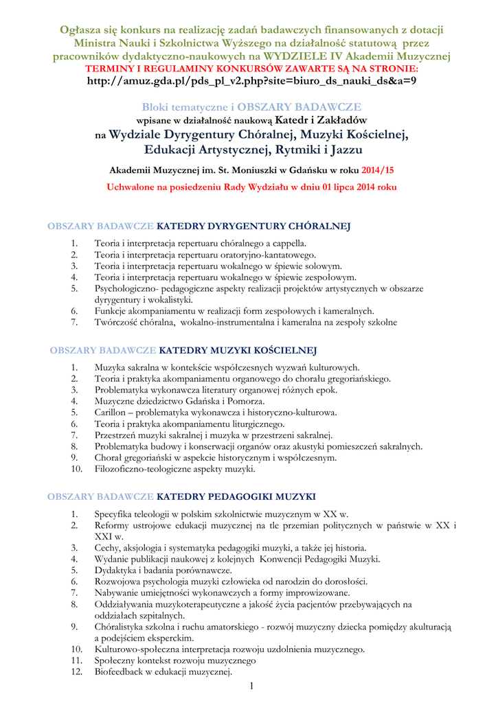 Ogłasza się konkurs na realizację zadań badawczych finansowanych z dotacji Ministra Nauki i Szkolnictwa Wyższego na działalność statutową przez pracowników dydaktyczno-naukowych na WYDZIELE IV Akademii Muzycznej TERMINY I REGULAMINY KONKURSÓW ZAWARTE SĄ NA STRONIE: http://amuz.gda.pl/pds_pl_v2.php?site=biuro_ds_nauki_ds&a=9 Bloki tematyczne i OBSZARY BADAWCZE wpisane w działalność naukową Katedr i Zakładów na Wydziale Dyrygentury Chóralnej, Muzyki Kościelnej, Edukacji Artystycznej, Rytmiki i Jazzu Akademii Muzycznej im. St. Moniuszki w Gdańsku w roku 2014/15 Uchwalone na posiedzeniu Rady Wydziału w dniu 01 lipca 2014 roku OBSZARY BADAWCZE KATEDRY DYRYGENTURY CHÓRALNEJ 1. 2. 3. 4. 5. 6. 7. Teoria i interpretacja repertuaru chóralnego a cappella. Teoria i interpretacja repertuaru oratoryjno-kantatowego. Teoria i interpretacja repertuaru wokalnego w śpiewie solowym. Teoria i interpretacja repertuaru wokalnego w śpiewie zespołowym. Psychologiczno- pedagogiczne aspekty realizacji projektów artystycznych w obszarze dyrygentury i wokalistyki. Funkcje akompaniamentu w realizacji form zespołowych i kameralnych. Twórczość chóralna, wokalno-instrumentalna i kameralna na zespoły szkolne OBSZARY BADAWCZE KATEDRY MUZYKI KOŚCIELNEJ 1. 2. 3. 4. 5. 6. 7. 8. 9. 10. Muzyka sakralna w kontekście współczesnych wyzwań kulturowych. Teoria i praktyka akompaniamentu organowego do chorału gregoriańskiego. Problematyka wykonawcza literatury organowej różnych epok. Muzyczne dziedzictwo Gdańska i Pomorza. Carillon – problematyka wykonawcza i historyczno-kulturowa. Teoria i praktyka akompaniamentu liturgicznego. Przestrzeń muzyki sakralnej i muzyka w przestrzeni sakralnej. Problematyka budowy i konserwacji organów oraz akustyki pomieszczeń sakralnych. Chorał gregoriański w aspekcie historycznym i współczesnym. Filozoficzno-teologiczne aspekty muzyki. OBSZARY BADAWCZE KATEDRY PEDAGOGIKI MUZYKI 1. 2. 3. 4. 5. 6. 7. 8. 9. 10. 11. 12. Specyfika teleologii w polskim szkolnictwie muzycznym w XX w. Reformy ustrojowe edukacji muzycznej na tle przemian politycznych w państwie w XX i XXI w. Cechy, aksjologia i systematyka pedagogiki muzyki, a także jej historia. Wydanie publikacji naukowej z kolejnych Konwencji Pedagogiki Muzyki. Dydaktyka i badania porównawcze. Rozwojowa psychologia muzyki człowieka od narodzin do dorosłości. Nabywanie umiejętności wykonawczych a formy improwizowane. Oddziaływania muzykoterapeutyczne a jakość życia pacjentów przebywających na oddziałach szpitalnych. Chóralistyka szkolna i ruchu amatorskiego - rozwój muzyczny dziecka pomiędzy akulturacją a podejściem eksperckim. Kulturowo-społeczna interpretacja rozwoju uzdolnienia muzycznego. Społeczny kontekst rozwoju muzycznego Biofeedback w edukacji muzycznej. 1 13. 14. Znaczenie rozwoju ruchowego w kształtowaniu gotowości szkolnej dzieci. Analiza, interpretacja i recepcja polskiej twórczości kompozytorskiej. OBSZARY BADAWCZE KATEDRY RYTMIKI I IMPROWIZACJI FORTEPIANOWEJ 1. 2. 3. 4. 5. Rola rytmiki w rozwoju muzycznym człowieka. Teoria i praktyka solfeżu dalcrozowskiego. Dzieło muzyczne a jego interpretacja ruchowa - podstawy teoretyczne, realizacja projektów artystycznych w dziedzinie choreografii muzyki. Znaczenie improwizacji fortepianowej na zajęciach rytmiki Możliwości wykorzystania metody rytmiki w profilaktyce, terapii i rehabilitacji OBSZARY BADAWCZE KATEDRY JAZZU I MUZYKI ESTRADOWEJ 1. 2. 3. 4. 5. 6. 7. 8. 9. 10. 11. 12. 13. Muzyka XX wieku a jazz .Wzajemne wpływy i inspiracje Improwizacja jako element formotwórczy dzieła muzycznego Kompozycja tematów jazzowych, o skondensowanym przebiegu formalnym - AB,ABA, AABA ,AABCA Aranżacja utworów muzyki jazzowej i estradowej na dowolne obsady wokalnoinstrumentalne. Krzysztof Komeda – geniusz polskiego i europejskiego jazzu Miniatury Fryderyka Chopina w twórczym opracowaniu Leszka Kułakowskiego na Trio Jazzowe i Orkiestrę Symfoniczną Motoryka jako nadrzędny element w „Piano Concerto „ L.Kułakowskiego. Frazowanie, faktura, sonoryzm, ostinatowość, swingowanie w kompozycjach na big-band Aspekty działań artystycznych muzyka improwizującego - koncepcje autorskie, techniki improwizatorskie, nowatorskie podejście do funkcji instrumentu w grze solowej i zespołowej Autorskie techniki improwizatorskie w kontekście artystycznej koncepcji jazzowego projektu muzycznego zwieńczonego nagraniem płyty z autorskimi kompozycjami i standardami Funkcje kontrabasu w kameralnych zespołach muzyki jazzowej - trio i sekstecie Znaczenie preparowanych i niekonwencjonalnych instrumentów perkusyjnych w muzyce improwizowanej na podstawie wybranych utworów. "Uniwersalny wymiar tekstów Agnieszki Osieckiej w odniesieniu do stylistyki bossa-novy" OBSZARY BADAWCZE INTERDYSCYPLINARNE – OGÓLNOWYDZIAŁOWE w ramach publikowanego wydziałowego rocznika naukowego SZTUKA| KULTURA | EDUKACJA 1. 2. Publikacja wyników badań dorobku z zakresu szeroko pojętej animacji kultury w jej aspekcie pedagogicznym, wykonawczym i twórczym. Archiwizacja dokonań naukowych i twórczych Wydziału Dyrygentury Chóralnej, Muzyki Kościelnej, Edukacji Artystycznej, Rytmiki i Jazzu. 2