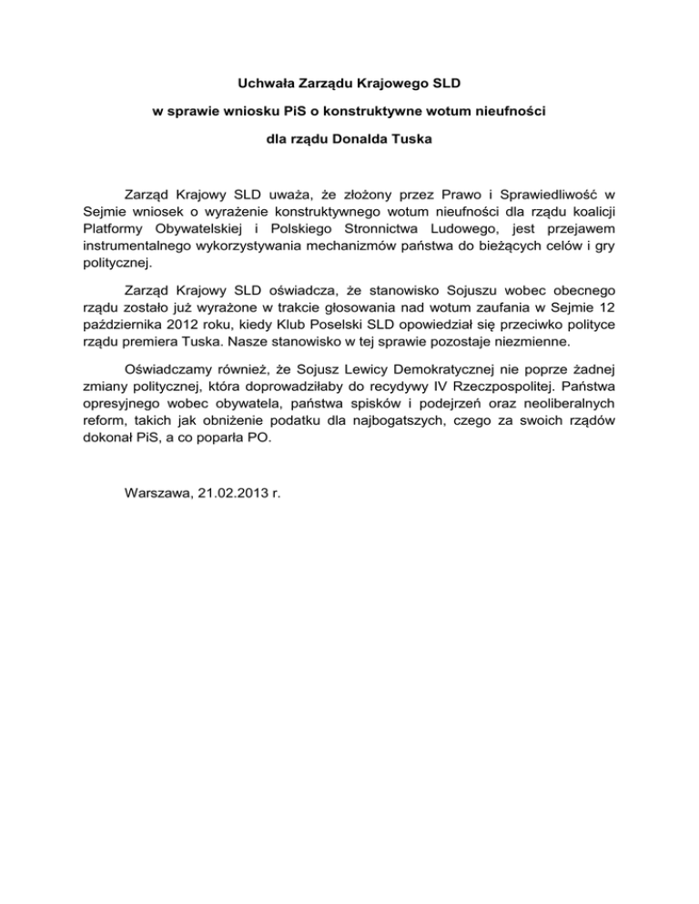 Uchwała Zarządu Krajowego SLD w sprawie wniosku PiS o konstruktywne wotum nieufności dla rządu Donalda Tuska Zarząd Krajowy SLD uważa, że złożony przez Prawo i Sprawiedliwość w Sejmie wniosek o wyrażenie konstruktywnego wotum nieufności dla rządu koalicji Platformy Obywatelskiej i Polskiego Stronnictwa Ludowego, jest przejawem instrumentalnego wykorzystywania mechanizmów państwa do bieżących celów i gry politycznej. Zarząd Krajowy SLD oświadcza, że stanowisko Sojuszu wobec obecnego rządu zostało już wyrażone w trakcie głosowania nad wotum zaufania w Sejmie 12 października 2012 roku, kiedy Klub Poselski SLD opowiedział się przeciwko polityce rządu premiera Tuska. Nasze stanowisko w tej sprawie pozostaje niezmienne. Oświadczamy również, że Sojusz Lewicy Demokratycznej nie poprze żadnej zmiany politycznej, która doprowadziłaby do recydywy IV Rzeczpospolitej. Państwa opresyjnego wobec obywatela, państwa spisków i podejrzeń oraz neoliberalnych reform, takich jak obniżenie podatku dla najbogatszych, czego za swoich rządów dokonał PiS, a co poparła PO. Warszawa, 21.02.2013 r.