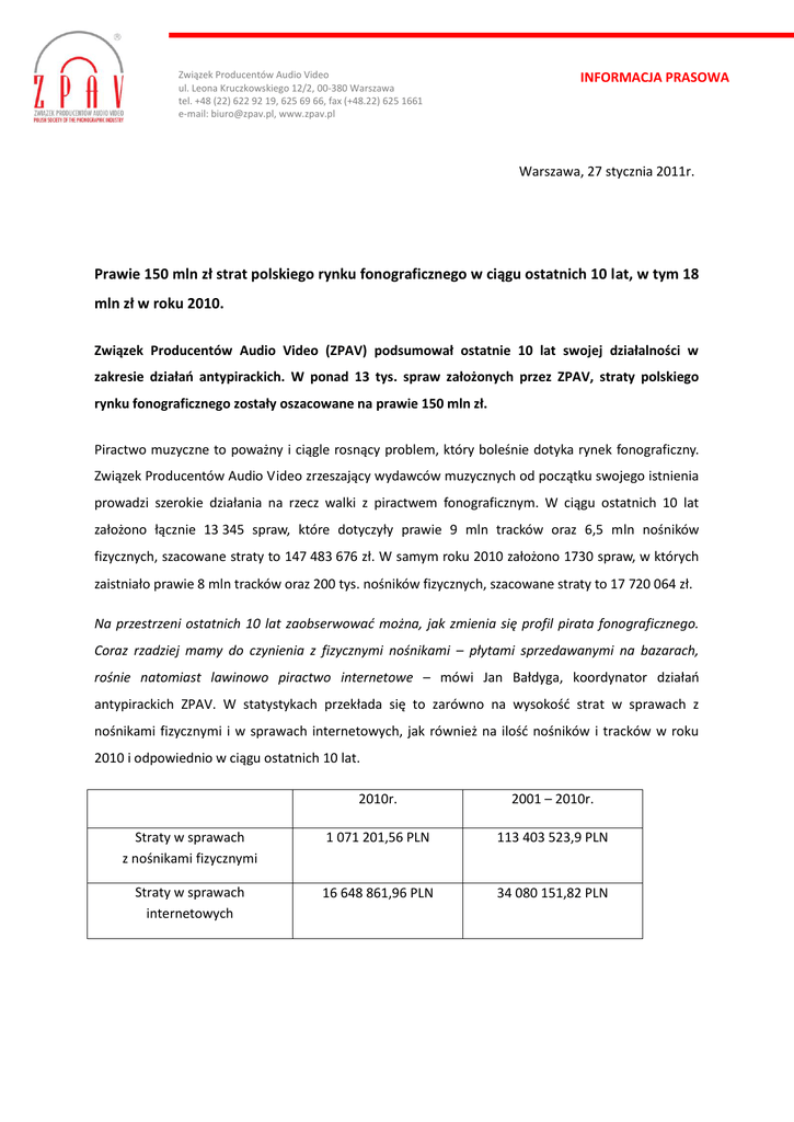 Związek Producentów Audio Video ul. Leona Kruczkowskiego 12/2, 00-380 Warszawa tel. +48 (22) 622 92 19, 625 69 66, fax (+48.22) 625 1661 e-mail: [email protected], www.zpav.pl INFORMACJA PRASOWA Warszawa, 27 stycznia 2011r. Prawie 150 mln zł strat polskiego rynku fonograficznego w ciągu ostatnich 10 lat, w tym 18 mln zł w roku 2010. Związek Producentów Audio Video (ZPAV) podsumował ostatnie 10 lat swojej działalności w zakresie działao antypirackich. W ponad 13 tys. spraw założonych przez ZPAV, straty polskiego rynku fonograficznego zostały oszacowane na prawie 150 mln zł. Piractwo muzyczne to poważny i ciągle rosnący problem, który boleśnie dotyka rynek fonograficzny. Związek Producentów Audio Video zrzeszający wydawców muzycznych od początku swojego istnienia prowadzi szerokie działania na rzecz walki z piractwem fonograficznym. W ciągu ostatnich 10 lat założono łącznie 13 345 spraw, które dotyczyły prawie 9 mln tracków oraz 6,5 mln nośników fizycznych, szacowane straty to 147 483 676 zł. W samym roku 2010 założono 1730 spraw, w których zaistniało prawie 8 mln tracków oraz 200 tys. nośników fizycznych, szacowane straty to 17 720 064 zł. Na przestrzeni ostatnich 10 lat zaobserwowad można, jak zmienia się profil pirata fonograficznego. Coraz rzadziej mamy do czynienia z fizycznymi nośnikami – płytami sprzedawanymi na bazarach, rośnie natomiast lawinowo piractwo internetowe – mówi Jan Bałdyga, koordynator działao antypirackich ZPAV. W statystykach przekłada się to zarówno na wysokośd strat w sprawach z nośnikami fizycznymi i w sprawach internetowych, jak również na ilośd nośników i tracków w roku 2010 i odpowiednio w ciągu ostatnich 10 lat. 2010r. 2001 – 2010r. Straty w sprawach z nośnikami fizycznymi 1 071 201,56 PLN 113 403 523,9 PLN Straty w sprawach internetowych 16 648 861,96 PLN 34 080 151,82 PLN Straty dla rynku fonograficznego są ogromne. I nie jest to tylko strata finansowa, to strata jakościowa. Ile muzyki można wyprodukowad za takie pieniądze, ile wydad płyt, ilu artystów wypromowad? – Dużo. To wszystko jednak przepada bezpowrotnie razem z pieniędzmi, które znikają z rynku. Dlatego skuteczna walka z piractwem muzycznym jest dla nas priorytetem, dochodzenie roszczeo w drodze postępowao cywilnych, jak też karnych będzie konsekwentnie realizowane przez ZPAV– dodaje Jacek Jagłowski, członek zarządu ZPAV. Problem piractwa fonograficznego dotyczy nie tylko Polski, na całym świecie rynek muzyczny przeżywa kryzys, którego główne przyczyny związane są z nielegalnym udostępnianiem muzyki w Internecie. Jak podaje Raport IFPI o Muzyce Cyfrowej 2011 badania przeprowadzone przez Adermon & Liang z uniwersytetu w Uppsali w Szwecji wykazały, że „piractwo jest główną przyczyną spadku sprzedaży nagrao”. Badacze wyliczyli, że gdyby nie piractwo, sprzedaż płyt byłaby większa o 72%, a sprzedaż muzyki cyfrowej - aż o 131%. Straty finansowe przekładają się na kondycję rynku, a zwłaszcza na sytuację debiutantów. W Hiszpanii w 2010 roku odnotowano 22% spadek na rynku nagrao muzycznych, przy czym żaden lokalny artysta nie znalazł się na liście 50 najlepiej sprzedających się albumów. W Meksyku, inwestycje w promocję nowych talentów zostały ograniczone o 69% w stosunku do poziomu z 2005 roku, a liczba lokalnych wydawnictw zmniejszyła się o 45%. W latach 2003-2010 łączna sprzedaż albumów debiutantów, pojawiających się na światowych listach Top 50 spadła o 77% z 47,7 mln do 10,8 mln (od stycznia do listopada). W Polsce, w tym samym czasie liczba debiutanckich albumów w zestawieniach Top 100 (dane ZPAV) zmniejszyła się o 50% (z 8 w 2003 roku do 4 w 2010 roku). Przy czym w 2010r. w zestawieniu TOP 100 nie było ani jednego polskiego debiutanta. Zagrożone są również miejsca pracy w sektorze fonograficznym. W Stanach Zjednoczonych liczba osób zatrudnionych jako muzycy spadła o 17% pomiędzy rokiem 1999 a 2009, przy 53% spadku sprzedaży nagrao. Niezależne badanie przeprowadzone w 2010 roku przez Tera Consultants, uznane przez organizacje związkowe, pokazuje, że jeżeli nie zostaną podjęte radykalne działania przeciwko piractwu, do 2015 roku w przemyśle związanym z działalnością kreatywną pracę może stracid 1,2 miliony ludzi. Szerzej o raporcie w załączniku. Pełna wersja raportu dostępna jest w języku angielskim na stronie: http://zpav.pl/pliki/aktualnosci/IFPI_Digital_Music_Report_2011.pdf **** Związek Producentów Audio Video jest stowarzyszeniem producentów fonogramów i wideogramów. ZPAV powstał w 1991 roku z inicjatywy osób z branży muzycznej, przede wszystkim w celu reprezentowania interesów legalnych producentów w obliczu piractwa fonograficznego, które na początku lat 90. sięgało 95 proc. ZPAV, posiadając zezwolenie Ministerstwa Kultury i Dziedzictwa Narodowego, chroni praktycznie wszystkich producentów nagrao funkcjonujących na polskim rynku. ZPAV jest polską Grupą Krajową Międzynarodowej Federacji Przemysłu Fonograficznego (IFPI), która zrzesza i reprezentuje światowy przemysł muzyczny (ponad 1400 firm w 66 krajach). **** Więcej informacji: Katarzyna Kowalewska QL CITY Agencja Komunikacji Marketingowej tel. +48 781 268 180 [email protected] Zofia Skubikowska Związek Producentów Audio Video tel.: 22 625 47 54 [email protected]