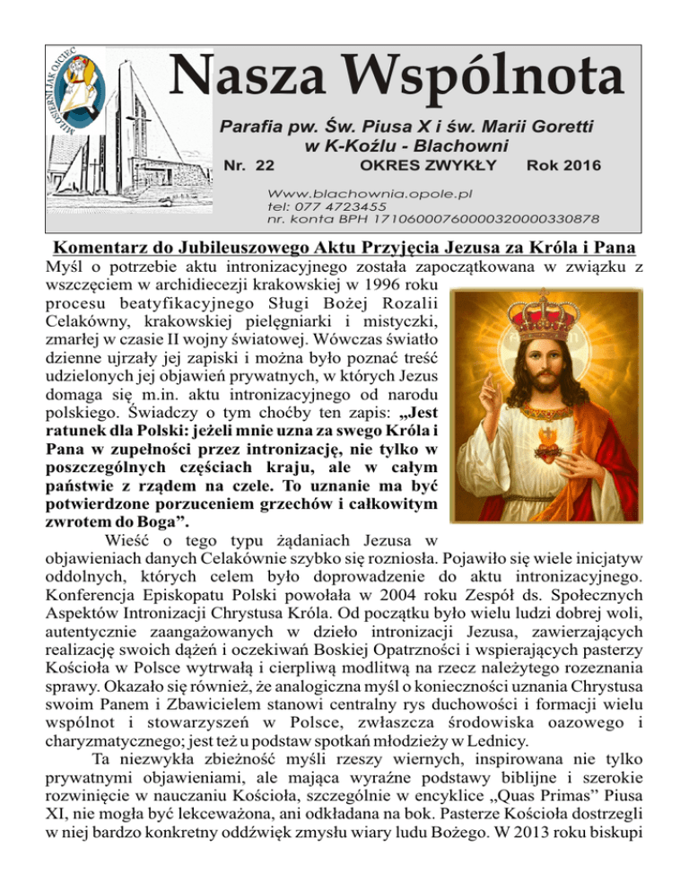Nasza Wspólnota Parafia pw. Św. Piusa X i św. Marii Goretti w K-Koźlu - Blachowni Nr. 22 OKRES ZWYKŁY Rok 2016 Www.blachownia.opole.pl tel: 077 4723455 nr. konta BPH 17106000760000320000330878 Komentarz do Jubileuszowego Aktu Przyjęcia Jezusa za Króla i Pana Myśl o potrzebie aktu intronizacyjnego została zapoczątkowana w związku z wszczęciem w archidiecezji krakowskiej w 1996 roku procesu beatyfikacyjnego Sługi Bożej Rozalii Celakówny, krakowskiej pielęgniarki i mistyczki, zmarłej w czasie II wojny światowej. Wówczas światło dzienne ujrzały jej zapiski i można było poznać treść udzielonych jej objawień prywatnych, w których Jezus domaga się m.in. aktu intronizacyjnego od narodu polskiego. Świadczy o tym choćby ten zapis: „Jest ratunek dla Polski: jeżeli mnie uzna za swego Króla i Pana w zupełności przez intronizację, nie tylko w poszczególnych częściach kraju, ale w całym państwie z rządem na czele. To uznanie ma być potwierdzone porzuceniem grzechów i całkowitym zwrotem do Boga”. Wieść o tego typu żądaniach Jezusa w objawieniach danych Celakównie szybko się rozniosła. Pojawiło się wiele inicjatyw oddolnych, których celem było doprowadzenie do aktu intronizacyjnego. Konferencja Episkopatu Polski powołała w 2004 roku Zespół ds. Społecznych Aspektów Intronizacji Chrystusa Króla. Od początku było wielu ludzi dobrej woli, autentycznie zaangażowanych w dzieło intronizacji Jezusa, zawierzających realizację swoich dążeń i oczekiwań Boskiej Opatrzności i wspierających pasterzy Kościoła w Polsce wytrwałą i cierpliwą modlitwą na rzecz należytego rozeznania sprawy. Okazało się również, że analogiczna myśl o konieczności uznania Chrystusa swoim Panem i Zbawicielem stanowi centralny rys duchowości i formacji wielu wspólnot i stowarzyszeń w Polsce, zwłaszcza środowiska oazowego i charyzmatycznego; jest też u podstaw spotkań młodzieży w Lednicy. Ta niezwykła zbieżność myśli rzeszy wiernych, inspirowana nie tylko prywatnymi objawieniami, ale mająca wyraźne podstawy biblijne i szerokie rozwinięcie w nauczaniu Kościoła, szczególnie w encyklice „Quas Primas” Piusa XI, nie mogła być lekceważona, ani odkładana na bok. Pasterze Kościoła dostrzegli w niej bardzo konkretny oddźwięk zmysłu wiary ludu Bożego. W 2013 roku biskupi Intencje mszalne od 14-27.11.2016 PONIEDZIAŁEK 14.11.2016 7.30 - I Za + Józefa Warzecha (gr) II Za + Anelizę Wawrzynek (p) ----------------------------------------------------------------------------------------------------------WTOREK 15.11.2016 św. Alberta Wielkiego biskupa i doktora Kościoła 7.30 - I Za + Józefa Warzecha (gr) II Za ++ rodz. Franciszka i Franciszkę Warzecha ++ 3 braci ++ krewnych ++ z rodziny Szulc, Warner, Spillner ++ kapłanów. 18.00 - Msza św. i Nowenna do MBNP 1. W int. dobrodziejów, ofiarodawców naszej Parafii 2. Przez wstawiennictwo MBNP dziękując za otrzymane łaski prosząc o dalsze błog. Boże, zdrowie i opiekę w rodzinie w p. int. 3. Przez wstawiennictwo MBNP dziękując za otrzymane łaski prosząc o dalsze błog. Boże, zdrowie i opiekę w int. Emilii Sałaciak z ok. ur. od Caritasu. 4. Za + mamę Michalinę Jamka w 4 rocz. śmierci ++ ojców Mariana Jamka i Feliksa Świtała ++ z rodziny Jamka i Świtała o radość nieba. 5. Za ++ rodziców Marię i Ryszarda Magiera ++ Jadwigę i Maksymiliana Rzeźniczek ++ siostry, + brata ++ z pokr. --------------------------------------------------------------------------------------------------ŚRODA 16.11.2016 7.30 - I Za + Józefa Warzecha (gr) II Za + Antoniego Sęga (p) ------------------------------------------------------------------------------------------------CZWARTEK 17.11.2016 św. Elżbiety Węgierskiej 18.00 - I Za + Józefa Warzecha (gr) II Za ++ rodz. Walerię i Antoniego Czernik + chrześniaka Jarosława Ciapę ++ z pokr. 19.00 - Nauka przedchrzcielna ---------------------------------------------------------------------------------------------------PIĄTEK 18.11.2016 bł. Karoliny Kózkówny 7.30 - Za + Józefa Warzecha (gr) 17.00 - Msza św. szkolna. I Za + syna, ojca Karola + żonę, matkę Krystynę + Erykę Szala. II Za +rodziców Barbarę i Jana Czemerys +babcię Marię Czemerys + chrzestną Annę ++ z rodziny. 18.00 Pogorzelec - w kościele ojców Oblatów na Pogorzelcu odbędzie się Jubileusz Młodych. Zostanie odprawiona Msza św. Nabożeństwo Uwielbienia z obrzędem Effata. Naszą młodzież ponadgimnazjalną i starszą zapraszamy do pielgrzymowania do kościoła jubileuszowego w naszym mieście na Pogorzelcu. ---------------------------------------------------------------------------------------------------SOBOTA 19.11.2016 7.30 - I Za + Józefa Warzecha (gr) II Przez wstawiennictwo MBNP dziękując za otrzymane łaski prosząc o dalsze błog. Boże, zdrowie i opiekę w int. katechetki Elżbiety Bassy z ok. urodzin i imienin. 17.00 - Adoracja Najśw. Sakramentu i okazja do sakramentu pokuty i pojednania 18.00 - W int. Parafian na zakończenie Jubileuszu Roku Miłosierdzia ---------------------------------------------------------------------------------------------------- NIEDZIELA UROCZYSTOŚĆ JEZUSA CHRYSTUSA KRÓLA WSZECHŚWIATA - 20.11.2016 7.30 - Do Bożej Op. i przez wstawiennictwo MBNP dziękując za otrzymane łaski prosząc o dalsze błog. Boże, zdrowie i opiekę w int. rodziny Drzymała. 10.00 - I Za ++ Rozwitę i Pawła Habiciak ++ Zygfryda, Konstantynę, Annę i Józefa Mrozek ++ z pokr. Glomb, Mrozek i Habiciak ++ Jana i Martę Lewicki. II Przez wstawiennictwo MBNP dziękując za otrzymane łaski prosząc o dalsze błog. Boże, zdrowie i opiekę i Dary Ducha św. w int. Joanny z ok. urodzin. 11.30 - I Przez wstawiennictwo MBNP dziękując za otrzymane łaski prosząc o dalsze błog. Boże, zdrowie i opiekę w int. Emilii Sałaciak z ok. 80 rocz. urodzin. II W int. Parafian. Chrzty: Tomasz Zembski 12.30 - Przez wstawiennictwo MBNP dzięk
