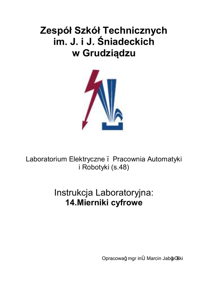 Zespół Szkół Technicznych im. J. i J. Śniadeckich w Grudziądzu Laboratorium Elektryczne – Pracownia Automatyki i Robotyki (s.48) Instrukcja Laboratoryjna: 14.Mierniki cyfrowe Opracował: mgr inż. Marcin Jabłoński Cel ćwiczenia Celem ćwiczenia jest poznanie zasady działania i obsługi wybranych mierników cyfrowych. Program ćwiczenia 1. Podstawy teoretyczne 1.1. Wstęp 1.2. Pomiar częstotliwości i czasu 1.3. Pomiar napięcia stałego 1.4. Pomiar napięcia zmiennego 1.5. Pomiar prądu stałego i zmiennego 1.6. Pomiar rezystancji 1.7. Błędy mierników cyfrowych 2. Wykonanie pomiarów 2.1. Multimetr cyfrowy 2.1.1. Przygotowanie przyrządu do pracy 2.1.2. Pomiar napięcia stałego 2.1.3. Pomiar prądu stałego 2.1.4. Pomiar wartości średniej napięcia zmiennego 2.1.5. Pomiar współczynnika kształtu prądu zmiennego 2.1.6. Pomiar rezystancji 2.2. Częstościomierz cyfrowy 2.2.1. Sprawdzenie przyrządu 2.2.2. Pomiar częstotliwości 2.2.3. Wykorzystanie częstościomierza jako źródła częstotliwości wzorcowych 3. Uwagi i wnioski 2 1.1. Wstęp Miernikiem elektronicznym nazywa się taki układ pomiarowy, w którym sygnał wejściowy zawierający informację o wielkości mierzonej zostaje zamieniony na sygnał elektryczny podlegający procesowi obróbki w układach elektronicznych, a następnie przetworzony na wartość liczbową wielkości mierzonej. Wyróżniamy dwa rodzaje elektronicznych przyrządów pomiarowych: analogowe i cyfrowe. W przyrządach analogowych elementem wskazującym jest najczęściej klasyczny miernik wskazówkowy (np. mikroamperomierz magnetoelektryczny) wyskalowany w jednostkach wielkości mierzonej. Mierniki cyfrowe pozwalają na bezpośredni odczyt wartości wielkości mierzonej ze wskaźnika cyfrowego lub z rejestratorów (np. drukarki), dzięki czemu unika się błędu popełnianego przy odczycie wskazań. Główną zaletą mierników cyfrowych jest ich duża dokładność. Ponadto mają one w porównaniu z przyrządami analogowymi następujące zalety: dużą szybkość pomiarów, automatyczny wybór polaryzacji, możliwość automatycznego wyboru zakresu, łatwość rejestracji czy „zapamiętywania” wyników pomiarów oraz możliwość współpracy z komputerowymi systemami pomiarowo-kontrolnymi i sterującymi. Cyfrowe metody pomiarowe mogą być zastosowane do pomiaru niemal wszystkich wielkości fizycznych zarówno elektrycznych, jak i nieelektrycznych, dyskretnych (ziarnistych) i ciągłych. Jeżeli mierzona wielkość fizyczna ma charakter ciągły, to w przyrządzie musi być dokonane tzw. przetwarzanie analogowo-cyfrowe, czyli zamiana wielkości ciągłej na dyskretną. W wyniku tej zamiany otrzymuje się proporcjonalna do wielkości mierzonej, liczbę impulsów elektrycznych zliczana przez licznik i prezentowana na wskaźniku cyfrowym lub drukarce. Ze względu na stosowaną metodę przetwarzania rozróżniamy przyrządy cyfrowe z miarą czasu lub miarą napięcia. W pierwszej z wymienionych grup jednostkę czasu wyznacza okres drgań generatora wzorcowego, w drugiej zaś jednostkę napięcia zmieniające się skokowo napięcie wyjściowe specjalnego typu generatora napięcia. Przedmiotem dalszych rozważań są mierniki cyfrowe wykorzystujące przetwarzanie A/C z miarą czasu. Podstawowym pomiarem w tej klasie przyrządów jest pomiar częstotliwości (lub czasu). Wynika stąd podział miernika cyfrowego na dwie zasadnicze części. W pierwszej – mierzona wartość jest transformowana na częstotliwość lub czas, w drugiej – czas lub częstotliwość są mierzone metodą zliczania impulsów. 1.2. Pomiar częstotliwości i czasu Cyfrowy pomiar częstotliwości opiera się na metodzie zliczania impulsów uformowanych z przebiegu okresowego o częstotliwości fx w ściśle określonym wzorcowym przedziale czasu Tp. Schemat blokowy częstościomierza wykorzystującego powyższą metodę przedstawiono na rys.1. Cykl pracy układu jest następujący. Układ sterujący powoduje zerowanie licznika (skasowanie poprzedniego stanu) po czym otwiera bramkę na czas Tp określony przez aktualnie wybrany przełącznikiem P zakres pomiarowy. Źródłem częstotliwości wzorcowych jest generator kwarcowy wraz z dzielnikiem częstotliwości. Impulsy o częstotliwości mierzonej fx przekazywane są na czas otwarcia bramki elektronicznej (Tp) do licznika, gdzie są zliczane. Liczba zliczonych impulsów n w czasie Tp jest proporcjonalna do częstotliwości mierzonej: n fx = (1) Tp 3 Rys.1. Schemat blokowy częstościomierza cyfrowego. Błąd względny pomiaru częstotliwości omawianą metodą wyraża się wzorem: Df x Dn DTp = + (2) fx n Tp w którym: Dn - błąd względny zliczania, n DTp - błąd względny odmierzania wzorcowego przedziału czasowego Tp Uwzględniając, że dla liczników cyfrowych błąd bezwzględny odczytu równy jest ± 1 cyfra (Dn=1) oraz, że Tp jest odwrotnie proporcjonalny do częstotliwości generatora wzorcowego (fw) otrzymuje się z zależności (2) wzór: Df Df x 1 Df w 1 = + = + w (3) fx n fw f x Tp fw Ze wzoru (3) wynika, że przy pomiarze małych częstotliwości należy stosować zwiększony czas pomiaru Tp. I tak przykładowo przy pomiarze częstotliwości fx=1kHz – w celu zapewnienia błędu względnego zliczania równego 0,1% - należy dobrać Tp=1s, zaś dla fx=100Hz – Tp=10s. Z punktu widzenia użytkownika częstościomierza cyfrowego istotne są następujące parametry techniczne: rezystancja wejściowa, pasmo przenoszenia oraz minimalny sygnał wejściowy zapewniający poprawną pracę przyrządu. Cyfrowy pomiar czasu odbywa się na zasadzie pomiaru liczby impulsów generatora wzorcowego o znanym okresie Tw. Schemat blokowy czasomierza cyfrowego oraz przebiegi czasowe podano na rys.2. Impulsy elektryczne ograniczające odstęp mierzonego czasu Dt podawane są na wejścia układów formujących I i II. Mogą być one wytworzone automatycznie przez układ, w którym odstęp czasu mierzymy, bądź też 